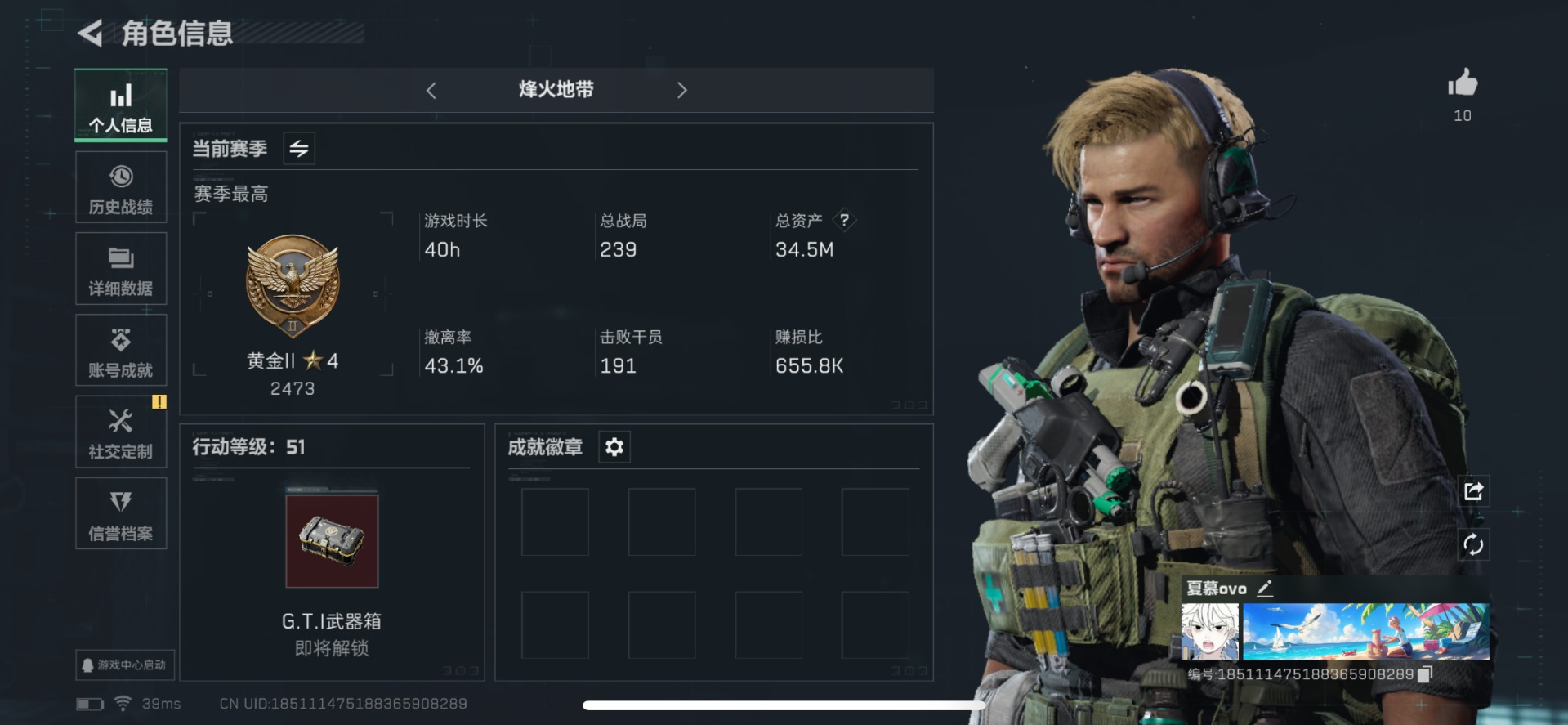 [11294935]可二次 可修改实名 实名:可修改 烽火地带段位:黄金 全面战场段位:上等兵 高级安全箱(2×3)9.15号到期 总资产:34.5 哈夫币:4.027 传说武器皮肤:复合弓-黑-天际线 史诗武器皮肤:M700狙击步枪-竞技风