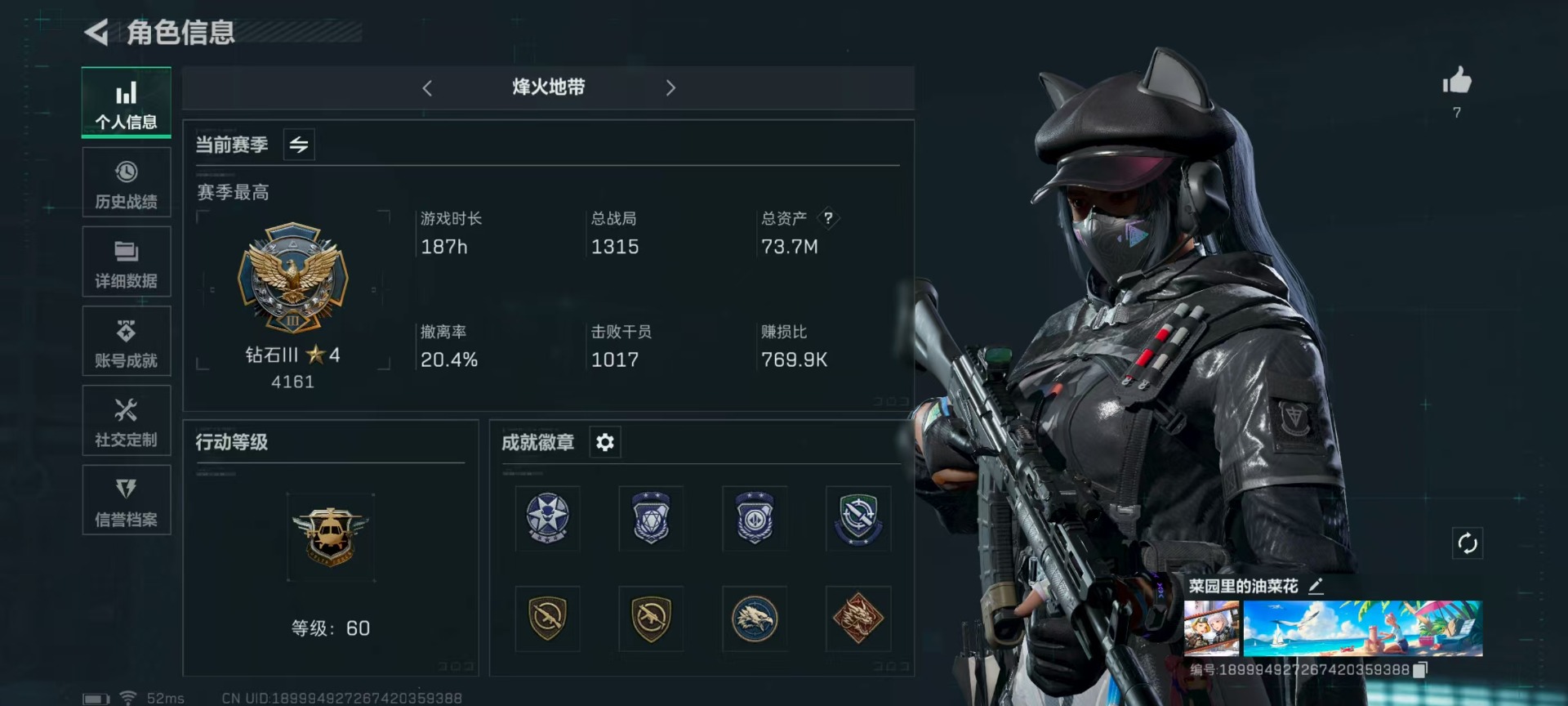 [11290097]总资产:73.7M 1干员外观 1近战传说 11传说枪械 哈夫币:40.004K 可二次 可修改实名 安全保护中 优质装备:近战-北极星 烽火地带段位:钻石 全面战场段位:无段位 传说武器皮肤:M4A1突击步枪-阿米娅,CAR-15突击步枪-阿米娅,复合弓-黑-天际线,QCQ171冲锋枪-北极星,AK-12突击步枪-特斯拉线圈,SR-3M紧凑突击步枪-特斯拉线圈,UZI冲锋枪-特斯拉线圈,勇士冲锋枪-能天使-午夜邮差,725双管霰弹枪-送葬人-无题密令,K437突击步枪-北极星 史诗武器皮肤:M16A4突击步枪-竞赛选手,PKM通用机枪-荒野求生,勇士冲锋枪-深海恐惧,AKM突击步枪-林中猎手,SR-3M紧凑突击步枪-荒野求生,M1014霰弹枪-林中猎手,SV-98狙击步枪-林中猎手,PTR-32突击步枪-英雄,SVD狙击步枪-荒野求生,M250通用机枪-囚徒,SV-98狙击步枪-囚徒,腾龙突击步枪-无垢,MP7冲锋枪-无垢,PSG-1射手步枪-无垢,K416突击步枪-竞技风,AS Val突击步枪-刀锋 干员外观:露娜-黑·天际线