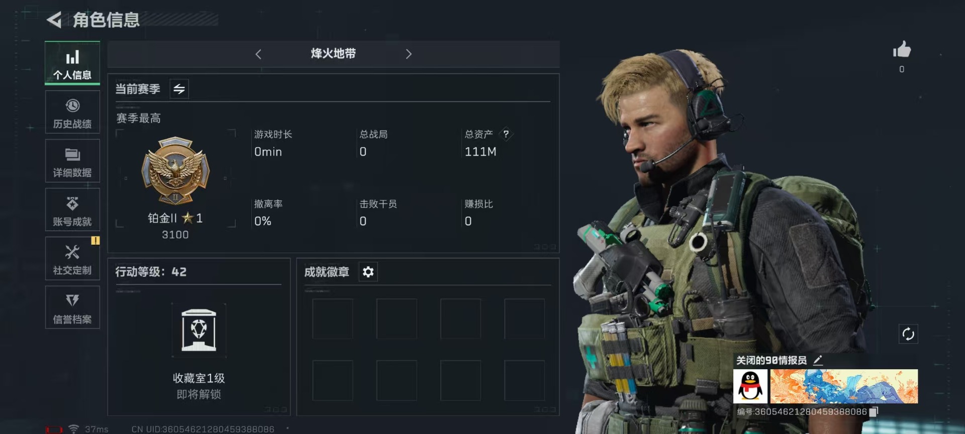 [11296665]总资产:111M 哈夫币:94.982K 可二次 可修改实名 烽火地带段位:铂金 全面战场段位:无段位