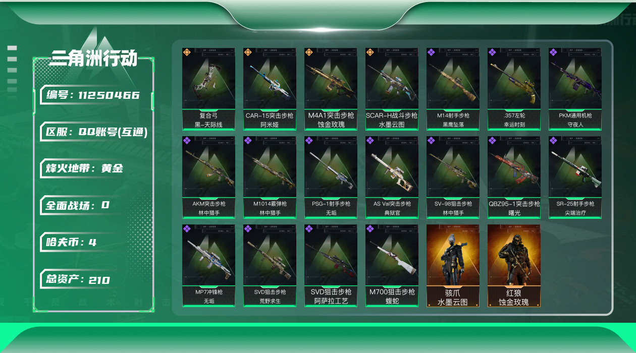 [11250466]可二次 可修改实名 实名:可修改 高级安全箱(9.17到期) 烽火地带段位:黄金 全面战场段位:列兵 总资产:210.3 哈夫币:4.004 传说武器皮肤:SCAR-H战斗步枪-水墨云图,复合弓-黑-天际线,CAR-15突击步枪-阿米娅,M4A1突击步枪-蚀金玫瑰 史诗武器皮肤:M700狙击步枪-蝮蛇,SR-25射手步枪-尖端治疗,AKM突击步枪-林中猎手,.357左轮-幸运时刻,PKM通用机枪-守夜人,SVD狙击步枪-荒野求生,M1014霰弹枪-林中猎手,SV-98狙击步枪-林中猎手,PSG-1射手步枪-无垢,AS Val突击步枪-典狱官,MP7冲锋枪-无垢,QBZ95-1突击步枪-曙光,SVD狙击步枪-阿萨拉工艺,M14射手步枪-黑鹰坠落 干员外观:红狼-蚀金玫瑰,骇爪-水墨云图