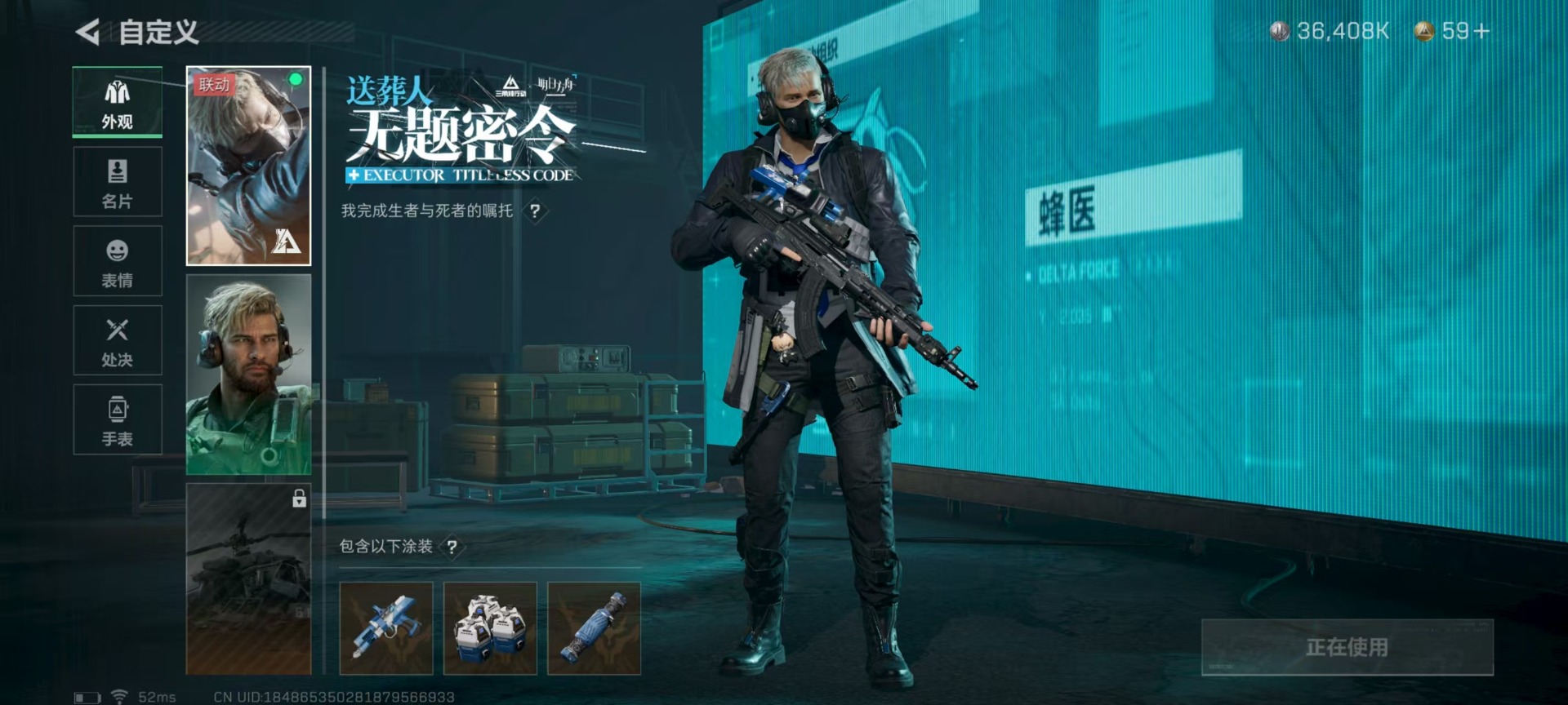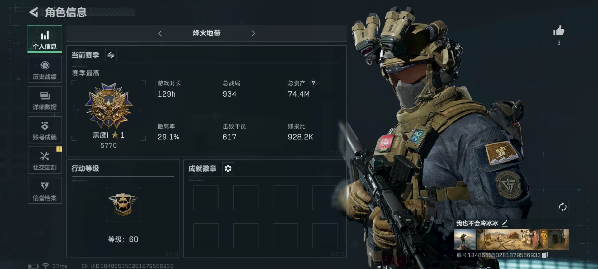 [11296735]总资产:74.4 1干员外观 6传说枪械 顶级安全箱(9.17到期) 可二次 可修改实名 烽火地带段位:黑鹰 全面战场段位:无段位 哈夫币:36.408 传说武器皮肤:SR-3M紧凑突击步枪-特斯拉线圈,AK-12突击步枪-特斯拉线圈,复合弓-黑-天际线,CAR-15突击步枪-阿米娅,725双管霰弹枪-送葬人-无题密令,UZI冲锋枪-特斯拉线圈 史诗武器皮肤:PKM通用机枪-荒野求生,SG552突击步枪-深海恐惧,AKM突击步枪-林中猎手,SVD狙击步枪-暗夜猎手,M16A4突击步枪-竞赛选手,SVD狙击步枪-荒野求生,M1014霰弹枪-林中猎手,PSG-1射手步枪-无垢,AS Val突击步枪-典狱官,SV-98狙击步枪-囚徒,SCAR-H战斗步枪-囚徒,腾龙突击步枪-无垢,MP7冲锋枪-无垢 干员外观:蜂医-送葬人·无题密令(S5)
