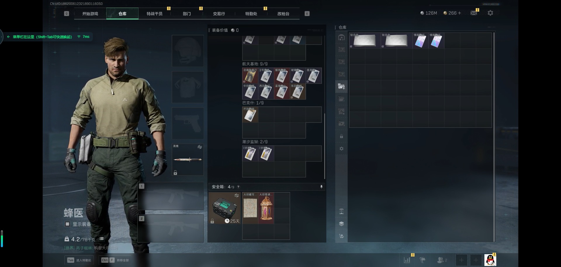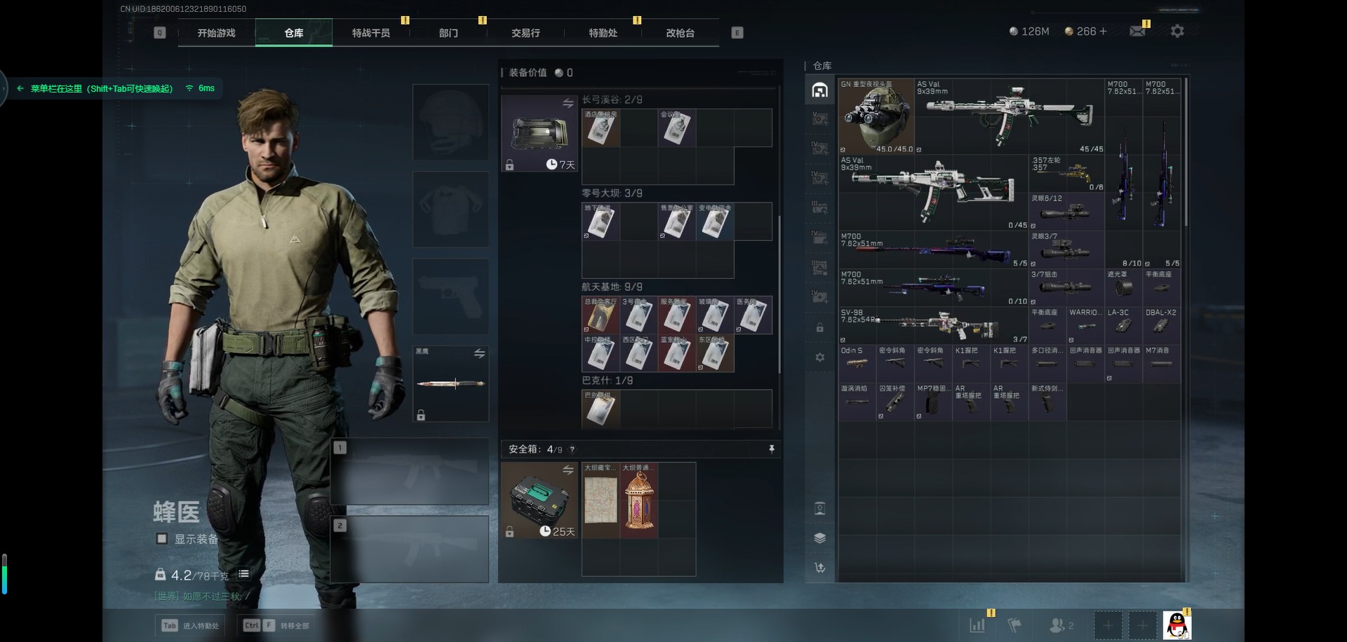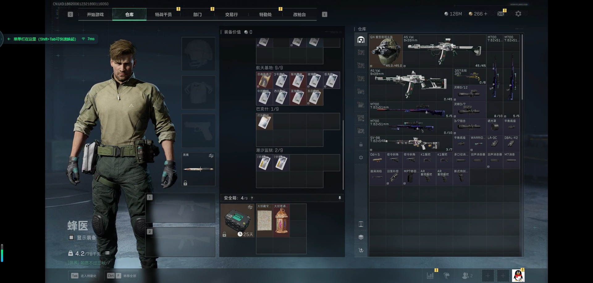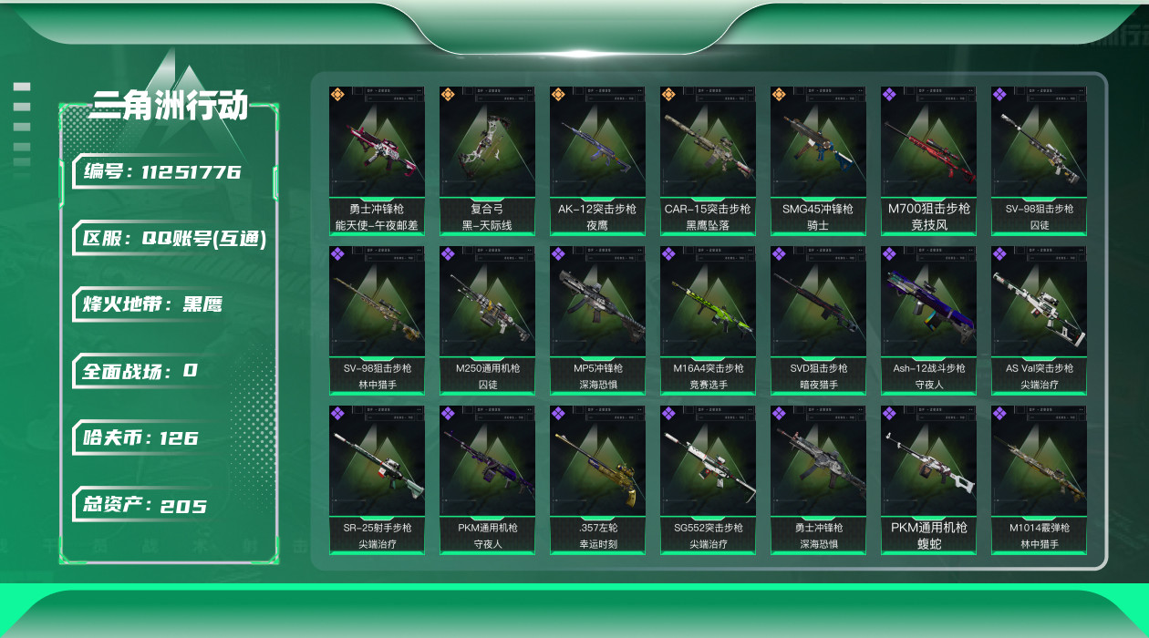 [11251776]总资产:205.7M 2干员外观 5传说枪械 哈夫币:126K 顶级安全箱(9.17到期) 可二次 可修改实名 优质装备:顶级安全箱(3x3),非洲之心 烽火地带段位:黑鹰 全面战场段位:上等兵 传说武器皮肤:AK-12突击步枪-夜鹰,SMG45冲锋枪-骑士,复合弓-黑-天际线,勇士冲锋枪-能天使-午夜邮差,CAR-15突击步枪-黑鹰坠落 史诗武器皮肤:PKM通用机枪-蝮蛇,G3战斗步枪-战场英杰,SR-25射手步枪-尖端治疗,AS Val突击步枪-尖端治疗,SG552突击步枪-尖端治疗,Ash-12战斗步枪-守夜人,MP5冲锋枪-深海恐惧,勇士冲锋枪-深海恐惧,AKM突击步枪-林中猎手,.357左轮-幸运时刻,SVD狙击步枪-暗夜猎手,M16A4突击步枪-竞赛选手,PKM通用机枪-守夜人,M1014霰弹枪-林中猎手,SV-98狙击步枪-林中猎手,M250通用机枪-囚徒,SV-98狙击步枪-囚徒,QBZ95-1突击步枪-曙光,Vector冲锋枪-阿萨拉文明,SVD狙击步枪-阿萨拉工艺,S12K霰弹枪-曙光,PKM通用机枪-英雄,M700狙击步枪-竞技风 干员外观:无名-夜鹰,露娜-黑·天际线