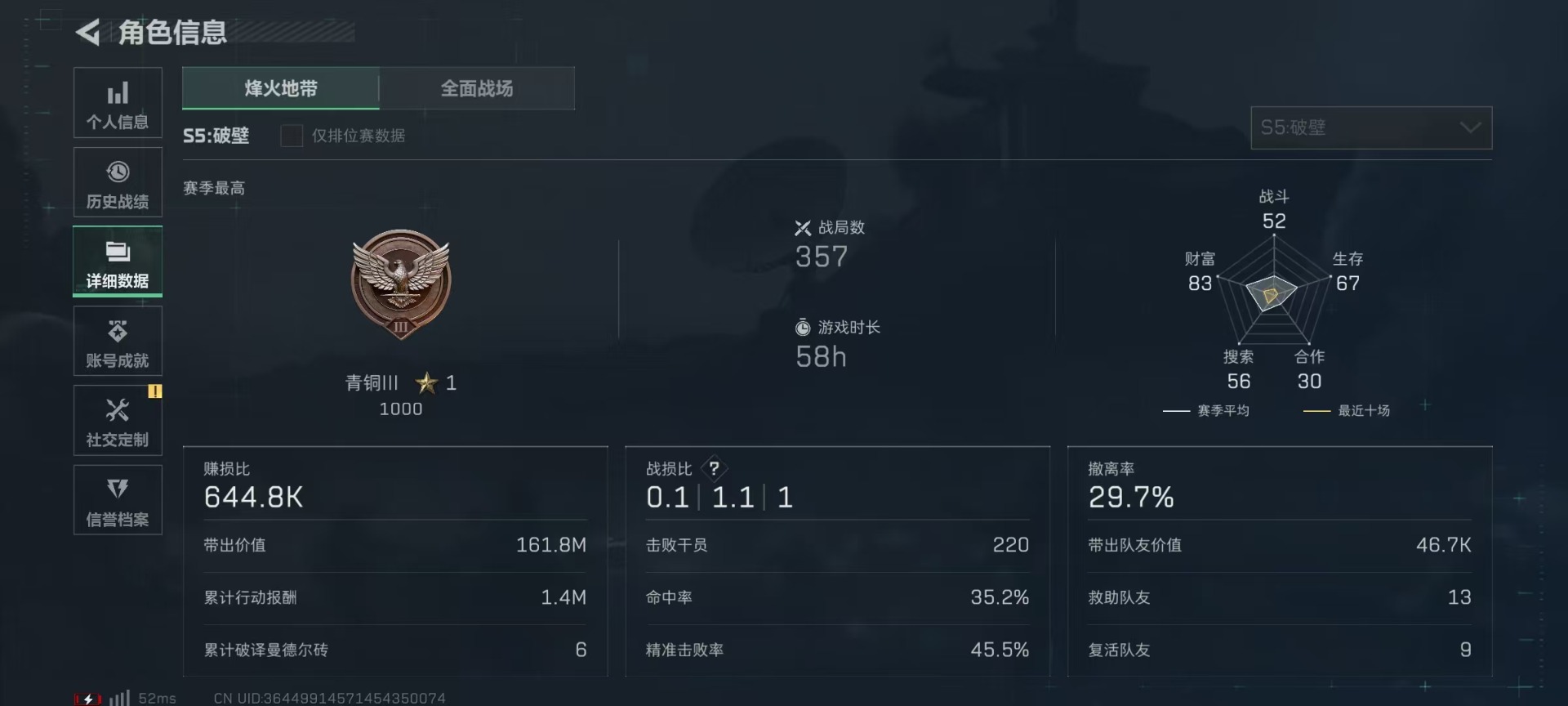 [11253066]总资产:153.7M 2传说枪械 哈夫币:125K 可二次 可修改实名 优质装备:顶级安全箱(3x3) 烽火地带段位:青铜 全面战场段位:无段位 传说武器皮肤:CAR-15突击步枪-阿米娅,勇士冲锋枪-能天使-午夜邮差 史诗武器皮肤:AUG突击步枪-蝮蛇,勇士冲锋枪-深海恐惧,AKM突击步枪-林中猎手,M1014霰弹枪-林中猎手,SV-98狙击步枪-林中猎手,Vector冲锋枪-阿萨拉文明