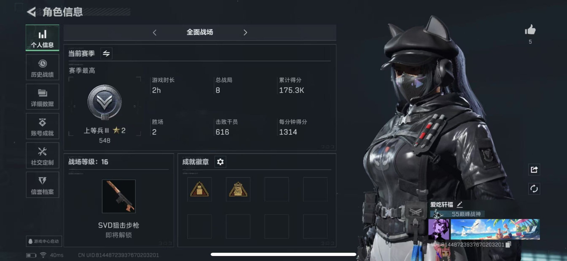 [11296317]可二次 可修改实名 实名:可修改 烽火地带段位:三角洲巅峰 全面战场段位:上等兵 顶级安全箱(3×3)9.15号到期 总资产:142.7 哈夫币:27.836 传说武器皮肤:复合弓-黑-天际线,CAR-15突击步枪-阿米娅,725双管霰弹枪-送葬人-无题密令 史诗武器皮肤:M700狙击步枪-蝮蛇,PKM通用机枪-荒野求生,MP5冲锋枪-深海恐惧,SR-3M紧凑突击步枪-荒野求生,SG552突击步枪-深海恐惧,AKM突击步枪-林中猎手,M16A4突击步枪-竞赛选手,SVD狙击步枪-荒野求生,M1014霰弹枪-林中猎手,SV-98狙击步枪-林中猎手,PSG-1射手步枪-无垢,AS Val突击步枪-典狱官,M250通用机枪-囚徒,MP7冲锋枪-无垢,QBZ95-1突击步枪-曙光 干员外观:露娜-黑·天际线
