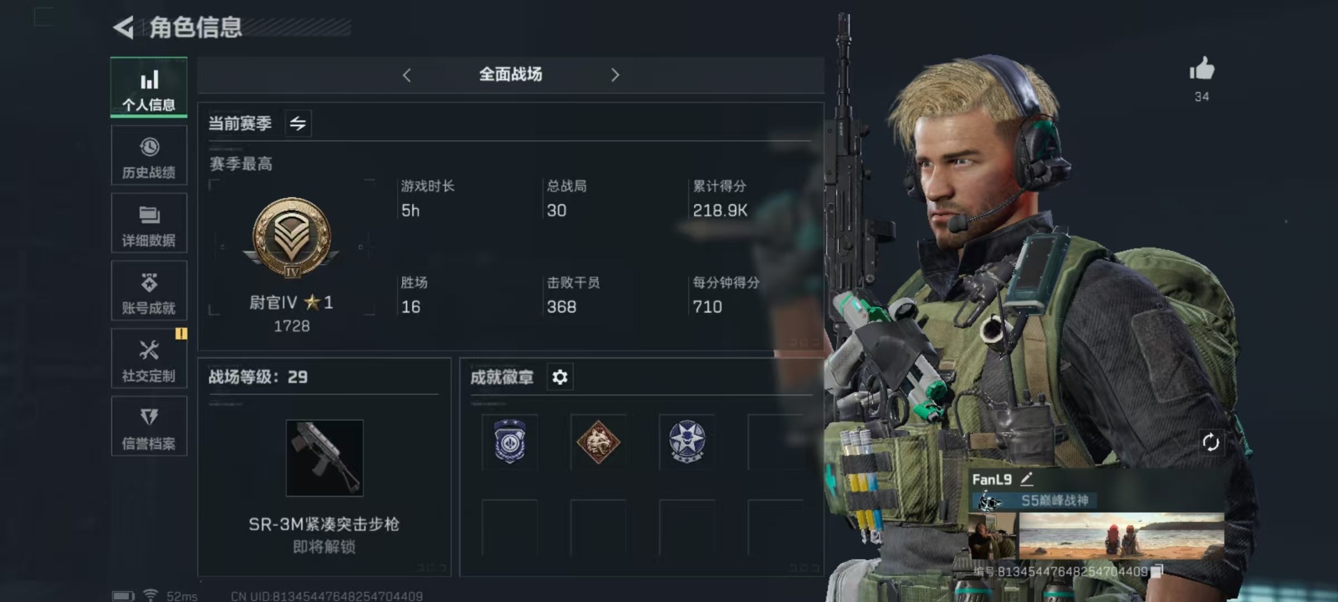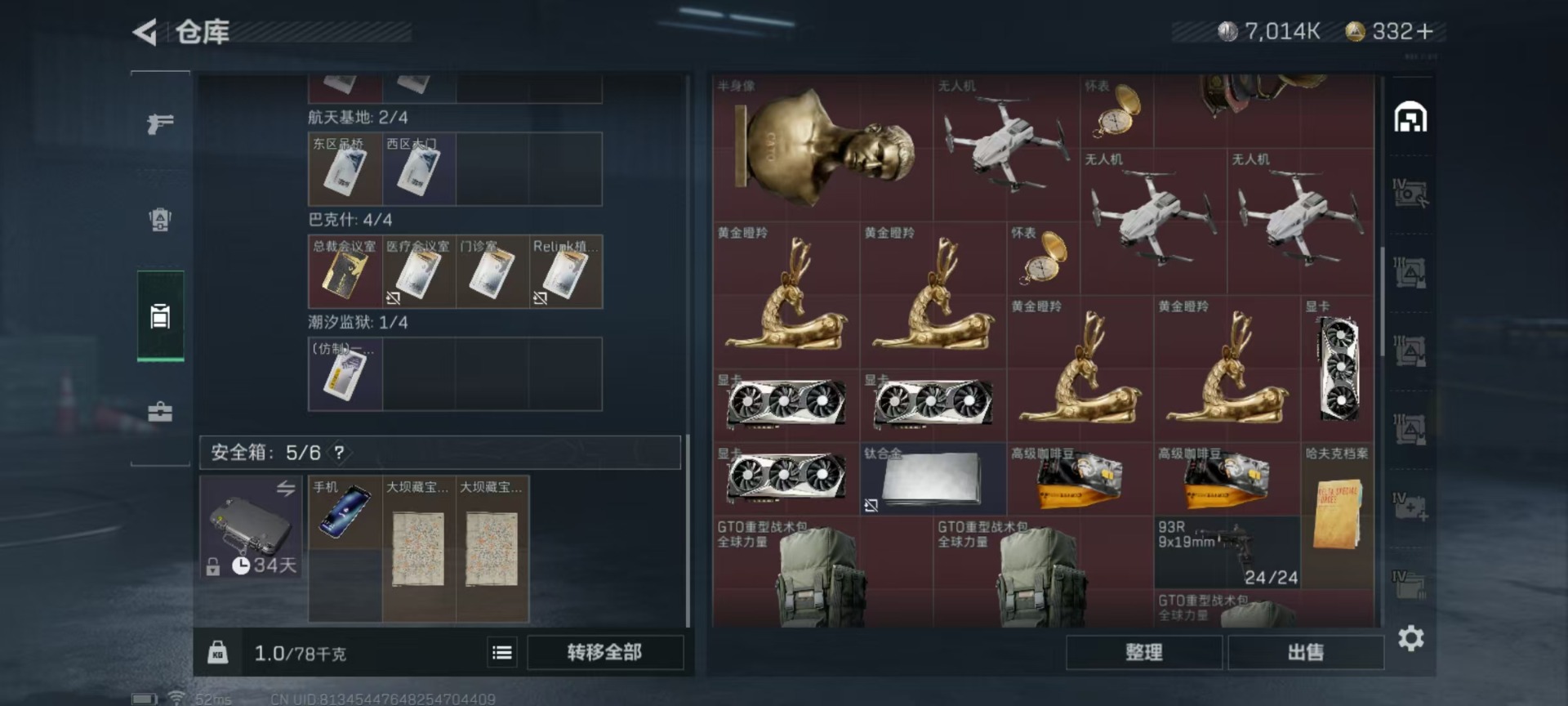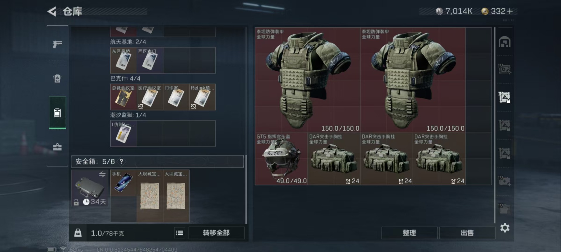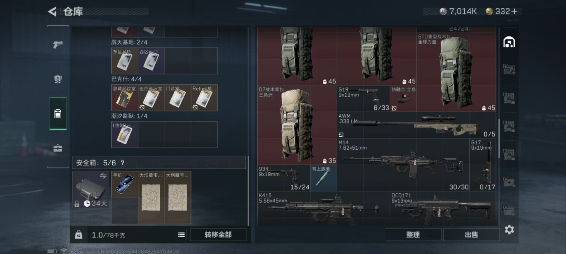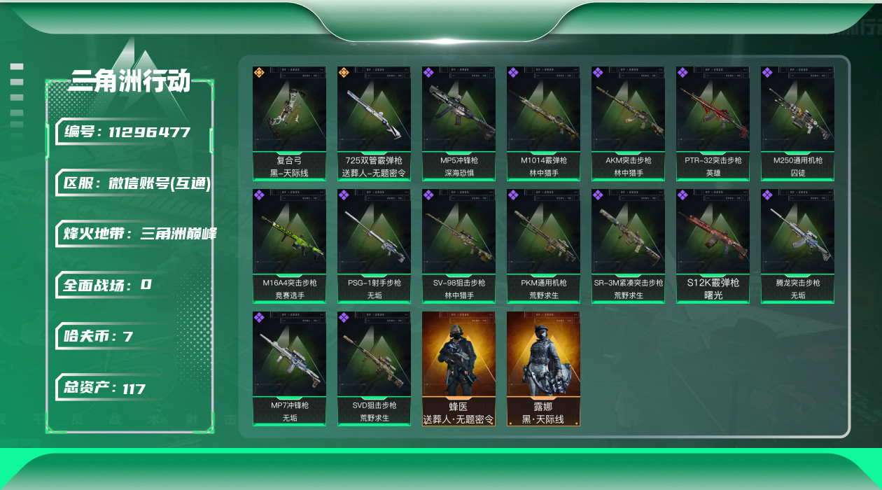 [11296477]总资产:117.8 2干员外观 2传说枪械 高级安全箱(2×3)9.15号到期 可二次 可修改实名 烽火地带段位:三角洲巅峰 全面战场段位:尉官 哈夫币:7.014 传说武器皮肤:复合弓-黑-天际线,725双管霰弹枪-送葬人-无题密令 史诗武器皮肤:PKM通用机枪-荒野求生,MP5冲锋枪-深海恐惧,SR-3M紧凑突击步枪-荒野求生,AKM突击步枪-林中猎手,M16A4突击步枪-竞赛选手,SVD狙击步枪-荒野求生,M1014霰弹枪-林中猎手,SV-98狙击步枪-林中猎手,PTR-32突击步枪-英雄,PSG-1射手步枪-无垢,M250通用机枪-囚徒,腾龙突击步枪-无垢,MP7冲锋枪-无垢,S12K霰弹枪-曙光 干员外观:蜂医-送葬人·无题密令(S5),露娜-黑·天际线