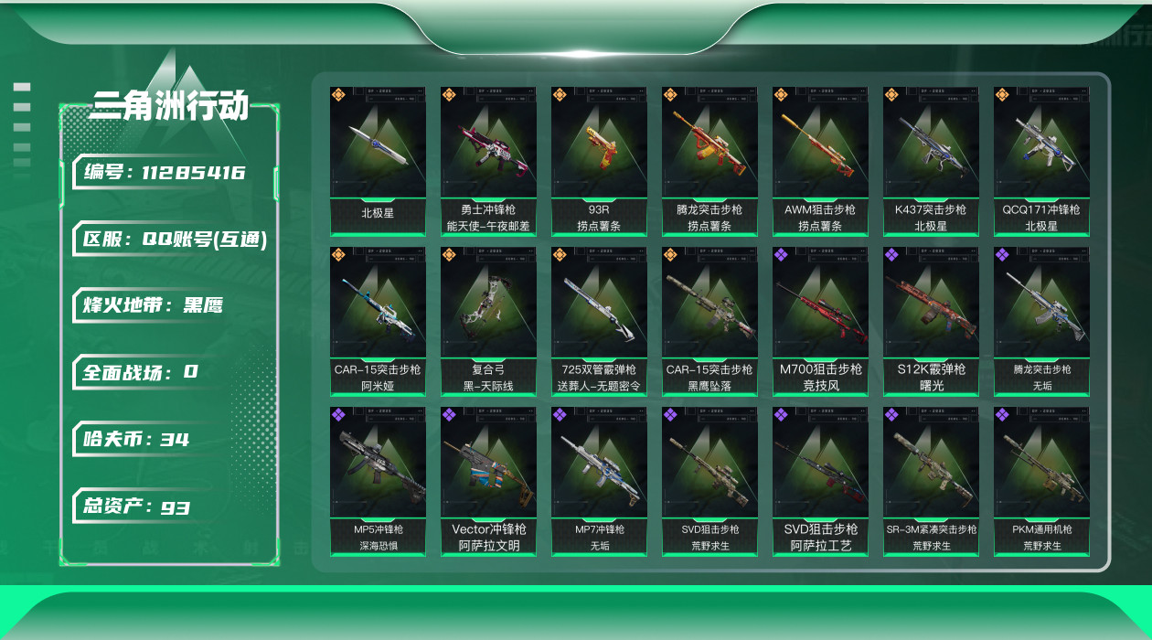 [11285416]总资产:93.3M 2干员外观 1近战传说 11传说枪械 哈夫币:34.470K 高级安全箱(9.17到期) 可二次 可修改实名 优质装备:近战-北极星 烽火地带段位:黑鹰 全面战场段位:校官 传说武器皮肤:CAR-15突击步枪-阿米娅,复合弓-黑-天际线,AWM狙击步枪-捞点薯条,QCQ171冲锋枪-北极星,腾龙突击步枪-捞点薯条,93R-捞点薯条,勇士冲锋枪-能天使-午夜邮差,725双管霰弹枪-送葬人-无题密令,K437突击步枪-北极星,CAR-15突击步枪-黑鹰坠落 史诗武器皮肤:AUG突击步枪-蝮蛇,PKM通用机枪-荒野求生,MP5冲锋枪-深海恐惧,勇士冲锋枪-深海恐惧,AKM突击步枪-林中猎手,.357左轮-幸运时刻,SR-3M紧凑突击步枪-荒野求生,M1014霰弹枪-林中猎手,SV-98狙击步枪-林中猎手,SVD狙击步枪-荒野求生,AS Val突击步枪-典狱官,SCAR-H战斗步枪-囚徒,腾龙突击步枪-无垢,MP7冲锋枪-无垢,PSG-1射手步枪-无垢,Vector冲锋枪-阿萨拉文明,SVD狙击步枪-阿萨拉工艺,S12K霰弹枪-曙光,M700狙击步枪-竞技风 干员外观:蜂医-送葬人·无题密令(S5),露娜-黑·天际线