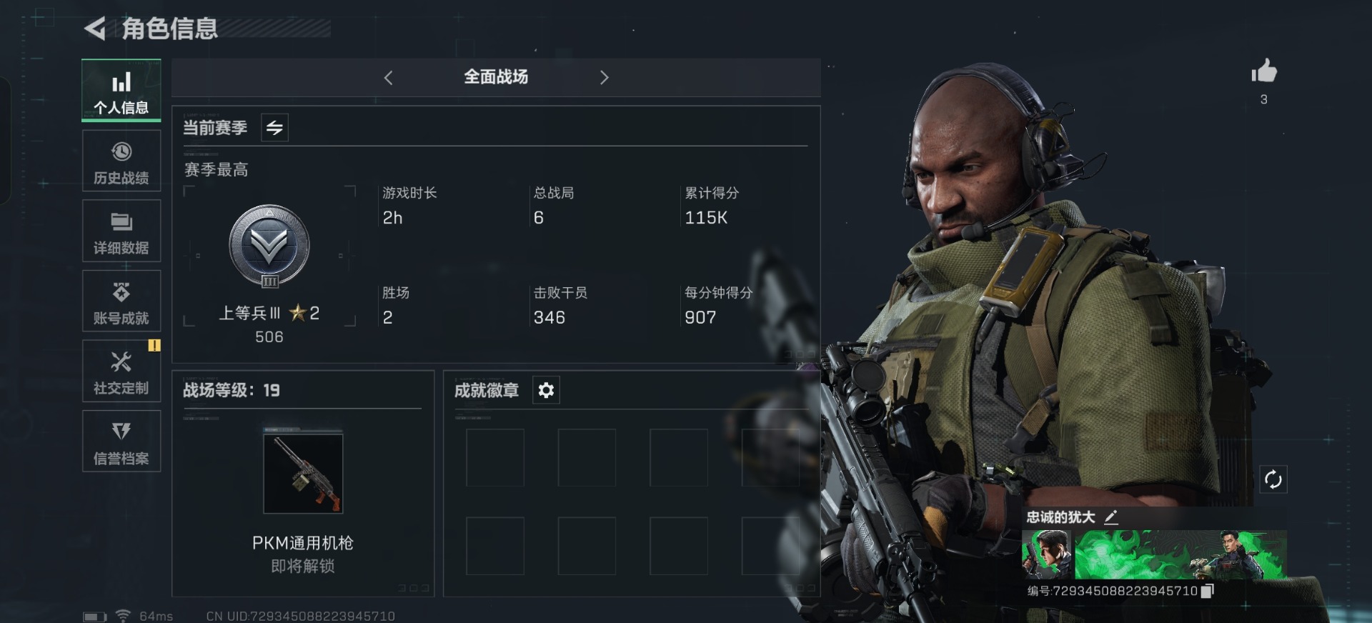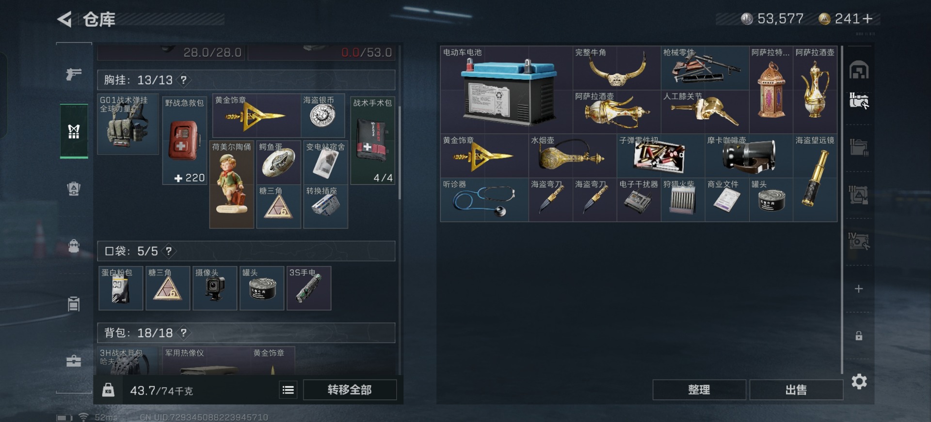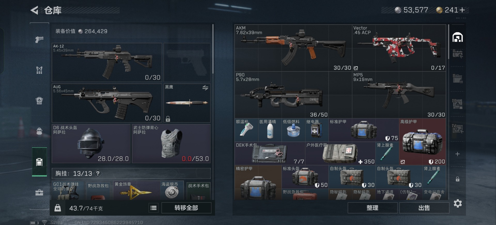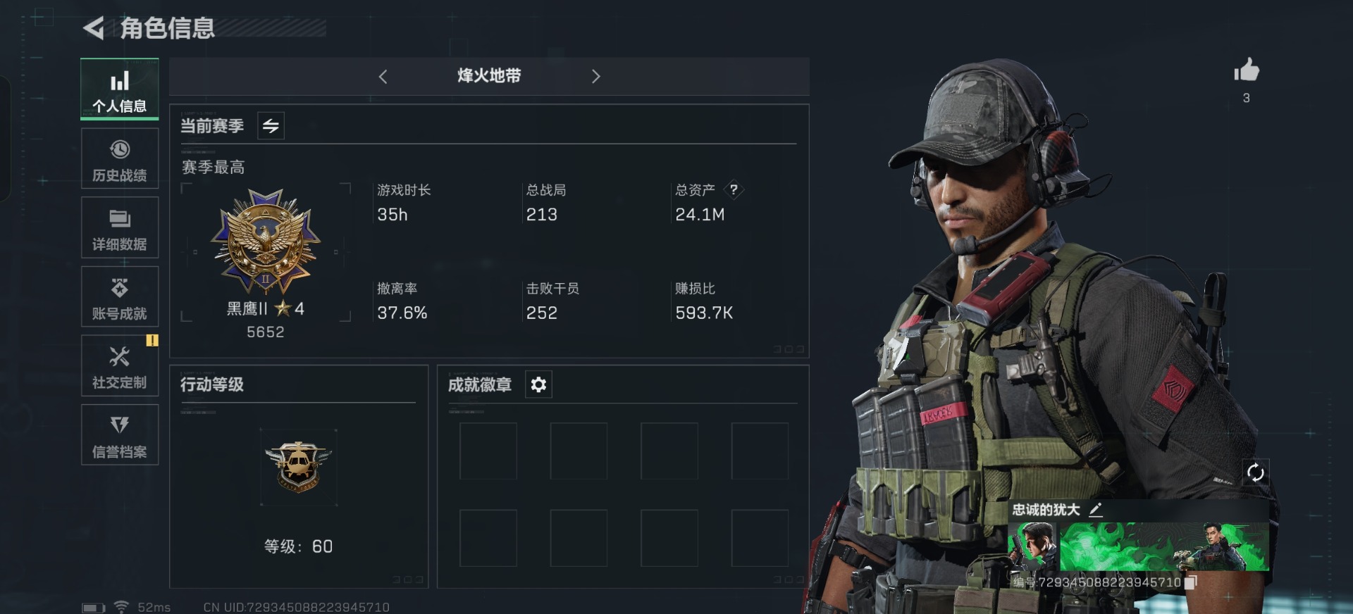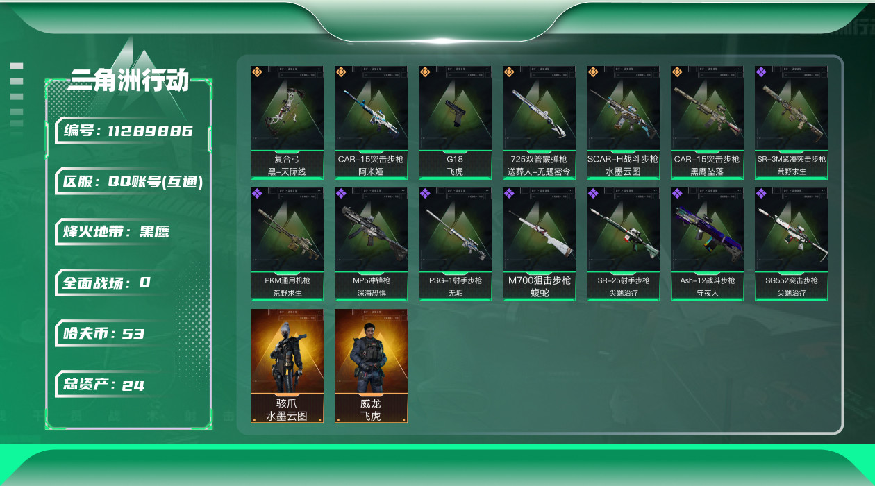 [11289886]可二次 可修改实名 实名:可修改 高级安全箱(9.17到期) 烽火地带段位:黑鹰 全面战场段位:上等兵 总资产:24.1 哈夫币:53.577 传说武器皮肤:SCAR-H战斗步枪-水墨云图,复合弓-黑-天际线,CAR-15突击步枪-阿米娅,725双管霰弹枪-送葬人-无题密令,G18-飞虎,CAR-15突击步枪-黑鹰坠落 史诗武器皮肤:M700狙击步枪-蝮蛇,SR-25射手步枪-尖端治疗,PKM通用机枪-荒野求生,SG552突击步枪-尖端治疗,Ash-12战斗步枪-守夜人,MP5冲锋枪-深海恐惧,SR-3M紧凑突击步枪-荒野求生,PSG-1射手步枪-无垢 干员外观:骇爪-水墨云图,威龙-飞虎