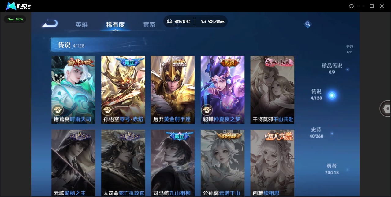 - [11824184]V9 2典藏 1无双 2珍品传说 18传说 126英雄 326皮肤 典藏英雄武则天 可修改实名 优质装备:无限飓风号(高达),神鉴启示录,天机白泽,朽木白哉,黑崎一护,黄金狮子座,黄金射手座,绛天战甲(鸡嘴战神),黄金白羊座,炽阳神光,一念神魔,云霓雀翎,末日机甲-孙尚香(绿蚂蚱),地狱火,地狱之眼 传说皮:落雪白狼,死亡执政官 珍宝阁皮:妄想食味,玩趣恶龙 限定皮:鸣野蒿,异界灵契(白毛香),瑞麟志(木兰年限),高山流水,五谷丰年,青龙志(铠年限),武圣,天狼运算者,梁祝,龙胆,烈魂,天狼溯光者,天狼绘梦者,李小龙,朱雀志(守约年限),辉光之辰,奇迹圣诞,孙行者,猪悟能,一生所爱,大圣娶亲,引擎之心,天魔缭乱,冰霜恋舞曲,乒乒小将,美猴王,寅虎·瑞焰(虎皮蛋子),时之祈愿-云中君,百木心枪,玉兔公主,时之奇旅-妲己 史诗皮:赞萌露比,鸭鸭历险记-刘禅,龙之律动,石田雨龙,百相守梦-周瑜,幻珠鲛人,琥珀纪元伽罗,守夜人,百相守梦-黄忠,苍穹之光,电玩小子(小书包),白龙吟,特工魅影,千年之狐,永昼,电玩·爆裂旋风,江河有灵,百解令(蒙犽),高渐离燃音魔法,偶像歌手,龙骑士(小龙虾),暗夜猫娘,魅语,无限星赏官,晚萤,冰冠公主,青蛇,时之恋人-孙尚香,乱世虎臣,节奏热浪,修罗,女仆咖啡,摇滚巨星,水果甜心,天才门将,星夜王子,心灵骇客,时之奇旅-安琪拉,功夫厨神,德古拉伯爵,幽灵船长,鬼剑武藏,心灵战警,舞动绿茵,地狱岩魂,纤云弄巧,繁星吟游(呼啦呼啦),缤纷独角兽,乘风破浪,逐浪之夏,水晶猎龙者,曙光守护者,箭羽风息,金属风暴,鹰眼统帅,暗夜贵公子,魅力维加斯,未来纪元-赵云
