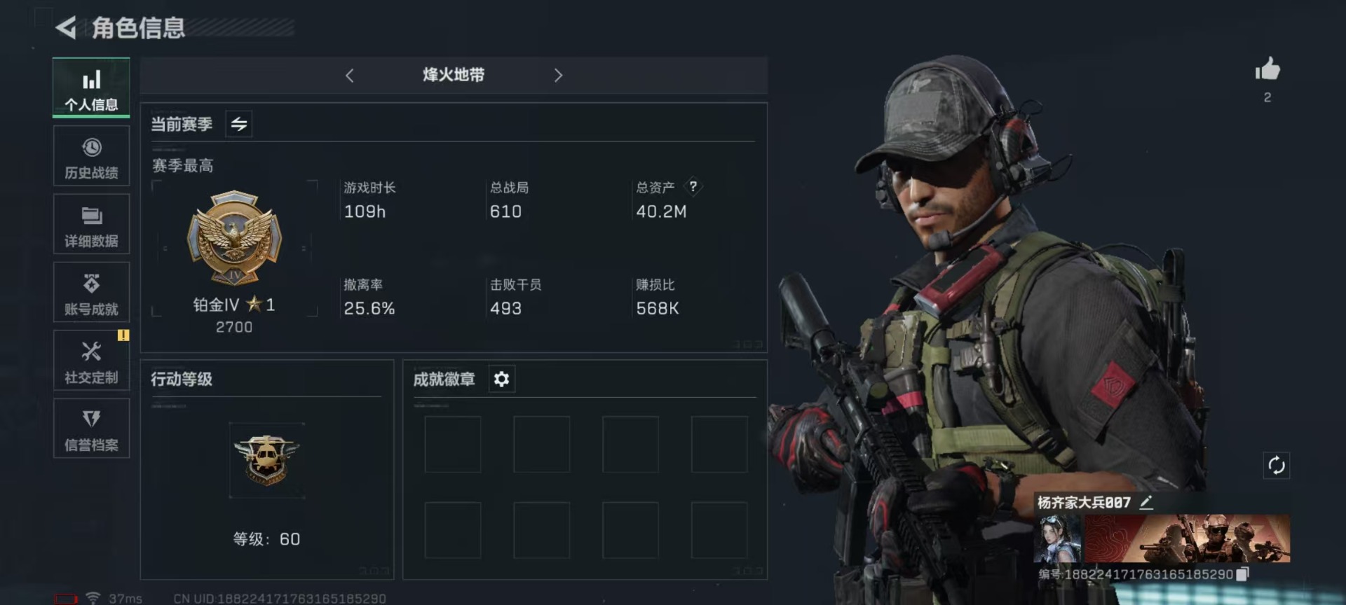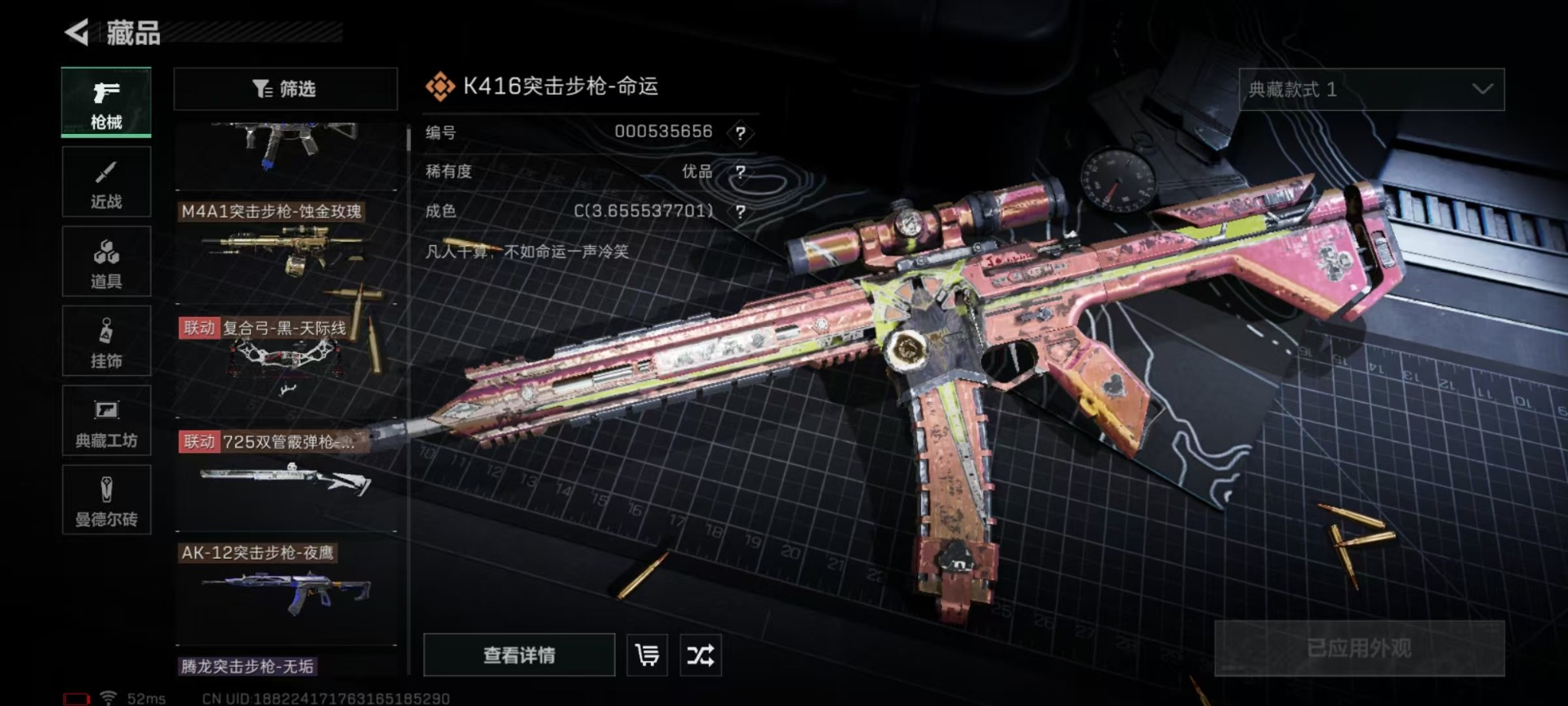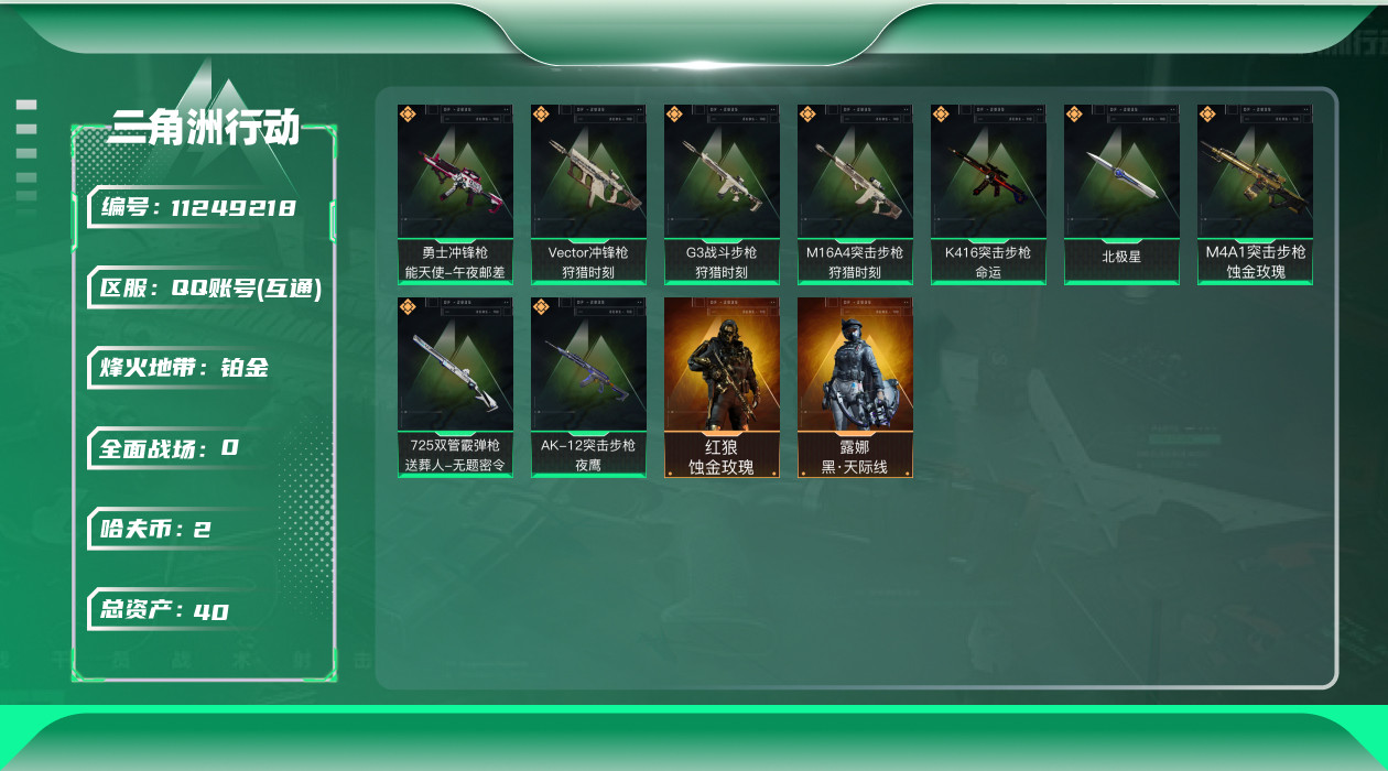 [11249218]总资产:40.2 2干员外观 1近战传说 9传说枪械 高级安全箱(9.17到期) 可二次 可修改实名 优质装备:近战-北极星,K416突击步枪-命运(典藏) 烽火地带段位:铂金 全面战场段位:无段位 哈夫币:2.769 传说武器皮肤:AK-12突击步枪-夜鹰,M16A4突击步枪-狩猎时刻,Vector冲锋枪-狩猎时刻,G3战斗步枪-狩猎时刻,勇士冲锋枪-能天使-午夜邮差,725双管霰弹枪-送葬人-无题密令,M4A1突击步枪-蚀金玫瑰 干员外观:红狼-蚀金玫瑰,露娜-黑·天际线