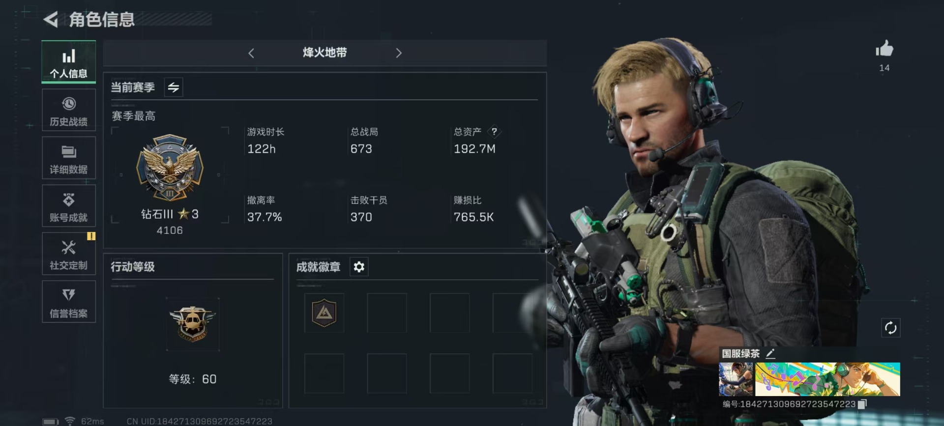 - [11818064]总资产:189.5M 9传说枪械 哈夫币:111K 可二次 可修改实名 优质装备:顶级安全箱(3x3) 烽火地带段位:青铜 全面战场段位:无段位 传说武器皮肤:Vector冲锋枪-狩猎时刻,G3战斗步枪-狩猎时刻,M16A4突击步枪-狩猎时刻,AK-12突击步枪-特斯拉线圈,SR-3M紧凑突击步枪-特斯拉线圈,UZI冲锋枪-特斯拉线圈,勇士冲锋枪-能天使-午夜邮差,复合弓-黑-天际线,M4A1突击步枪-阿米娅 史诗武器皮肤:MP5冲锋枪-深海恐惧,SV-98狙击步枪-林中猎手,M250通用机枪-囚徒,QBZ95-1突击步枪-曙光