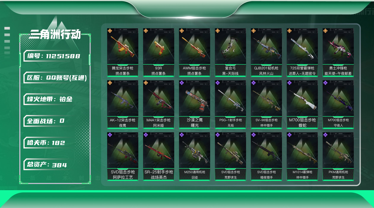 [11251588]总资产:384 9传说枪械 高级安全箱(9.17到期) 可二次 可修改实名 烽火地带段位:铂金 全面战场段位:列兵 哈夫币:182 传说武器皮肤:QJB201轻机枪-风林火山,AK-12突击步枪-夜鹰,M4A1突击步枪-阿米娅,复合弓-黑-天际线,AWM狙击步枪-捞点薯条,腾龙突击步枪-捞点薯条,93R-捞点薯条,勇士冲锋枪-能天使-午夜邮差,725双管霰弹枪-送葬人-无题密令 史诗武器皮肤:AUG突击步枪-蝮蛇,M700狙击步枪-蝮蛇,SR-25射手步枪-战场英杰,PKM通用机枪-荒野求生,AS Val突击步枪-尖端治疗,M700狙击步枪-守夜人,Ash-12战斗步枪-守夜人,MP5冲锋枪-深海恐惧,勇士冲锋枪-深海恐惧,SG552突击步枪-深海恐惧,AKM突击步枪-林中猎手,SVD狙击步枪-暗夜猎手,M16A4突击步枪-竞赛选手,SVD狙击步枪-荒野求生,M1014霰弹枪-林中猎手,SV-98狙击步枪-林中猎手,PTR-32突击步枪-英雄,PSG-1射手步枪-无垢,M250通用机枪-囚徒,腾龙突击步枪-无垢,MP7冲锋枪-无垢,QBZ95-1突击步枪-曙光,沙漠之鹰-曙光,SVD狙击步枪-阿萨拉工艺,S12K霰弹枪-曙光