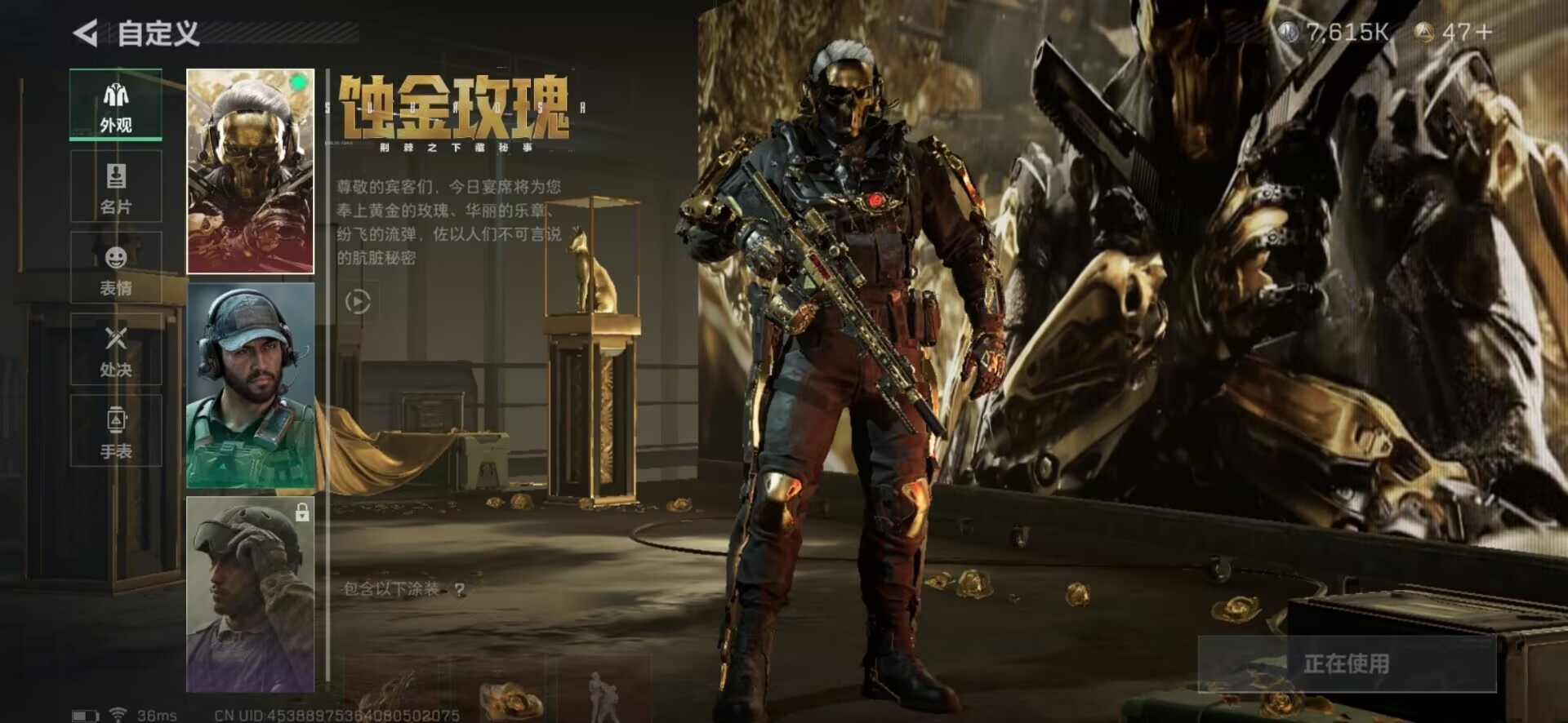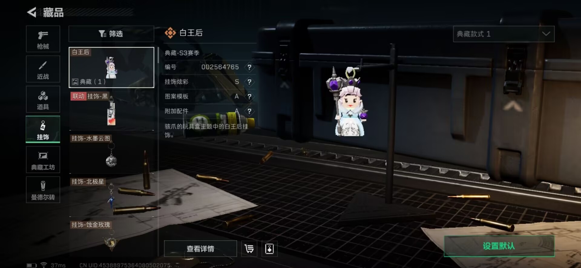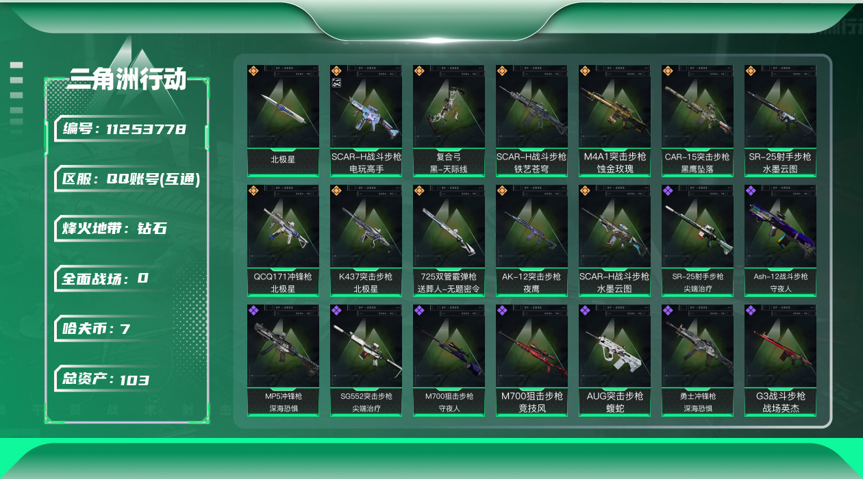 [11253778]总资产:103.3 2干员外观 1近战传说 12传说枪械 高级安全箱(9.17到期) 可二次 可修改实名 烽火地带段位:钻石 全面战场段位:尉官 哈夫币:7.615 传说武器皮肤:近战-北极星,SCAR-H战斗步枪-电玩高手,SCAR-H战斗步枪-水墨云图,SR-25射手步枪-水墨云图,SCAR-H战斗步枪-铁艺苍穹,AK-12突击步枪-夜鹰,复合弓-黑-天际线,725双管霰弹枪-送葬人-无题密令,QCQ171冲锋枪-北极星,K437突击步枪-北极星,M4A1突击步枪-蚀金玫瑰,CAR-15突击步枪-黑鹰坠落 史诗武器皮肤:QBZ95-1突击步枪-ACE,AUG突击步枪-特勤执行,Vector冲锋枪-红色彗星,PTR-32战斗步枪-ACE,SKS射手步枪-ACE,AUG突击步枪-蝮蛇,M700狙击步枪-蝮蛇,G3战斗步枪-战场英杰,SR-25射手步枪-尖端治疗,AS Val突击步枪-尖端治疗,M700狙击步枪-守夜人,SG552突击步枪-尖端治疗,Ash-12战斗步枪-守夜人,MP5冲锋枪-深海恐惧,SR-3M紧凑突击步枪-荒野求生,勇士冲锋枪-深海恐惧,AKM突击步枪-林中猎手,SVD狙击步枪-暗夜猎手,M16A4突击步枪-竞赛选手,PKM通用机枪-守夜人,SVD狙击步枪-荒野求生,SV-98狙击步枪-林中猎手,M250通用机枪-囚徒,腾龙突击步枪-无垢,MP7冲锋枪-无垢,Vector冲锋枪-阿萨拉文明,SCAR-H战斗步枪-趣味贴纸,M700狙击步枪-竞技风,QSZ92G-风林火山 干员外观:红狼-蚀金玫瑰,骇爪-水墨云图