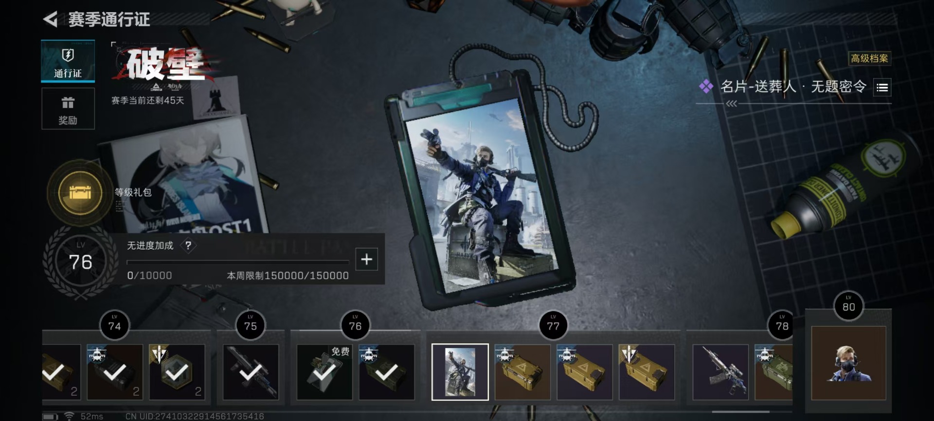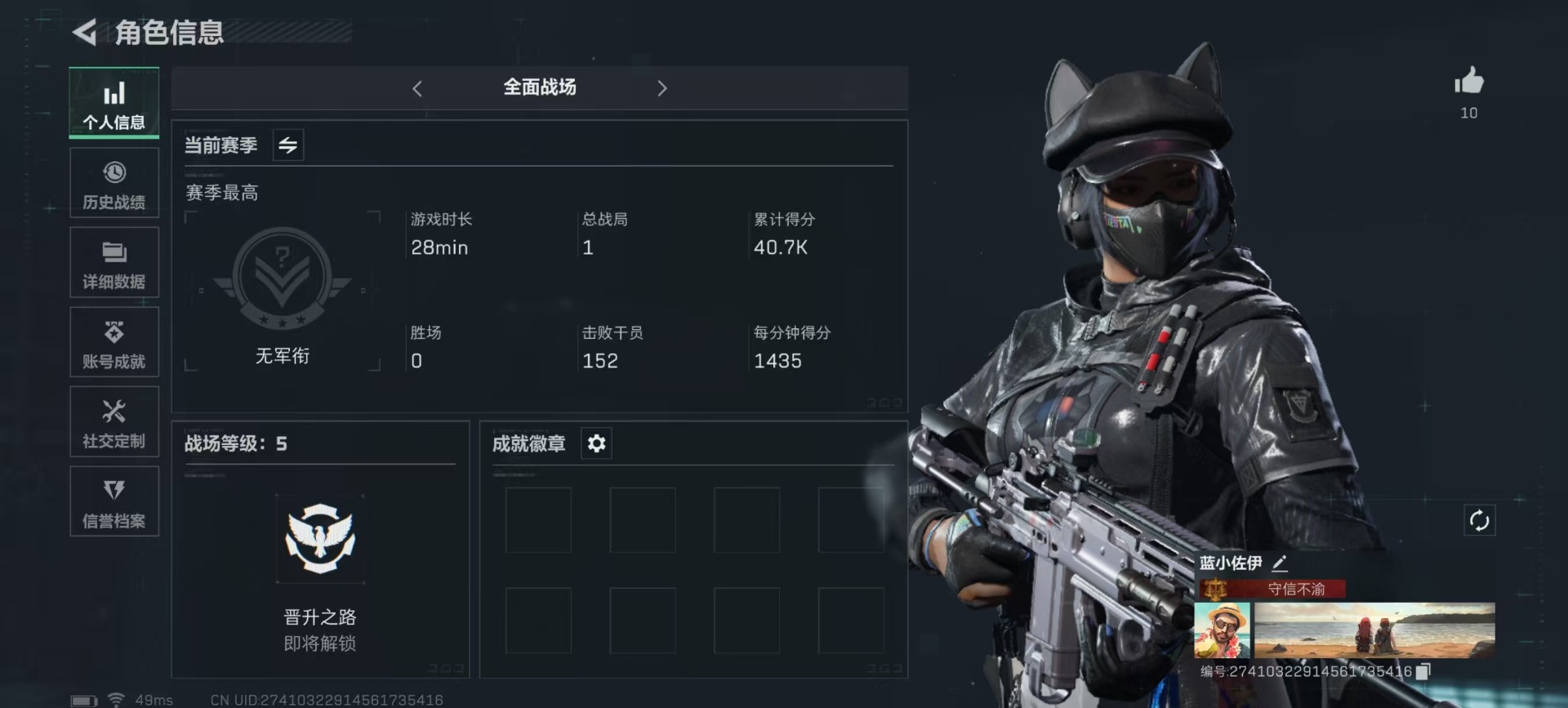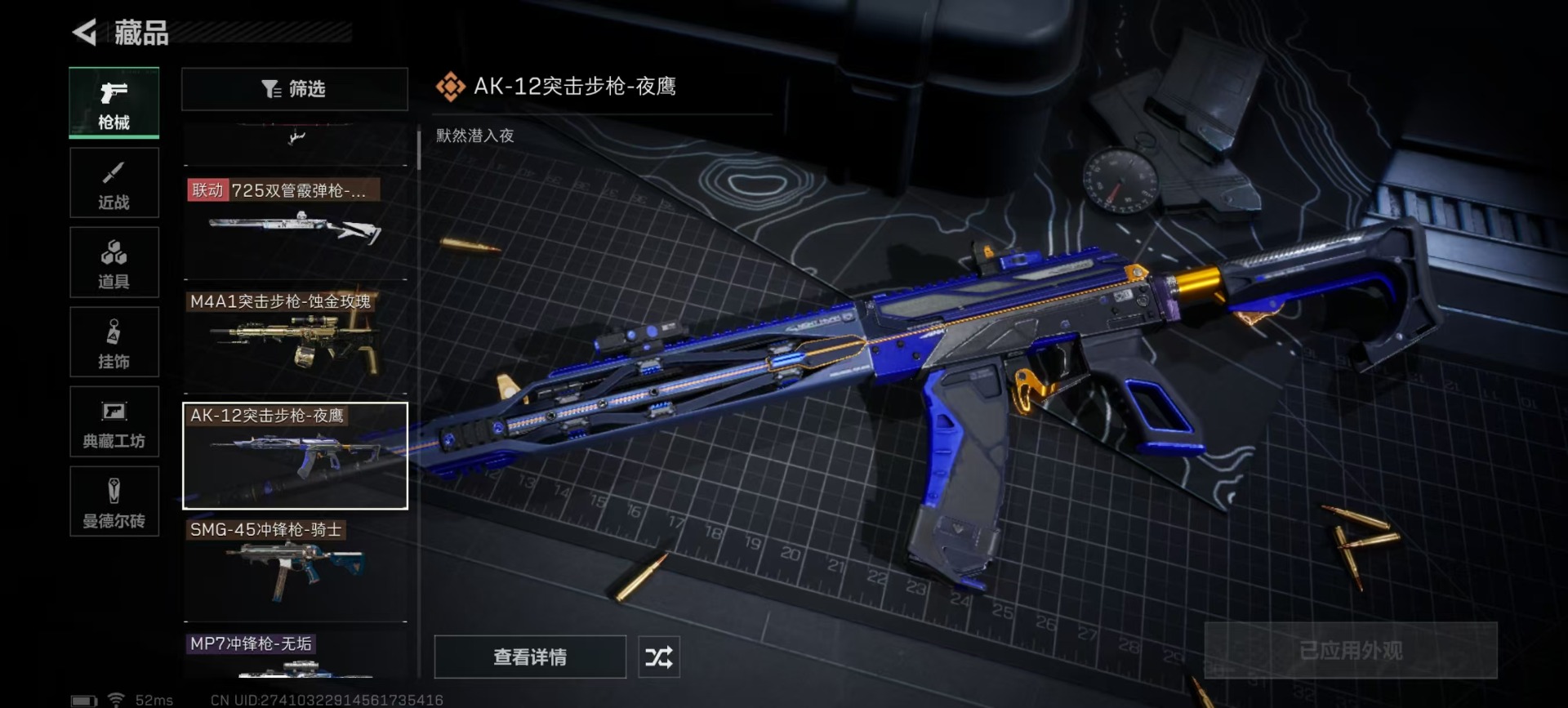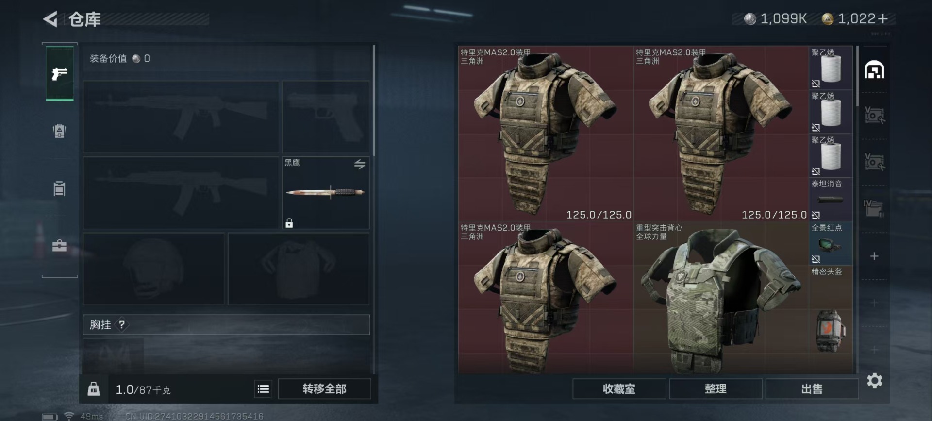 - [10444213]总资产110M,哈夫币3891w,枪皮数量91,战场等级:50 将军,行动等级:60 铂金,近战-黑鹰