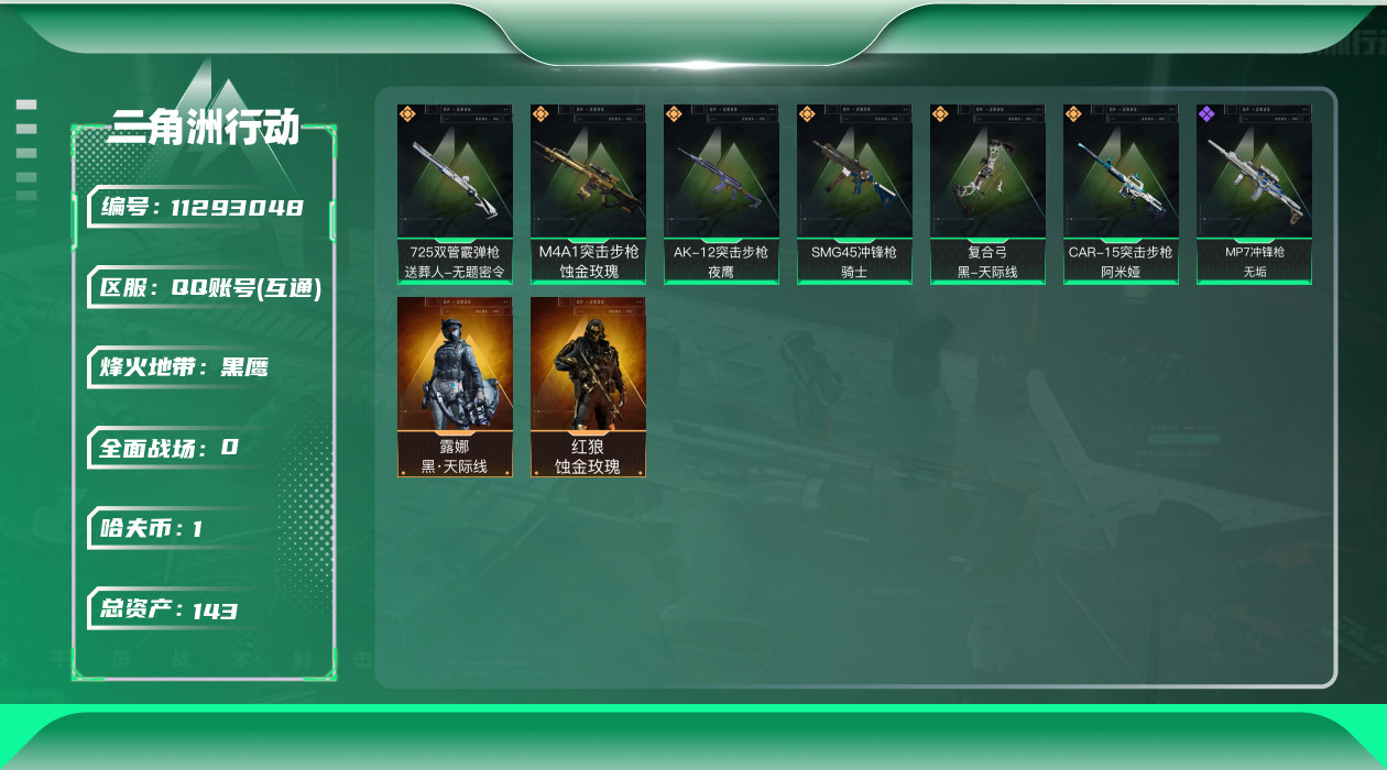 [11293048]可二次 可修改实名 实名:可修改 顶级安全箱(9.17到期) 烽火地带段位:黑鹰 全面战场段位:无段位 总资产:143.3 哈夫币:1.099 传说武器皮肤:AK-12突击步枪-夜鹰,SMG45冲锋枪-骑士,复合弓-黑-天际线,CAR-15突击步枪-阿米娅,725双管霰弹枪-送葬人-无题密令,M4A1突击步枪-蚀金玫瑰 史诗武器皮肤:MP7冲锋枪-无垢 干员外观:红狼-蚀金玫瑰,露娜-黑·天际线