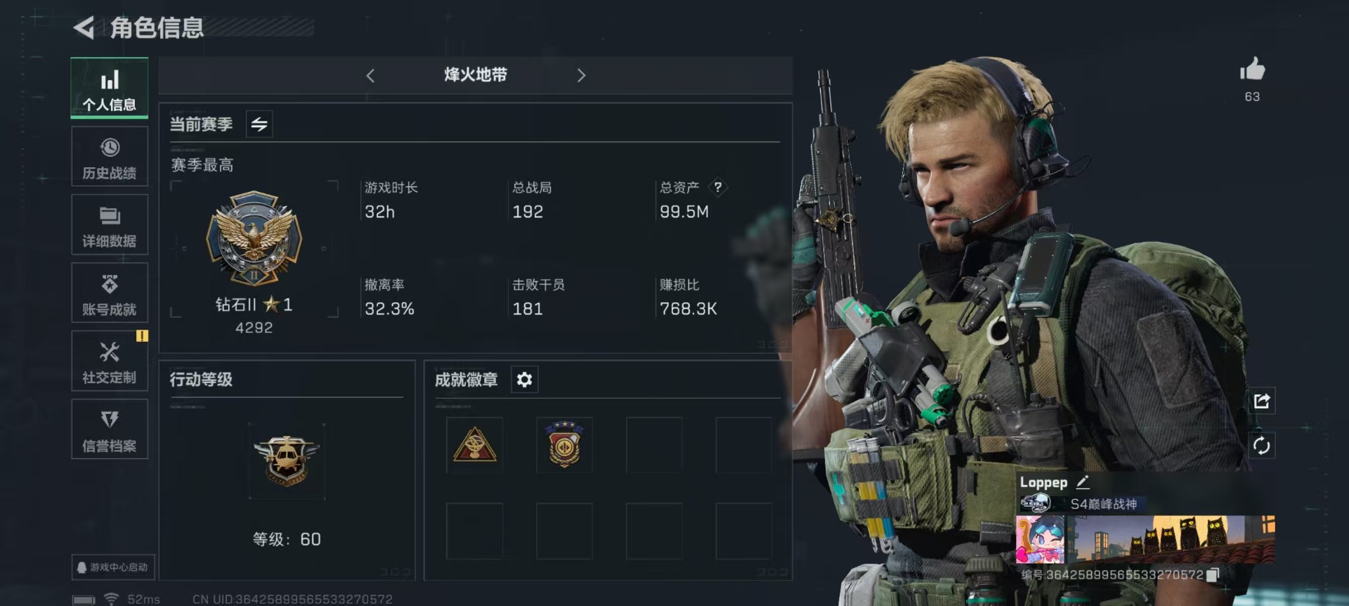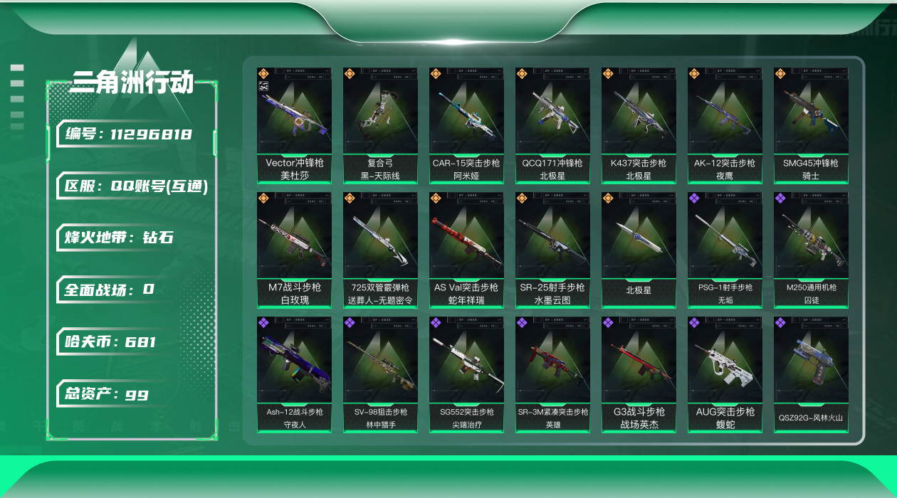 [11296818]可二次 可修改实名 实名:可修改 高级安全箱(9.17到期) 烽火地带段位:钻石 全面战场段位:无段位 总资产:99.5 哈夫币:681.212 传说武器皮肤:近战-北极星,Vector冲锋枪-美杜莎,AS Val突击步枪-蛇年祥瑞,SR-25射手步枪-水墨云图,AK-12突击步枪-夜鹰,SMG45冲锋枪-骑士,复合弓-黑-天际线,CAR-15突击步枪-阿米娅,725双管霰弹枪-送葬人-无题密令,QCQ171冲锋枪-北极星,K437突击步枪-北极星,M7战斗步枪-白玫瑰 史诗武器皮肤:SR-3M紧凑突击步枪-英雄,AUG突击步枪-蝮蛇,M700狙击步枪-蝮蛇,PKM通用机枪-蝮蛇,SR-25射手步枪-战场英杰,G3战斗步枪-战场英杰,SR-25射手步枪-尖端治疗,PKM通用机枪-荒野求生,AS Val突击步枪-尖端治疗,M700狙击步枪-守夜人,SG552突击步枪-尖端治疗,Ash-12战斗步枪-守夜人,MP5冲锋枪-深海恐惧,勇士冲锋枪-深海恐惧,SG552突击步枪-深海恐惧,AKM突击步枪-林中猎手,SVD狙击步枪-暗夜猎手,PKM通用机枪-守夜人,M1014霰弹枪-林中猎手,SV-98狙击步枪-林中猎手,PSG-1射手步枪-无垢,M250通用机枪-囚徒,沙漠之鹰-曙光,Vector冲锋枪-阿萨拉文明,SVD狙击步枪-阿萨拉工艺,S12K霰弹枪-曙光,PKM通用机枪-英雄,M700狙击步枪-竞技风,QSZ92G-风林火山,93R-博士 干员外观:红狼-蚀金玫瑰,威龙-飞虎
