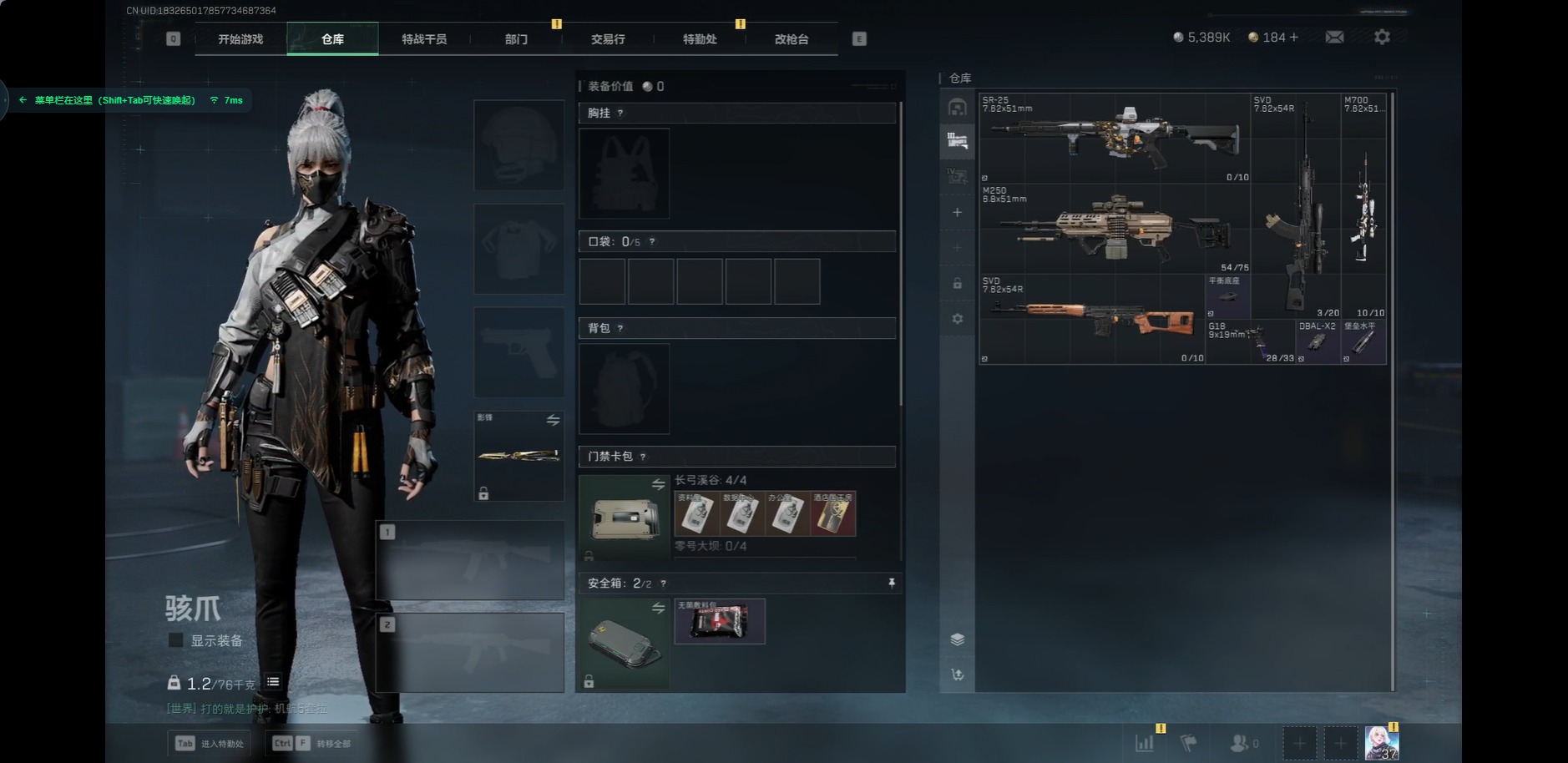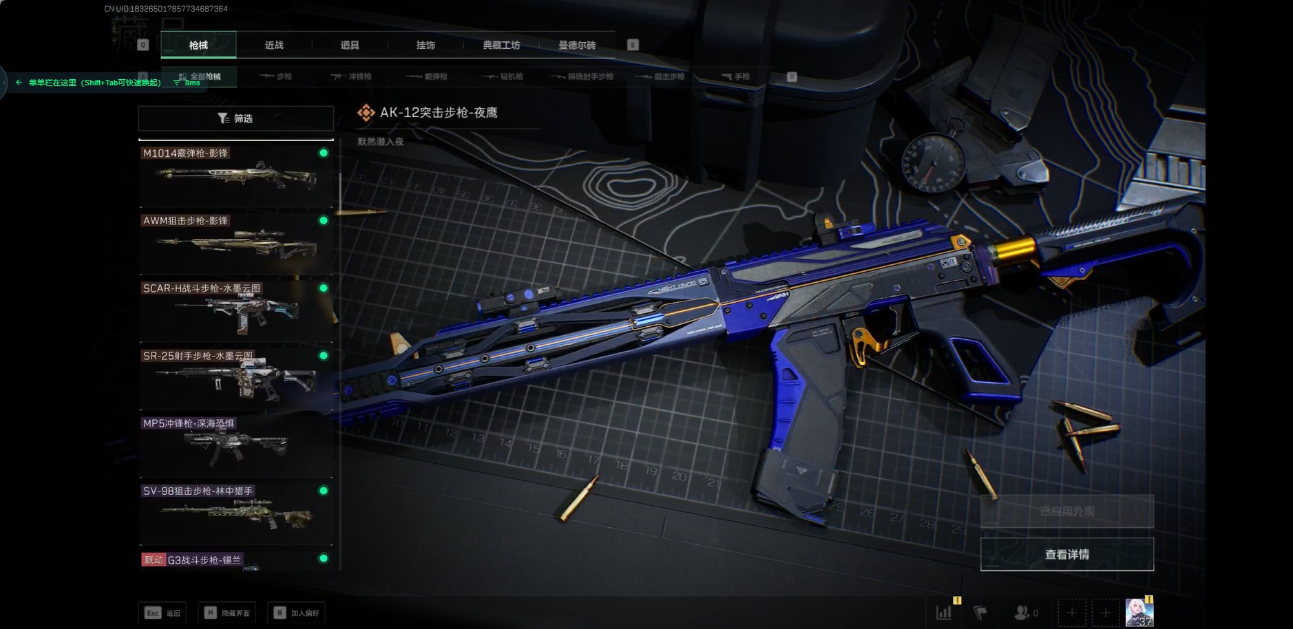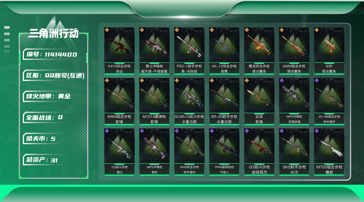 [11414400]总资产:31.2M 1干员外观 1近战传说 12传说枪械 哈夫币:5.389K 可二次 可修改实名 优质装备:近战-影锋,K416突击步枪-命运(典藏) 烽火地带段位:黄金 全面战场段位:上等兵 传说武器皮肤:SR-25射手步枪-水墨云图,SCAR-H战斗步枪-水墨云图,AWM狙击步枪-影锋,M1014霰弹枪-影锋,AK-12突击步枪-夜鹰,93R-捞点薯条,PSG-1射手步枪-黑-天际线,AWM狙击步枪-捞点薯条,腾龙突击步枪-捞点薯条,勇士冲锋枪-能天使-午夜邮差 史诗武器皮肤:QBZ95-1突击步枪-ACE,AUG突击步枪-特勤执行,SKS射手步枪-ACE,M700狙击步枪-蝮蛇,G3战斗步枪-战场英杰,PKM通用机枪-守夜人,MP5冲锋枪-深海恐惧,AKM突击步枪-林中猎手,MP5冲锋枪-青枳,G3战斗步枪-锡兰,SV-98狙击步枪-林中猎手,QSZ92G-风林火山 干员外观:骇爪-水墨云图