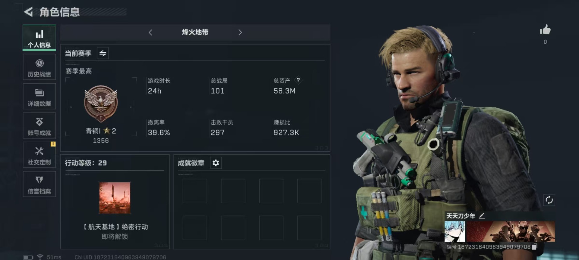 [11247421]总资产:56.3M 2干员外观 4传说枪械 哈夫币:22.178K 可二次 可修改实名 烽火地带段位:青铜 全面战场段位:上等兵 传说武器皮肤:CAR-15突击步枪-阿米娅,复合弓-黑-天际线,勇士冲锋枪-能天使-午夜邮差,Vector冲锋枪-能天使-午夜邮差 史诗武器皮肤:SV-98狙击步枪-林中猎手,M250通用机枪-囚徒,Vector冲锋枪-阿萨拉文明 干员外观:露娜-黑·天际线,蛊-能天使·午夜邮差