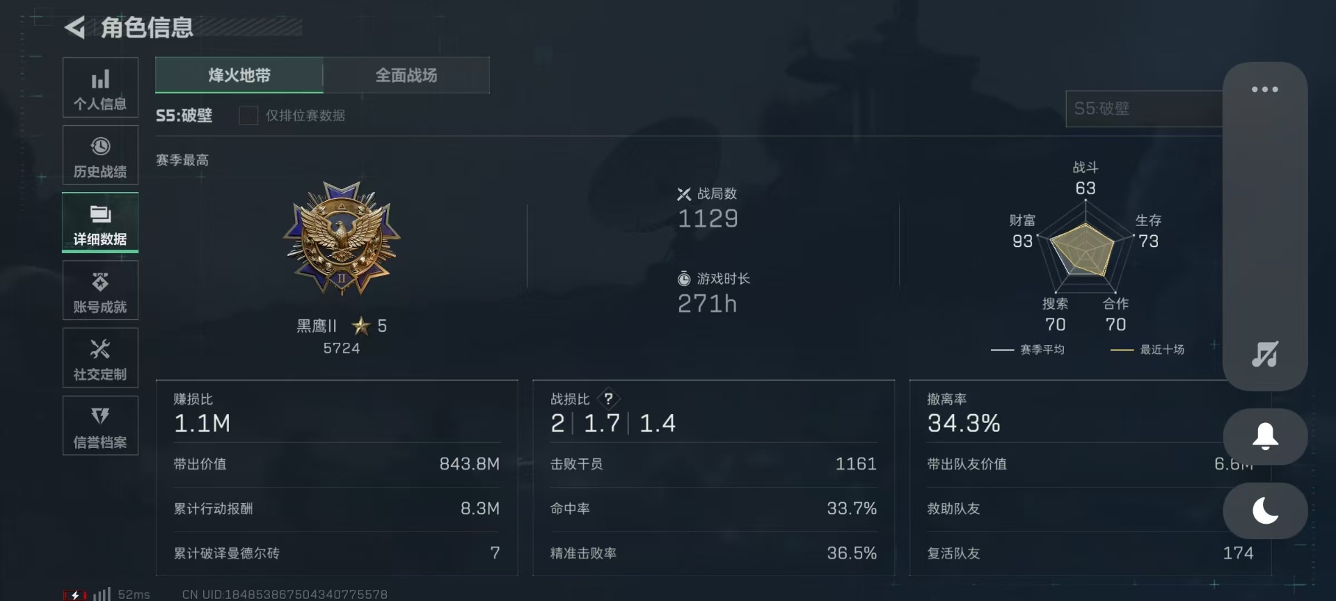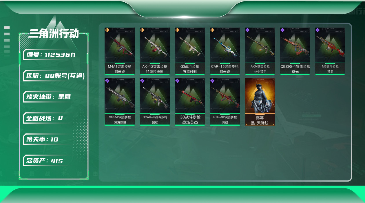 [11253611]总资产:415.5M 1干员外观 4传说枪械 哈夫币:10.417K 高级安全箱(9.17到期) 可二次 可修改实名 烽火地带段位:黑鹰 全面战场段位:将军 传说武器皮肤:M4A1突击步枪-阿米娅,CAR-15突击步枪-阿米娅,G3战斗步枪-狩猎时刻,AK-12突击步枪-特斯拉线圈 史诗武器皮肤:G3战斗步枪-战场英杰,SG552突击步枪-深海恐惧,AKM突击步枪-林中猎手,PTR-32突击步枪-英雄,SCAR-H战斗步枪-囚徒,QBZ95-1突击步枪-曙光,M7战斗步枪-禁卫 干员外观:露娜-黑·天际线