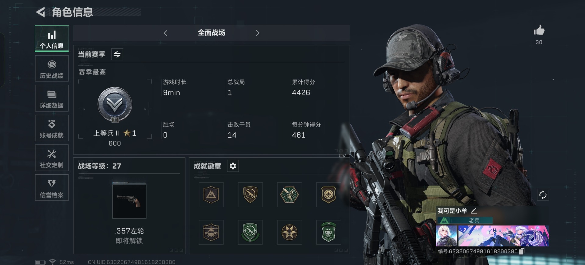 [11294191]可二次 可修改实名 实名:可修改 烽火地带段位:钻石 全面战场段位:上等兵 进阶安全箱(2×2)9.15号到期 总资产:47 哈夫币:447.737 传说武器皮肤:AS Val突击步枪-蛇年祥瑞,SCAR-H战斗步枪-水墨云图,AK-12突击步枪-夜鹰,SMG45冲锋枪-骑士,复合弓-黑-天际线 史诗武器皮肤:SR-3M紧凑突击步枪-英雄,QBZ95-1突击步枪-ACE,AUG突击步枪-特勤执行,SKS射手步枪-ACE,PKM通用机枪-蝮蛇,SR-25射手步枪-尖端治疗,SG552突击步枪-尖端治疗,Ash-12战斗步枪-守夜人,PTR-32突击步枪-英雄,QSZ92G-风林火山 干员外观:骇爪-水墨云图,露娜-黑·天际线