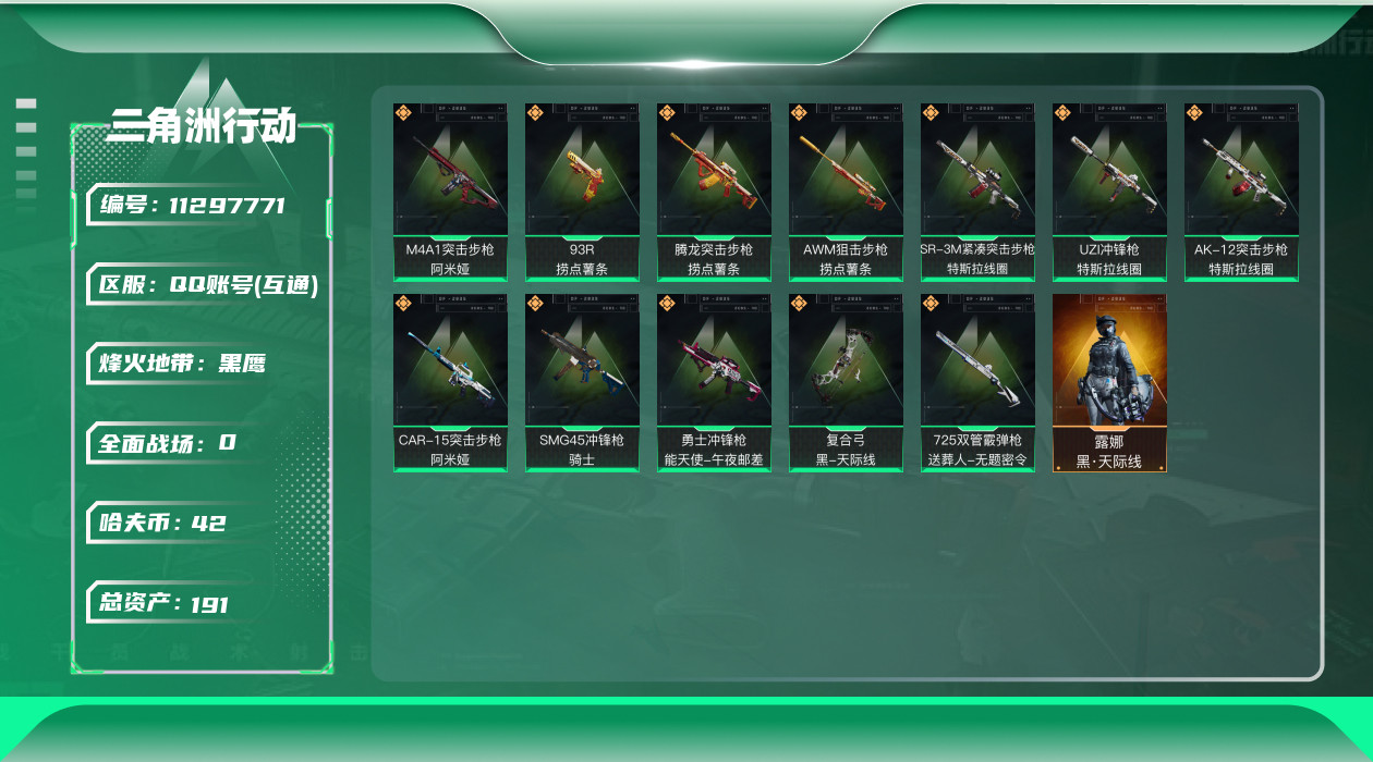 [11297771]总资产:191.8M 1干员外观 12传说枪械 哈夫币:42.122K 可二次 可修改实名 烽火地带段位:黑鹰 全面战场段位:校官 传说武器皮肤:SMG45冲锋枪-骑士,M4A1突击步枪-阿米娅,CAR-15突击步枪-阿米娅,复合弓-黑-天际线,AWM狙击步枪-捞点薯条,腾龙突击步枪-捞点薯条,93R-捞点薯条,AK-12突击步枪-特斯拉线圈,SR-3M紧凑突击步枪-特斯拉线圈,UZI冲锋枪-特斯拉线圈,勇士冲锋枪-能天使-午夜邮差,725双管霰弹枪-送葬人-无题密令 干员外观:露娜-黑·天际线