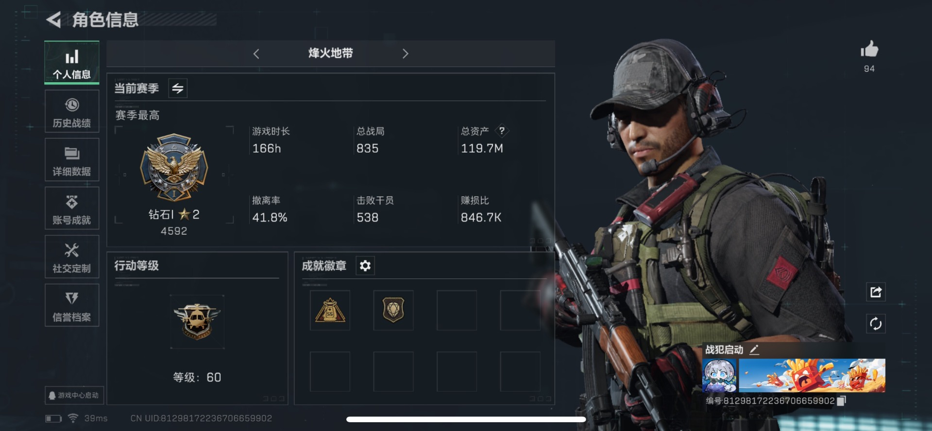 [11254294]总资产:119.7 4传说枪械 可二次 可修改实名 烽火地带段位:钻石 全面战场段位:上等兵 哈夫币:19.504 传说武器皮肤:93R-捞点薯条,AWM狙击步枪-捞点薯条,复合弓-黑-天际线,725双管霰弹枪-送葬人-无题密令