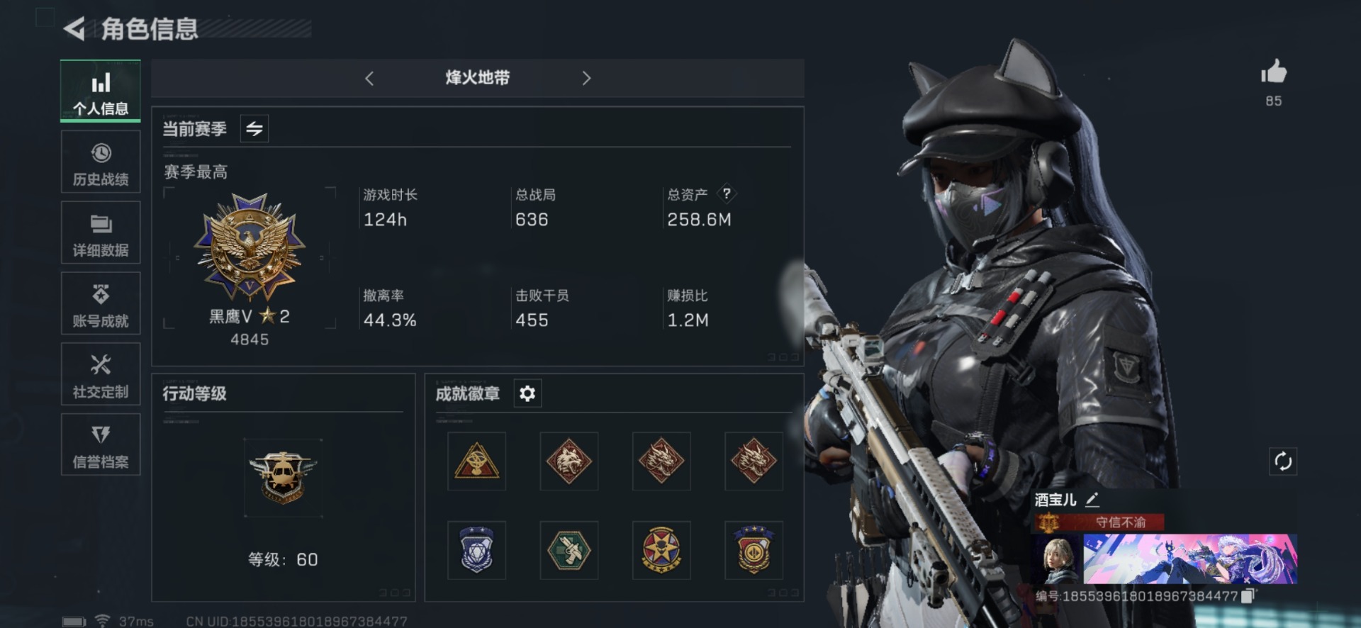 [11274054]总资产:258.6 2干员外观 11传说枪械 顶级安全箱(3×3)9.15号到期 可二次 可修改实名 烽火地带段位:黑鹰 全面战场段位:列兵 哈夫币:14.839 传说武器皮肤:AS Val突击步枪-蛇年祥瑞,SR-25射手步枪-水墨云图,SCAR-H战斗步枪-铁艺苍穹,AK-12突击步枪-夜鹰,复合弓-黑-天际线,CAR-15突击步枪-阿米娅,725双管霰弹枪-送葬人-无题密令,M7战斗步枪-维京,M7战斗步枪-怜悯,M4A1突击步枪-蚀金玫瑰,M7战斗步枪-神秘艺术 干员外观:红狼-蚀金玫瑰,露娜-黑·天际线