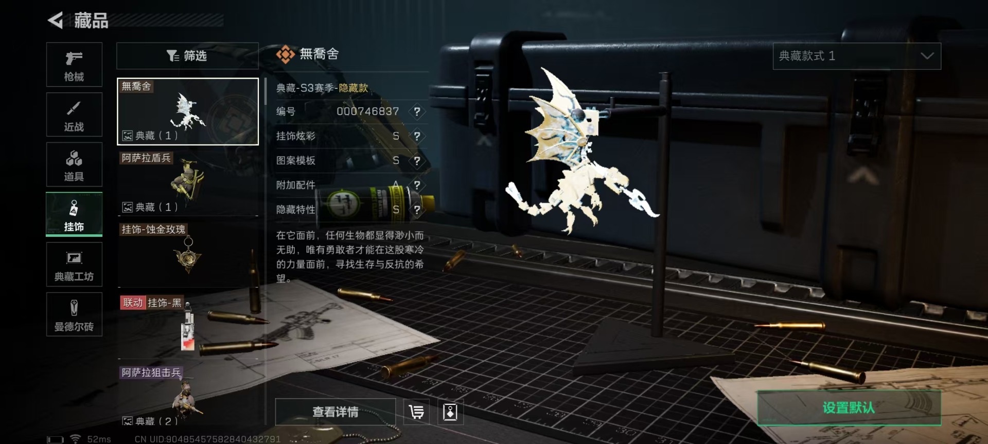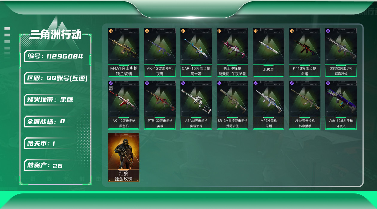 [11296084]总资产:26.3 1干员外观 1近战传说 6传说枪械 高级安全箱(9.17到期) 可二次 可修改实名 优质装备:近战-北极星,K416突击步枪-命运(典藏) 烽火地带段位:黑鹰 全面战场段位:上等兵 哈夫币:1.318 传说武器皮肤:AK-12突击步枪-夜鹰,CAR-15突击步枪-阿米娅,勇士冲锋枪-能天使-午夜邮差,M4A1突击步枪-蚀金玫瑰 史诗武器皮肤:AK-12突击步枪-原型机(典藏),AS Val突击步枪-尖端治疗,Ash-12战斗步枪-守夜人,SR-3M紧凑突击步枪-荒野求生,SG552突击步枪-深海恐惧,AKM突击步枪-林中猎手,PTR-32突击步枪-英雄,MP7冲锋枪-无垢 干员外观:红狼-蚀金玫瑰