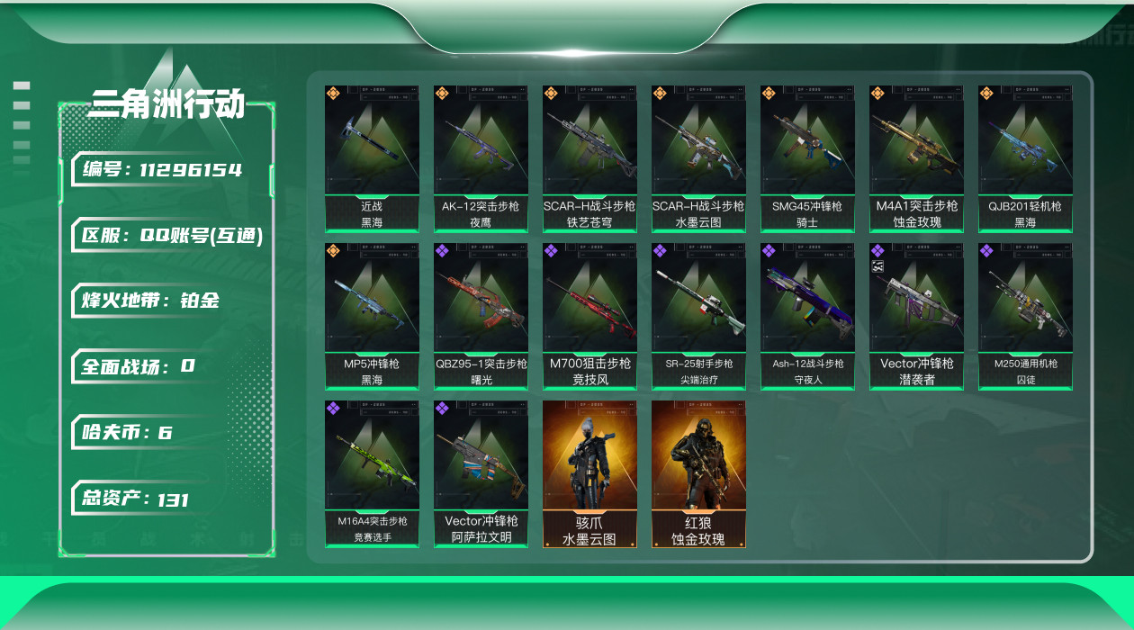 [11296154]可二次 可修改实名 实名:可修改 烽火地带段位:铂金 全面战场段位:军士长 高级安全箱(2×3)9.15号到期 总资产:131.7 哈夫币:6.419 传说武器皮肤:近战-黑海,SCAR-H战斗步枪-水墨云图,SCAR-H战斗步枪-铁艺苍穹,AK-12突击步枪-夜鹰,SMG45冲锋枪-骑士,QJB201轻机枪-黑海,MP5冲锋枪-黑海,M4A1突击步枪-蚀金玫瑰 史诗武器皮肤:Vector冲锋枪-潜袭者,SR-25射手步枪-尖端治疗,Ash-12战斗步枪-守夜人,M16A4突击步枪-竞赛选手,M250通用机枪-囚徒,QBZ95-1突击步枪-曙光,Vector冲锋枪-阿萨拉文明,M700狙击步枪-竞技风 干员外观:红狼-蚀金玫瑰,骇爪-水墨云图