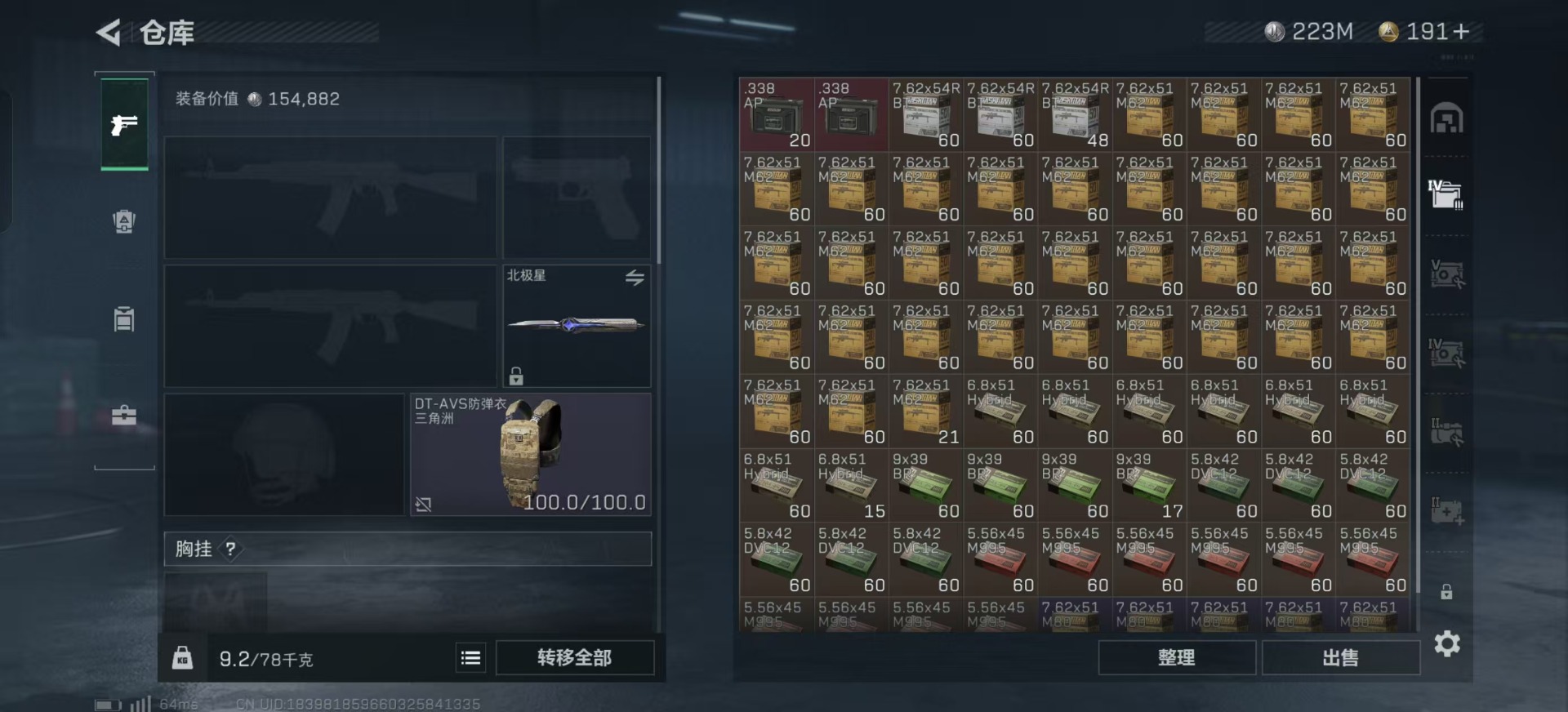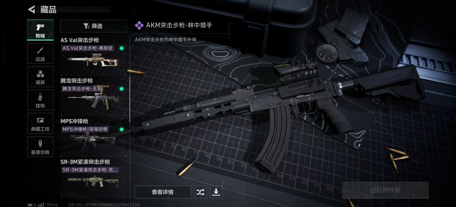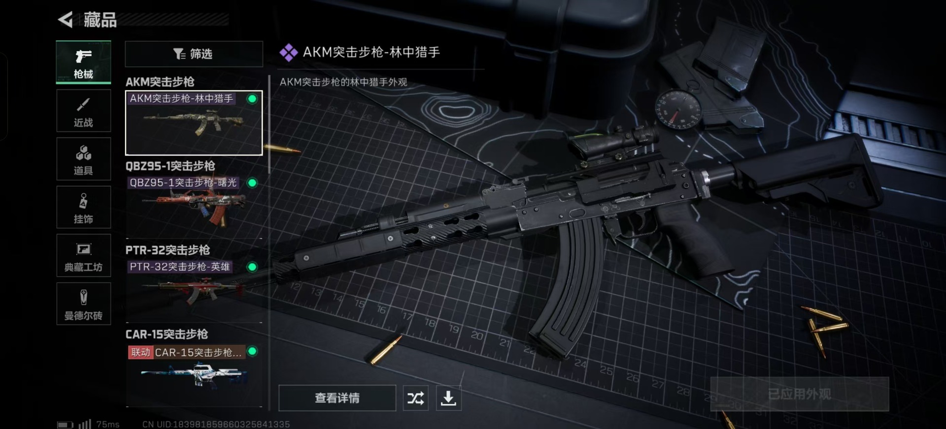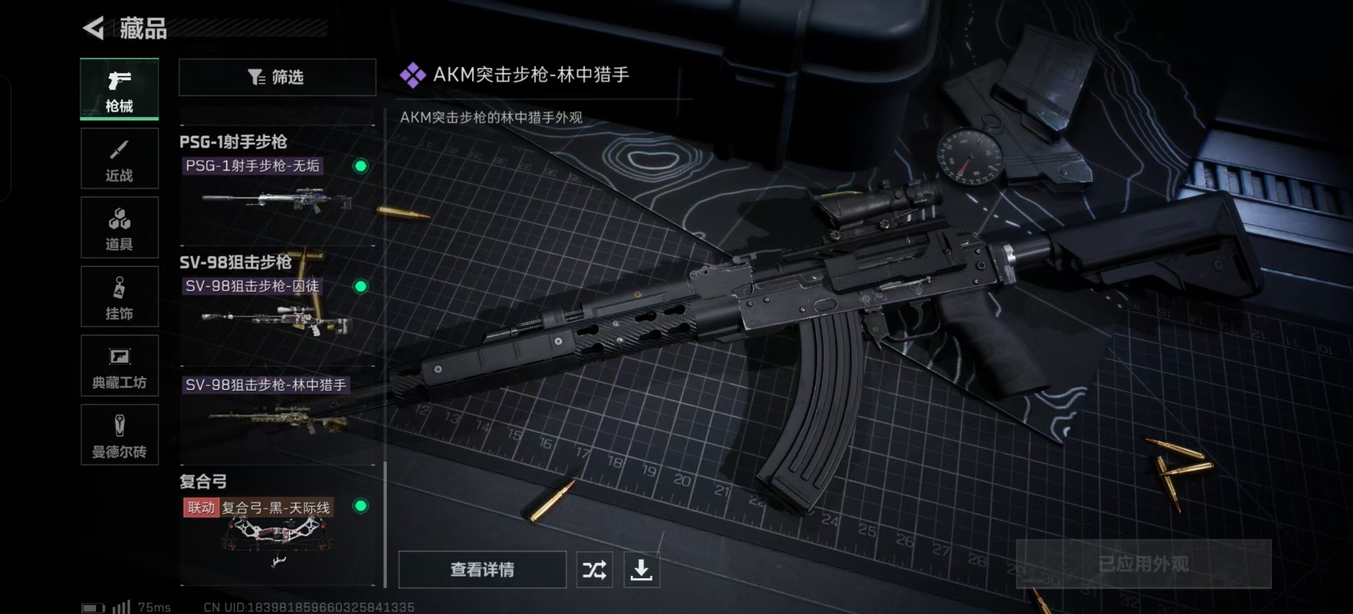 - [11446420]总资产:134.3M 1干员外观 2传说枪械 哈夫币:103K 可二次 可修改实名 烽火地带段位:青铜 全面战场段位:无段位 传说武器皮肤:CAR-15突击步枪-阿米娅,勇士冲锋枪-能天使-午夜邮差 史诗武器皮肤:AKM突击步枪-林中猎手,M1014霰弹枪-林中猎手,SV-98狙击步枪-林中猎手,M250通用机枪-囚徒,SV-98狙击步枪-囚徒 干员外观:露娜-黑·天际线