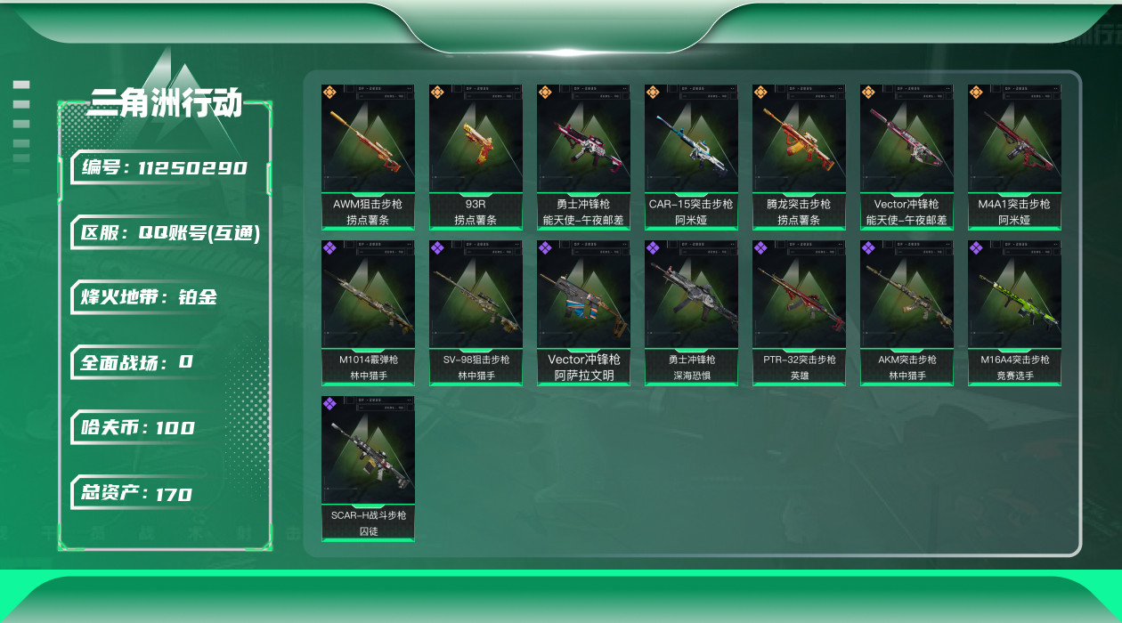 [11250290]总资产:170.6M 7传说枪械 哈夫币:100K 顶级安全箱(9.17到期) 可二次 可修改实名 优质装备:顶级安全箱(3x3) 烽火地带段位:铂金 全面战场段位:无段位 传说武器皮肤:M4A1突击步枪-阿米娅,CAR-15突击步枪-阿米娅,AWM狙击步枪-捞点薯条,腾龙突击步枪-捞点薯条,93R-捞点薯条,勇士冲锋枪-能天使-午夜邮差,Vector冲锋枪-能天使-午夜邮差 史诗武器皮肤:勇士冲锋枪-深海恐惧,AKM突击步枪-林中猎手,M16A4突击步枪-竞赛选手,M1014霰弹枪-林中猎手,SV-98狙击步枪-林中猎手,PTR-32突击步枪-英雄,SCAR-H战斗步枪-囚徒,Vector冲锋枪-阿萨拉文明