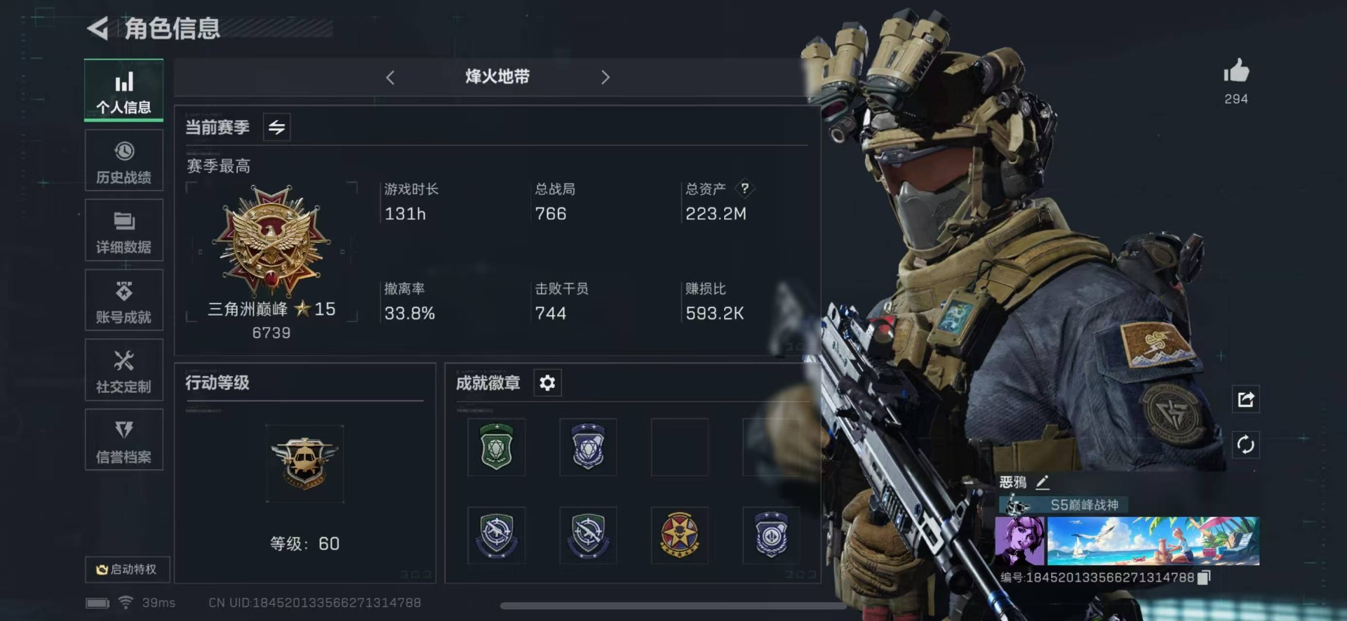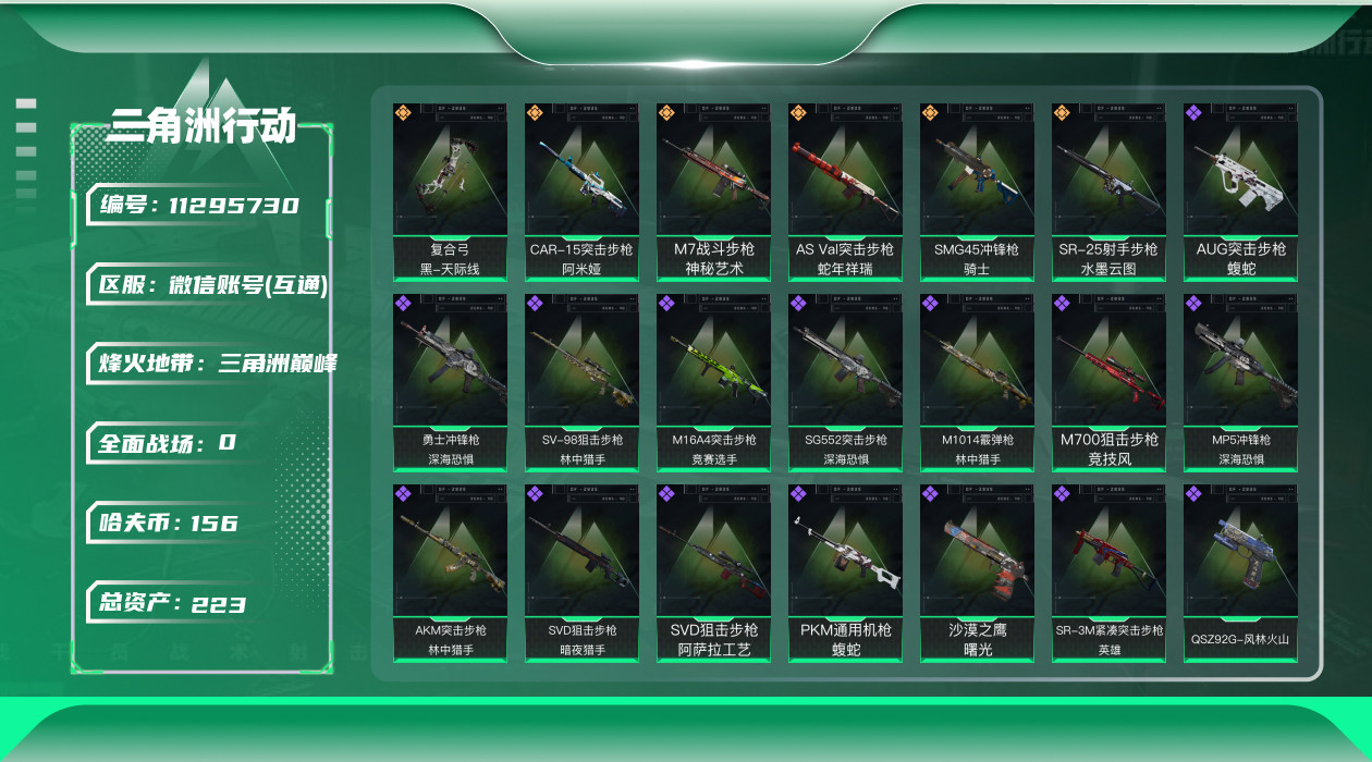 [11295730]总资产:223.2 1干员外观 6传说枪械 进阶安全箱(2×2)9.15号到期 可二次 可修改实名 烽火地带段位:三角洲巅峰 全面战场段位:军士长 哈夫币:156 传说武器皮肤:AS Val突击步枪-蛇年祥瑞,SR-25射手步枪-水墨云图,SMG45冲锋枪-骑士,复合弓-黑-天际线,CAR-15突击步枪-阿米娅,M7战斗步枪-神秘艺术 史诗武器皮肤:SR-3M紧凑突击步枪-英雄,AUG突击步枪-蝮蛇,PKM通用机枪-蝮蛇,G3战斗步枪-战场英杰,MP5冲锋枪-深海恐惧,勇士冲锋枪-深海恐惧,SG552突击步枪-深海恐惧,AKM突击步枪-林中猎手,SVD狙击步枪-暗夜猎手,M16A4突击步枪-竞赛选手,M1014霰弹枪-林中猎手,SV-98狙击步枪-林中猎手,沙漠之鹰-曙光,SVD狙击步枪-阿萨拉工艺,S12K霰弹枪-曙光,AS Val突击步枪-刀锋,M700狙击步枪-竞技风,QSZ92G-风林火山,93R-博士 干员外观:露娜-黑·天际线