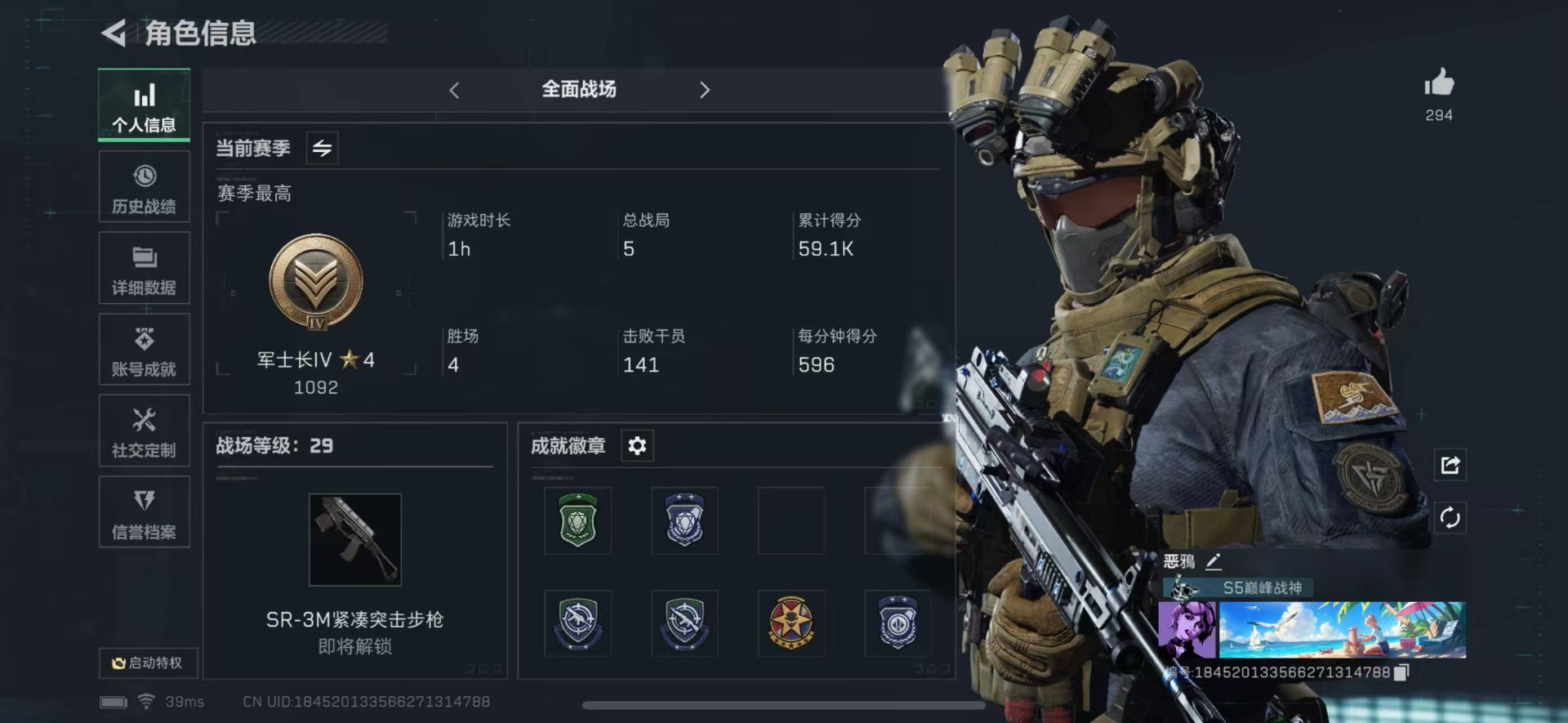 - [11650331]总资产:8.7M 1干员外观 4传说枪械 哈夫币:3.628K 可二次 可修改实名 烽火地带段位:铂金 全面战场段位:无段位 传说武器皮肤:SMG45冲锋枪-骑士,勇士冲锋枪-能天使-午夜邮差,复合弓-黑-天际线,M4A1突击步枪-蚀金玫瑰 干员外观:红狼-蚀金玫瑰