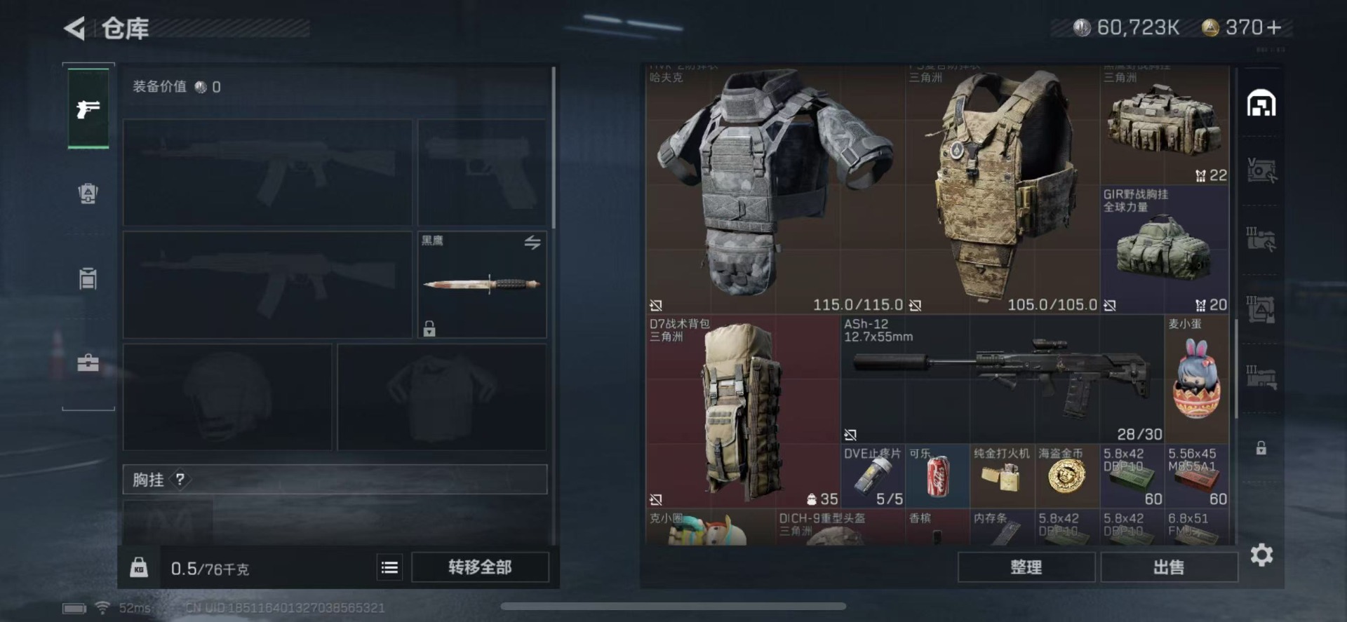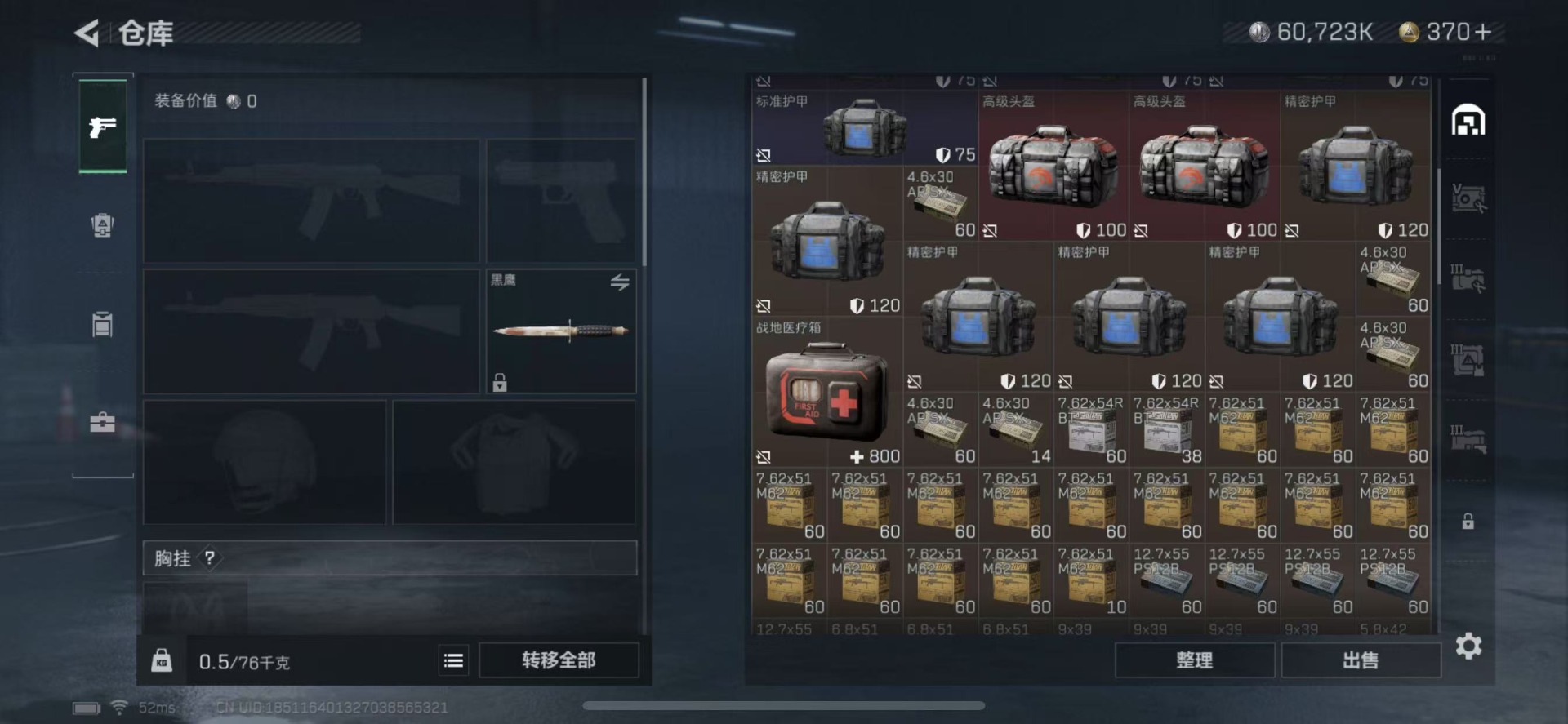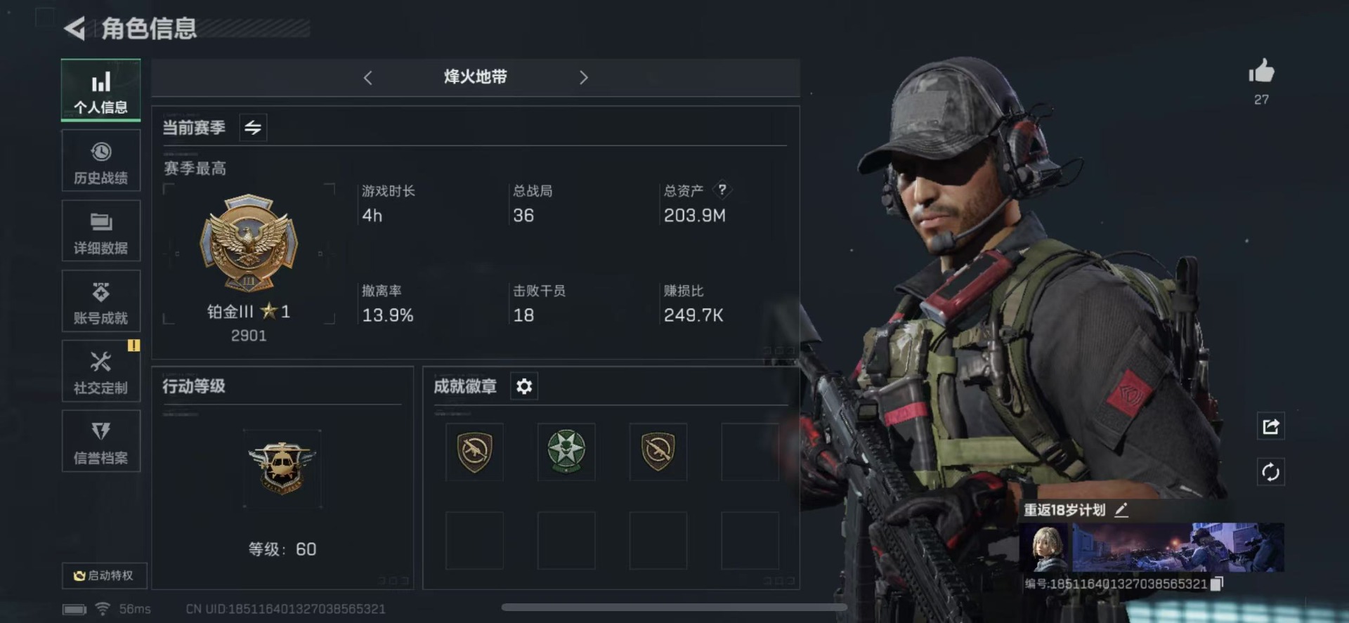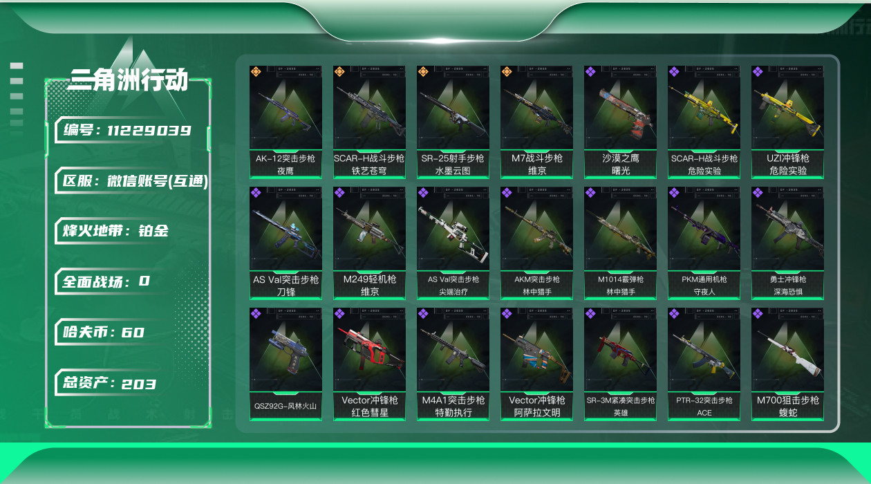 [11229039]总资产:203.9 4传说枪械 可二次 可修改实名 烽火地带段位:铂金 全面战场段位:列兵 哈夫币:60.723 传说武器皮肤:SR-25射手步枪-水墨云图,SCAR-H战斗步枪-铁艺苍穹,AK-12突击步枪-夜鹰,M7战斗步枪-维京 史诗武器皮肤:SR-3M紧凑突击步枪-英雄,QBZ95-1突击步枪-ACE,M4A1突击步枪-特勤执行,AUG突击步枪-特勤执行,Vector冲锋枪-红色彗星,PTR-32战斗步枪-ACE,SKS射手步枪-ACE,M700狙击步枪-蝮蛇,G3战斗步枪-战场英杰,SR-25射手步枪-尖端治疗,AS Val突击步枪-尖端治疗,M700狙击步枪-守夜人,SG552突击步枪-尖端治疗,Ash-12战斗步枪-守夜人,勇士冲锋枪-深海恐惧,AKM突击步枪-林中猎手,M16A4突击步枪-竞赛选手,PKM通用机枪-守夜人,M1014霰弹枪-林中猎手,SCAR-H战斗步枪-囚徒,QBZ95-1突击步枪-曙光,UZI冲锋枪-危险实验,M249轻机枪-维京,SCAR-H战斗步枪-危险实验,沙漠之鹰-曙光,Vector冲锋枪-阿萨拉文明,SVD狙击步枪-阿萨拉工艺,AS Val突击步枪-刀锋,QSZ92G-风林火山,93R-博士