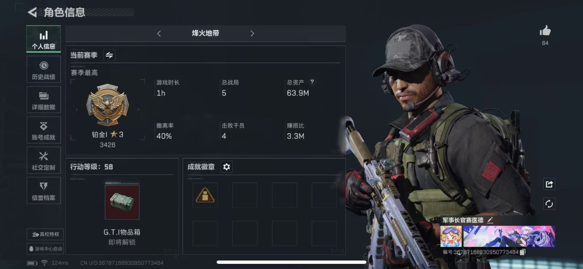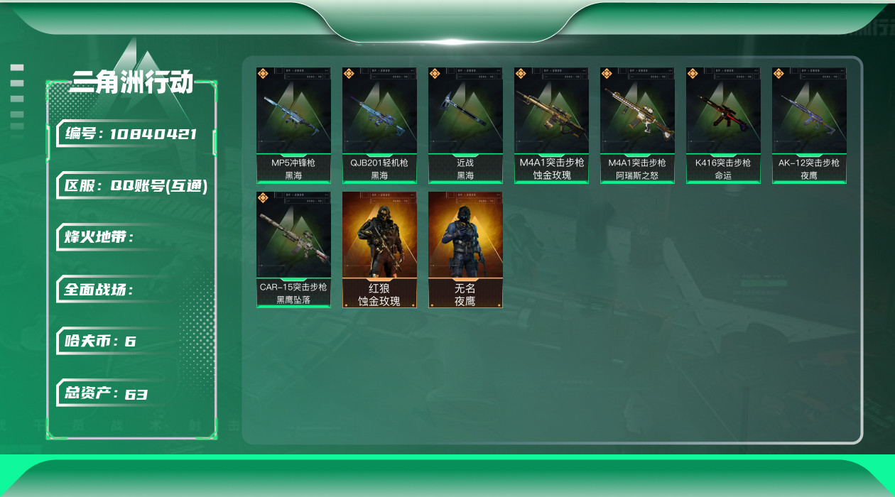 - [11682149]总资产:104.7M 哈夫币:27.966K 可二次 可修改实名 烽火地带段位:无段位 全面战场段位:无段位