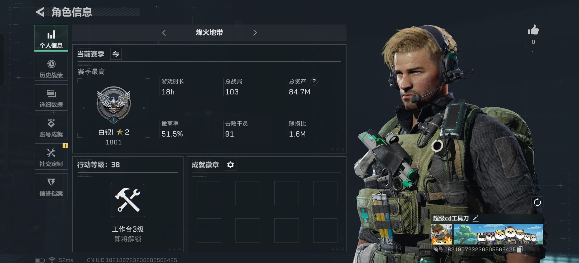 [11235300]总资产:84.7 可二次 可修改实名 烽火地带段位:白银 全面战场段位:无段位 哈夫币:51.088 史诗武器皮肤:SV-98狙击步枪-林中猎手,SV-98狙击步枪-囚徒,SCAR-H战斗步枪-囚徒