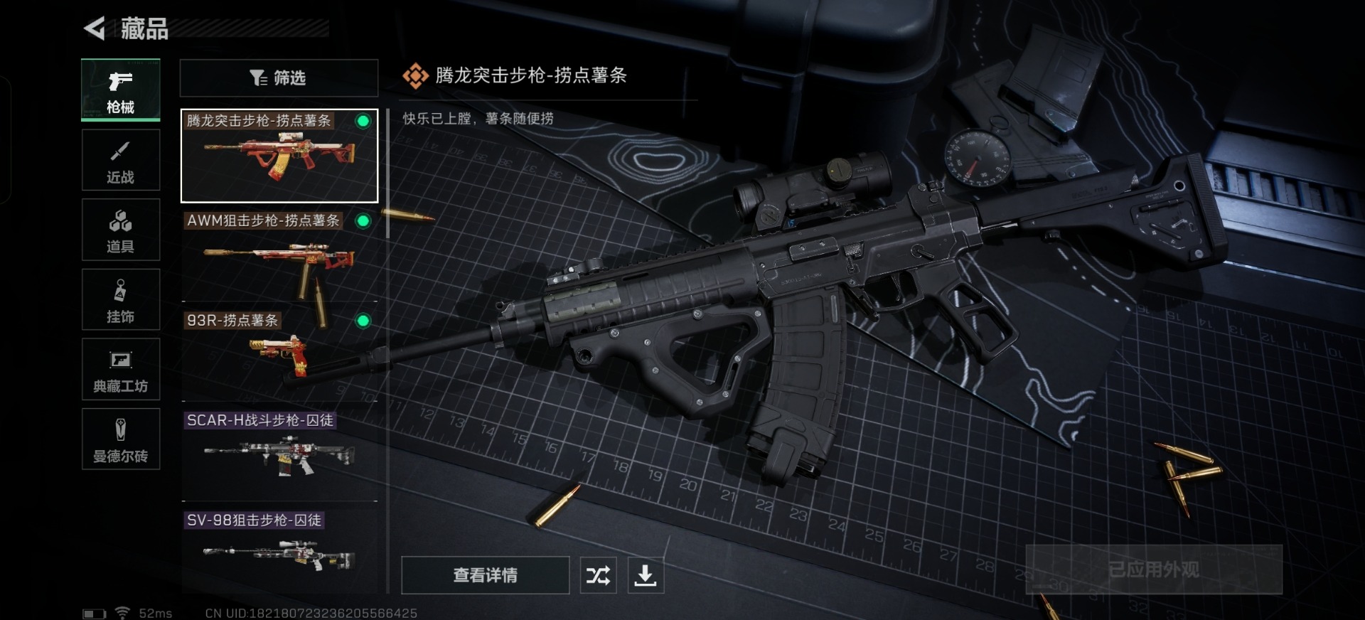 - [11526986]总资产:185M 8传说枪械 哈夫币:78.774K 高级安全箱(2×3)9.15号到期 可二次 可修改实名 烽火地带段位:三角洲巅峰 全面战场段位:无段位 传说武器皮肤:M4A1突击步枪-阿米娅,复合弓-黑-天际线,AWM狙击步枪-捞点薯条,腾龙突击步枪-捞点薯条,93R-捞点薯条,勇士冲锋枪-能天使-午夜邮差,725双管霰弹枪-送葬人-无题密令,M4A1突击步枪-蚀金玫瑰 史诗武器皮肤:M700狙击步枪-蝮蛇,PKM通用机枪-蝮蛇,M16A4突击步枪-竞赛选手,PKM通用机枪-荒野求生,SR-3M紧凑突击步枪-荒野求生,SV-98狙击步枪-林中猎手,SVD狙击步枪-荒野求生,AS Val突击步枪-典狱官,M250通用机枪-囚徒,SCAR-H战斗步枪-囚徒,腾龙突击步枪-无垢,MP7冲锋枪-无垢,PSG-1射手步枪-无垢
