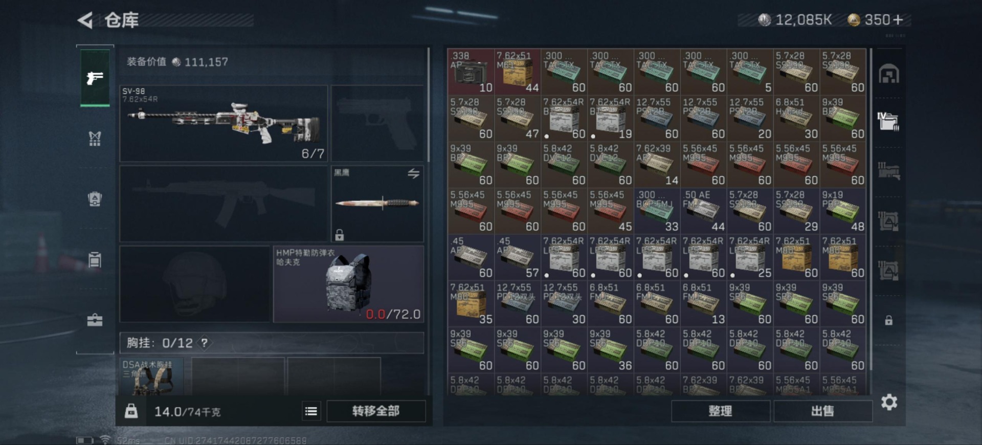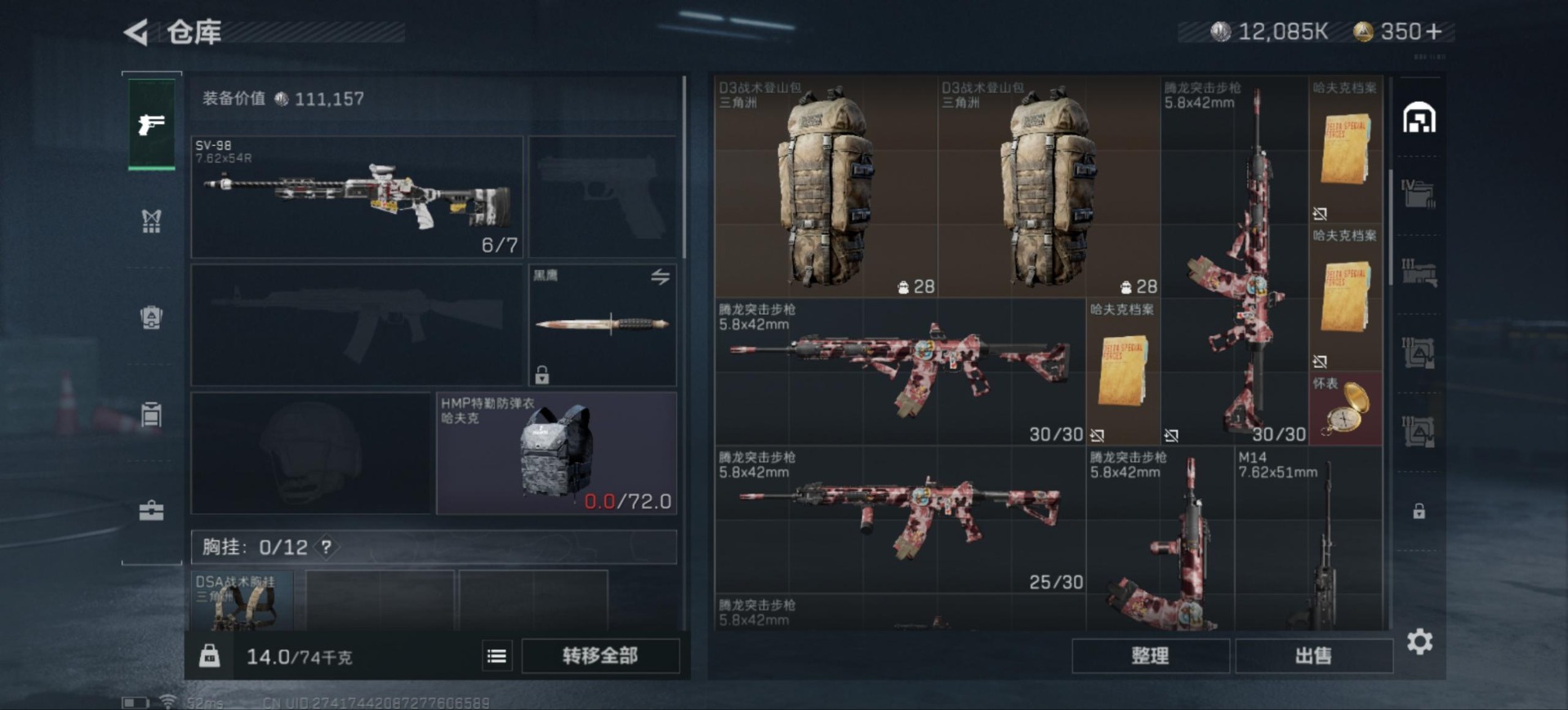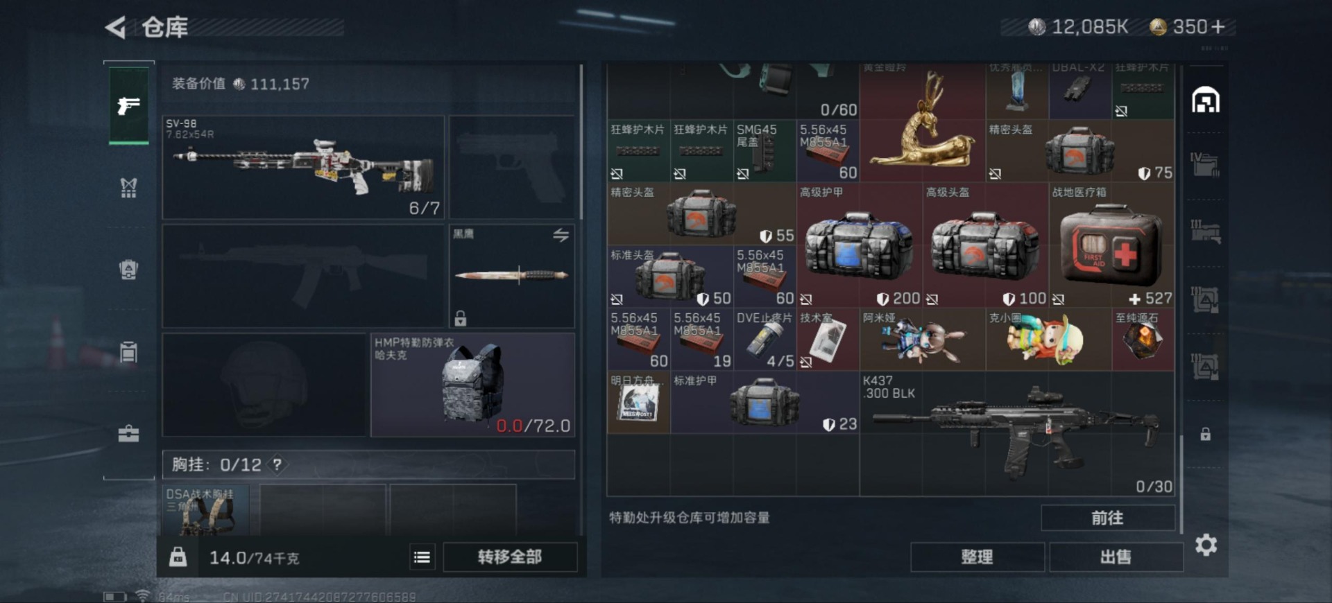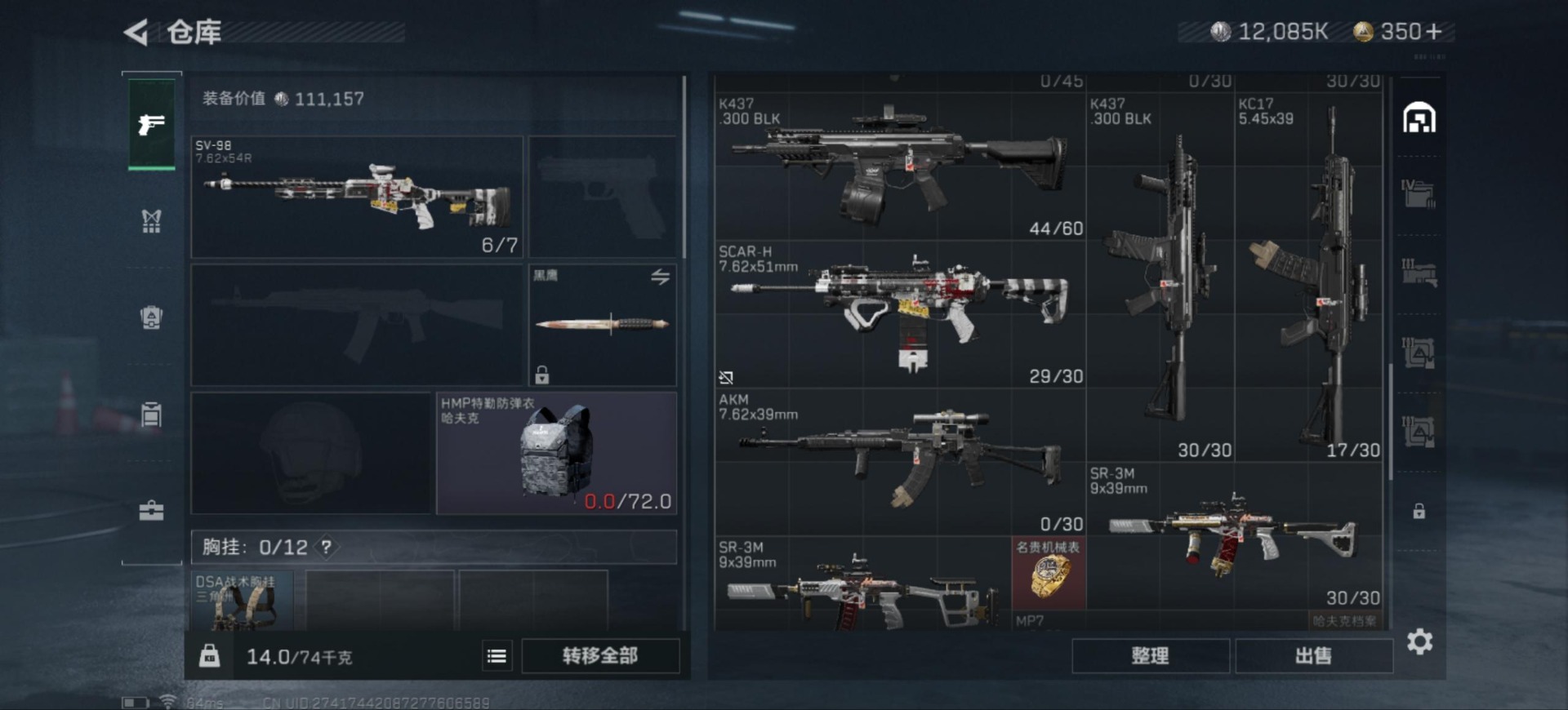 [11229487]总资产:70.7M 7传说枪械 哈夫币:12.085K 可二次 可修改实名 烽火地带段位:钻石 全面战场段位:无段位 传说武器皮肤:QJB201轻机枪-风林火山,M4A1突击步枪-阿米娅,复合弓-黑-天际线,AK-12突击步枪-特斯拉线圈,SR-3M紧凑突击步枪-特斯拉线圈,UZI冲锋枪-特斯拉线圈,勇士冲锋枪-能天使-午夜邮差