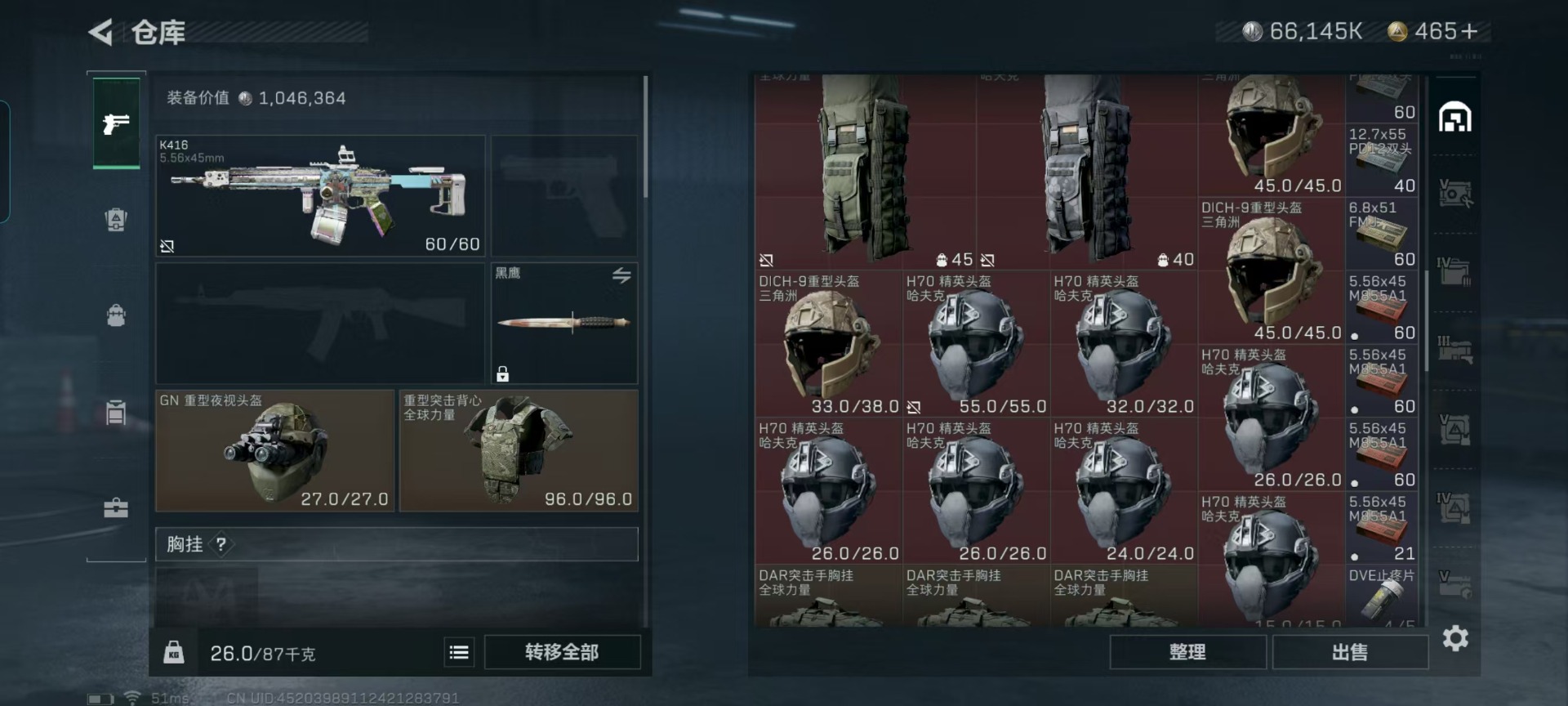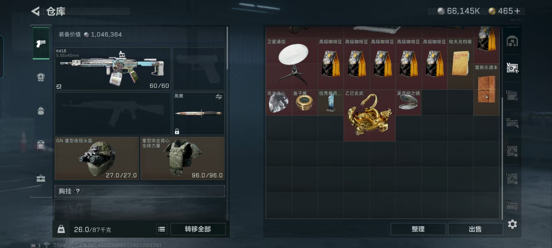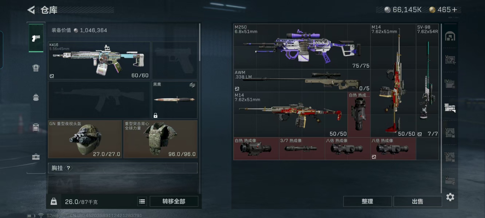 [11238462]总资产:287.5M 6传说枪械 哈夫币:66.145K 可二次 可修改实名 优质装备:K416突击步枪-命运(典藏),SCAR-H战斗步枪-电玩高手 烽火地带段位:钻石 全面战场段位:无段位 传说武器皮肤:SR-25射手步枪-水墨云图,SCAR-H战斗步枪-铁艺苍穹,AK-12突击步枪-夜鹰,SMG45冲锋枪-骑士