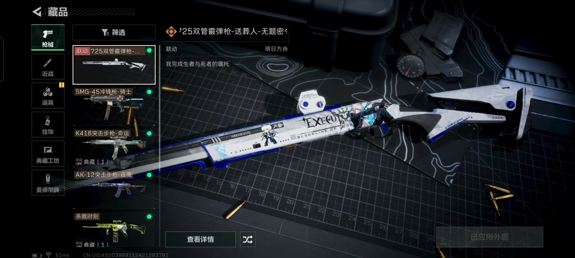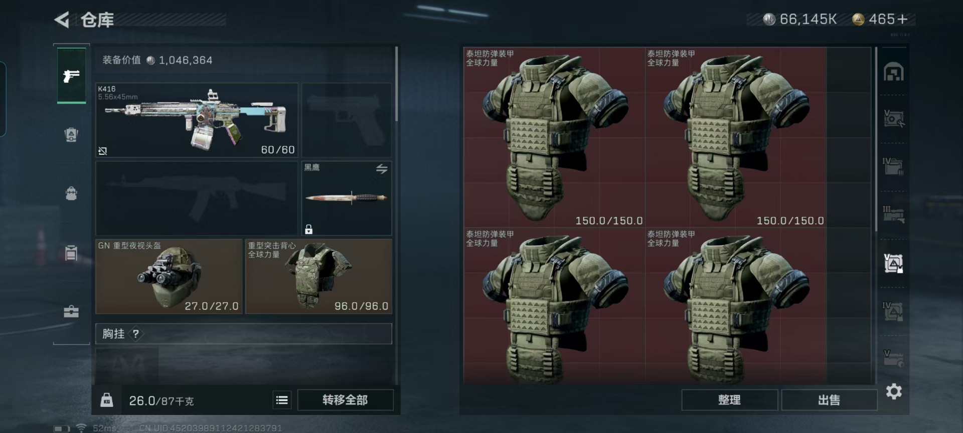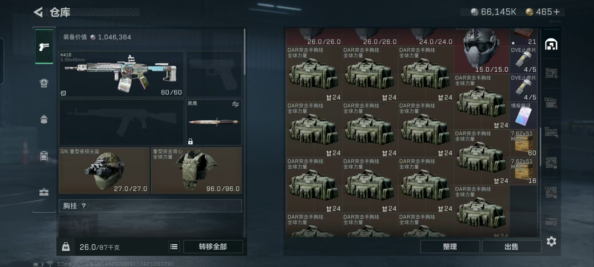 [11238462]总资产:287.5M 6传说枪械 哈夫币:66.145K 可二次 可修改实名 优质装备:K416突击步枪-命运(典藏),SCAR-H战斗步枪-电玩高手 烽火地带段位:钻石 全面战场段位:无段位 传说武器皮肤:SR-25射手步枪-水墨云图,SCAR-H战斗步枪-铁艺苍穹,AK-12突击步枪-夜鹰,SMG45冲锋枪-骑士