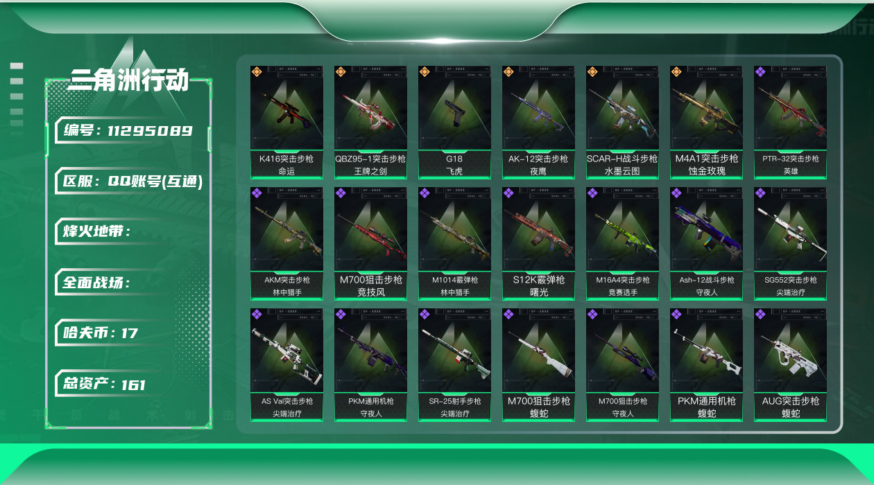 [11295089]可二次 可修改实名 实名:可修改 高级安全箱(2×3)9.1号到期 总资产(M):161.6 哈夫币:17.618 传说武器皮肤:K416突击步枪-命运(典藏),QBZ95-1突击步枪-王牌之剑(典藏),SCAR-H战斗步枪-水墨云图,AK-12突击步枪-夜鹰,G18-飞虎,M4A1突击步枪-蚀金玫瑰 史诗武器皮肤:G3战斗步枪-战场英杰,PKM通用机枪-蝮蛇,M700狙击步枪-蝮蛇,AUG突击步枪-蝮蛇,M700狙击步枪-守夜人,SG552突击步枪-尖端治疗,Ash-12战斗步枪-守夜人,SR-25射手步枪-尖端治疗,AKM突击步枪-林中猎手,AS Val突击步枪-尖端治疗,PKM通用机枪-守夜人,M1014霰弹枪-林中猎手,PTR-32突击步枪-英雄,S12K霰弹枪-曙光,PKM通用机枪-英雄,M700狙击步枪-竞技风,M16A4突击步枪-竞赛选手 干员外观:红狼-蚀金玫瑰,骇爪-水墨云图,无名-夜鹰,威龙-飞虎