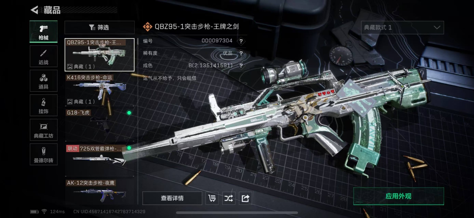 [11295089]总资产:161.6M 4干员外观 6传说枪械 哈夫币:17.618K 可二次 可修改实名 优质装备:K416突击步枪-命运(典藏),QBZ95-1突击步枪-王牌之剑(典藏) 烽火地带段位:铂金 全面战场段位:无段位 传说武器皮肤:SCAR-H战斗步枪-水墨云图,G18-飞虎,AK-12突击步枪-夜鹰,M4A1突击步枪-蚀金玫瑰 史诗武器皮肤:AUG突击步枪-蝮蛇,M700狙击步枪-蝮蛇,PKM通用机枪-蝮蛇,G3战斗步枪-战场英杰,Ash-12战斗步枪-守夜人,M16A4突击步枪-竞赛选手,PKM通用机枪-守夜人,AS Val突击步枪-尖端治疗,M700狙击步枪-守夜人,SG552突击步枪-尖端治疗,SR-25射手步枪-尖端治疗,M1014霰弹枪-林中猎手,AKM突击步枪-林中猎手,PTR-32突击步枪-英雄,S12K霰弹枪-曙光,PKM通用机枪-英雄,M700狙击步枪-竞技风 干员外观:红狼-蚀金玫瑰,骇爪-水墨云图,无名-夜鹰,威龙-飞虎
