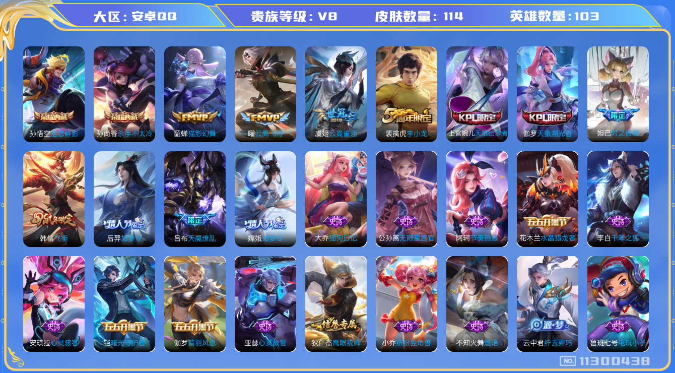 [11300438]V8 2典藏 5传说 103英雄 114皮肤 可修改实名 优质装备:杀手不太冷,全息碎影(猴子典藏),云鹰飞将(小将军),猫影幻舞,云霓雀翎 限定皮:时之彼端,飞衡(韩信年限),天狼溯光者,天狼绘梦者,李小龙,如梦令-嫦娥,如梦令-后羿,天魔缭乱 史诗皮:遇见神鹿,紫霞仙子,电玩小子(小书包),黄金分割率,千年之狐,偶像歌手,魅语,无限星赏官,晚萤,猫狗日记-大乔,节奏热浪,修罗,女仆咖啡,天才门将,心灵骇客,心灵战警,纤云弄巧,繁星吟游(呼啦呼啦),拒霜思,缤纷独角兽,水晶猎龙者,曙光守护者,箭羽风息,金属风暴,鹰眼统帅,魅力维加斯