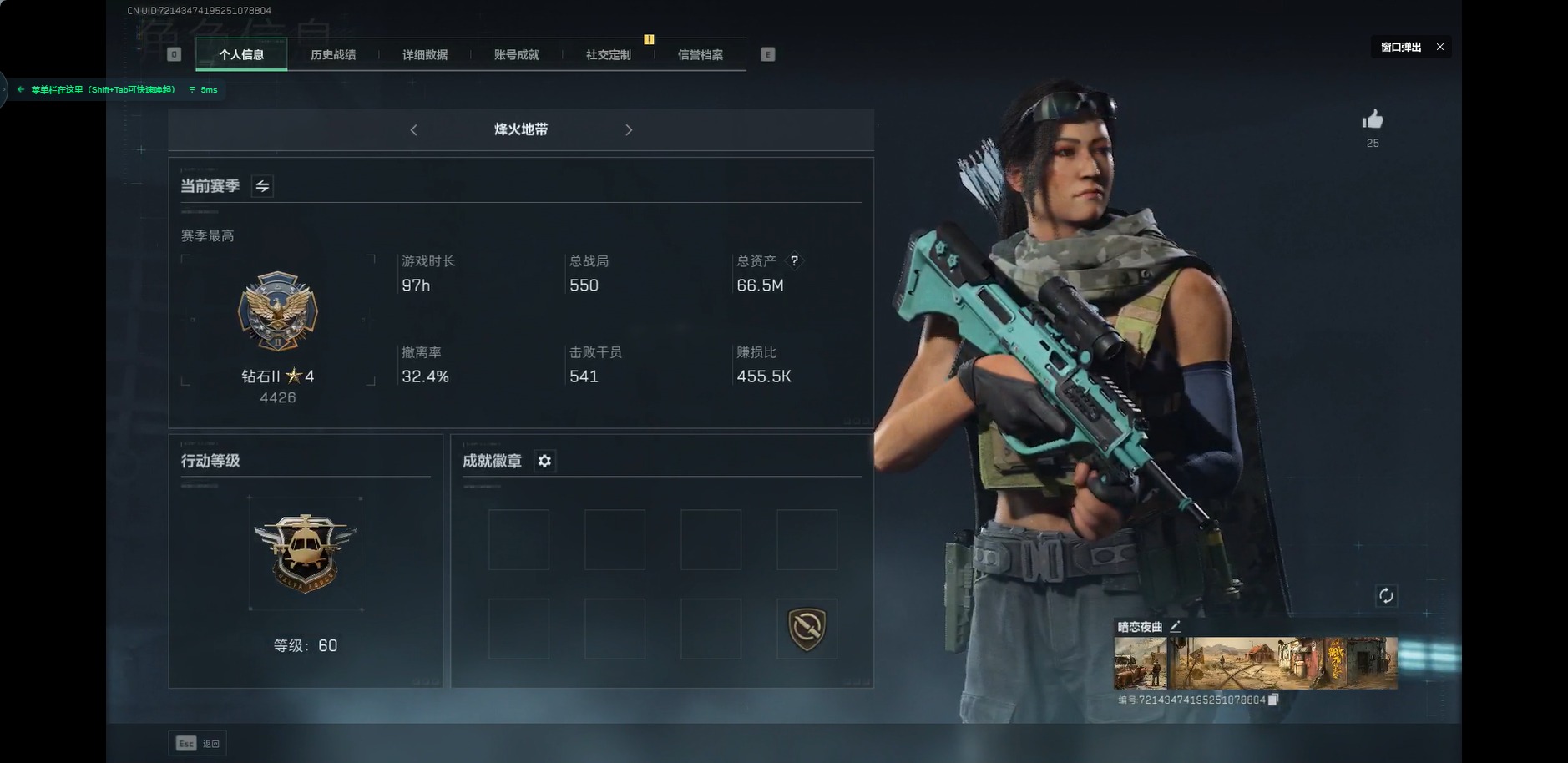 [11253941]总资产:66.5M 10传说枪械 哈夫币:41.148K 可二次 可修改实名 烽火地带段位:钻石 全面战场段位:无段位 传说武器皮肤:M4A1突击步枪-阿米娅,CAR-15突击步枪-阿米娅,复合弓-黑-天际线,AWM狙击步枪-捞点薯条,腾龙突击步枪-捞点薯条,93R-捞点薯条,AK-12突击步枪-特斯拉线圈,SR-3M紧凑突击步枪-特斯拉线圈,UZI冲锋枪-特斯拉线圈,勇士冲锋枪-能天使-午夜邮差 史诗武器皮肤:M700狙击步枪-蝮蛇,M16A4突击步枪-竞赛选手,SV-98狙击步枪-林中猎手,SV-98狙击步枪-囚徒,M700狙击步枪-竞技风