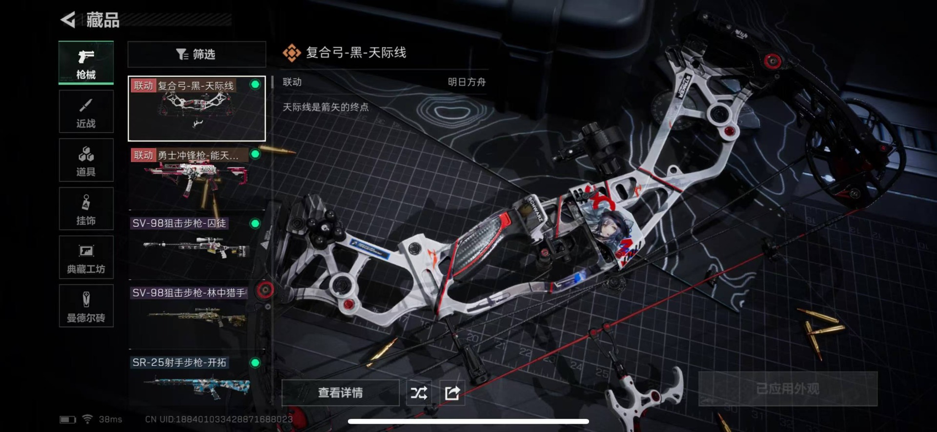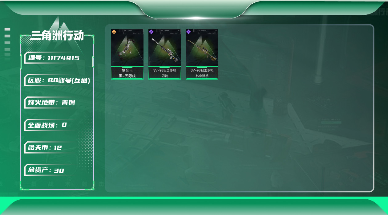 [11174915]总资产:30.5 1传说枪械 可二次 可修改实名 烽火地带段位:青铜 全面战场段位:无段位 哈夫币:12.124 传说武器皮肤:复合弓-黑-天际线 史诗武器皮肤:SV-98狙击步枪-林中猎手,SV-98狙击步枪-囚徒