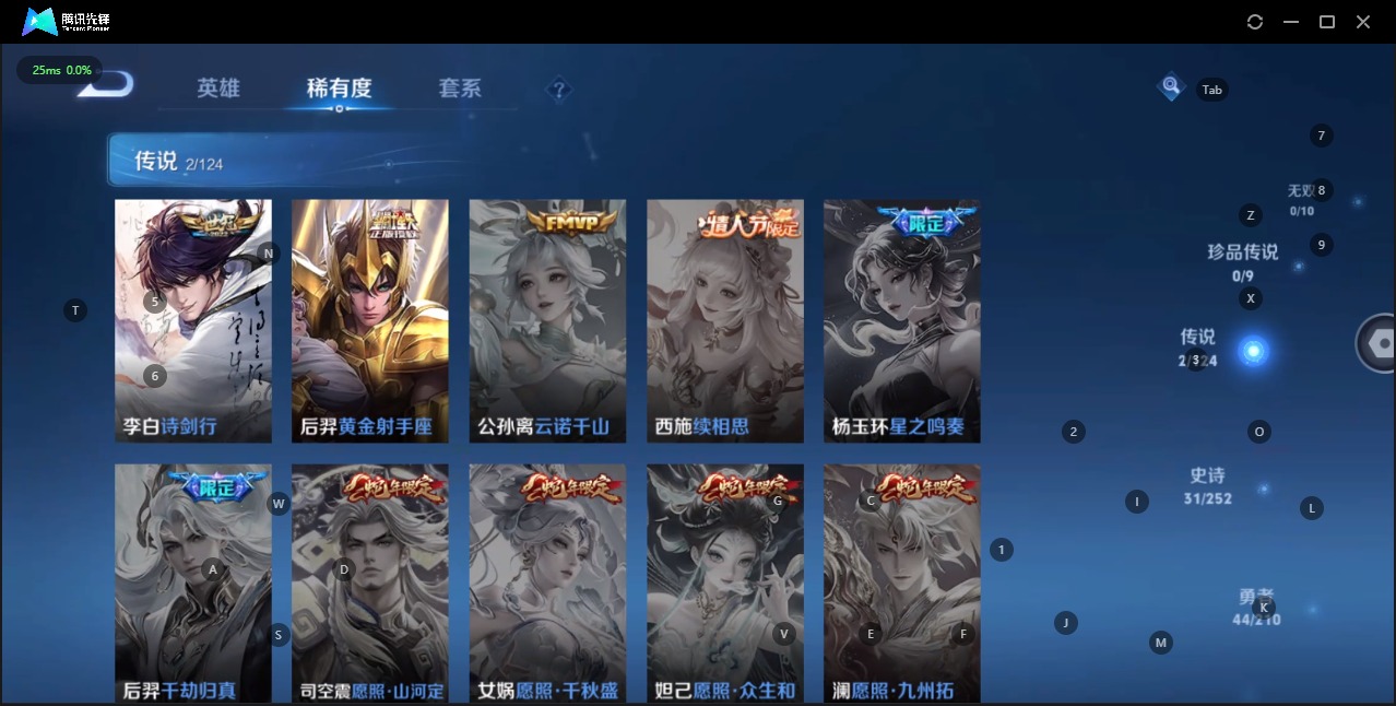 - PX_2099941-71 安卓QQ/至圣王者/274皮肤/123英雄/1典藏/0珍品无双/0无双/1珍品传说/25传说/78史诗/7稀有英雄 【1 珍品传说】朽木白哉 暃, 【1 典藏皮肤】鸣剑·曳影 李白, 【25 传说皮肤】枫霜尽 橘右京,启明星使 虞姬,云霓雀翎 虞姬,前尘镜 娜可露露,逐花归海 澜,李逍遥 曜,零号·赤焰 孙悟空,云鹰飞将 曜,凤求凰 李白,诗剑行 李白,浮生妄 夏洛特