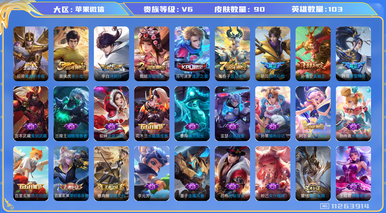 [11263914]V6 2传说 103英雄 90皮肤 可修改实名 永久社交限制 传说皮:黄金射手座 珍宝阁皮:蔷薇恋人 限定皮:傲雪梅枪,诗剑行,五谷丰年,游园惊梦,逐梦之星,李小龙,美猴王,百木心枪 史诗皮:江河有灵,蒙恬荣光圣徽,偶像歌手,猫狗日记-孙策,修罗,女仆咖啡,水果甜心,暗隐猎兽者,幽灵船长,鬼剑武藏,心灵战警,逐浪之夏,水晶猎龙者,热力回旋,金属风暴,原初追逐者,圣诞狂欢,圣诞恋歌,黎明之约,无心