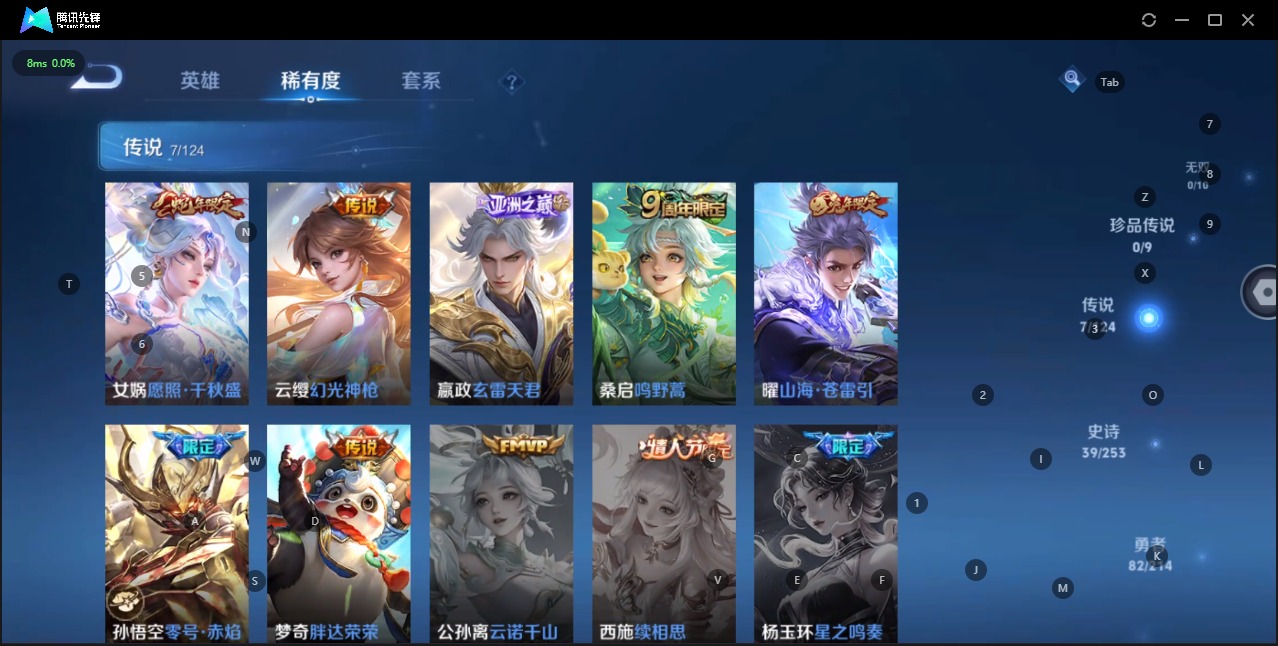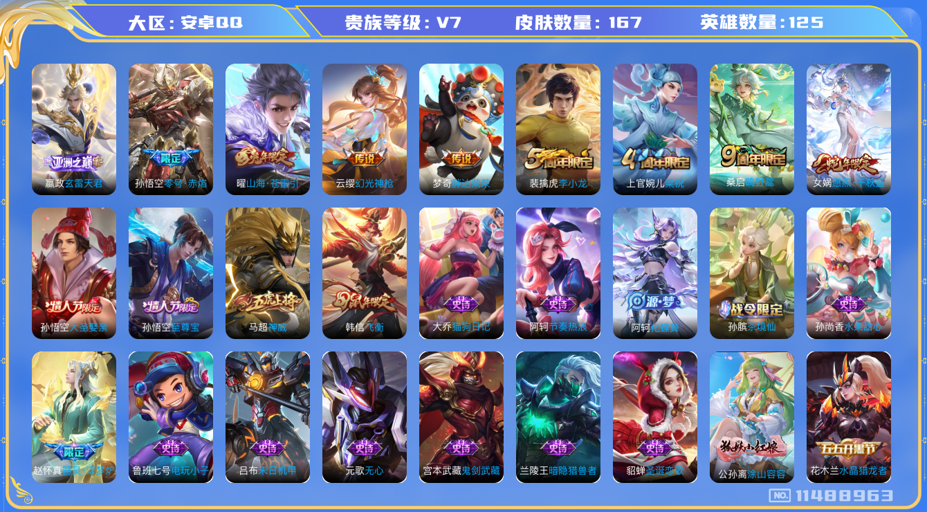 - [11608937]V7 1典藏 7传说 125英雄 291皮肤 可修改实名 优质装备:神鉴启示录,炽阳神光,浮生妄,霜月吟,澜逐花归海 传说皮:落雪白狼 珍宝阁皮:妄想食味,优雅恋人,蔷薇恋人 限定皮:愿照·千秋盛(女娲年限),陌上桑,鸣野蒿,至尊宝,傲雪梅枪,遇见飞天,五谷丰年,龙胆,李小龙,猪悟能,引擎之心,美猴王 史诗皮:器灵·浮梦炉,星界战将,撼地雄心,破空之剑,战舞者,东方月初,埋骨钱,芈月浮光幕影,决胜骁骑,蔬乡物语(鲁班七号),百相守梦-百里守约,百相守梦-黄忠,特工魅影,千年之狐,江河有灵,匿光侦查者,鹤归松栖(赵怀真),雪夜绮愿(周瑜),真我赫兹(镜),百解令(蒙犽),高渐离燃音魔法,蒙恬荣光圣徽,匿光破解者,偶像歌手,暗夜猫娘,末日机甲-吕布,猫狗日记-孙策,节奏热浪,修罗,女仆咖啡,摇滚巨星,水果甜心,天才门将,星夜王子,心灵骇客,德古拉伯爵,暗隐猎兽者,鬼剑武藏,天秀·启明,纤云弄巧,拒霜思,缤纷独角兽,乘风破浪,逐浪之夏,月团寄思,水晶猎龙者,金属风暴,原初追逐者,圣诞狂欢,鹰眼统帅,魅力维加斯,赏金猎手,无心,未来纪元-赵云