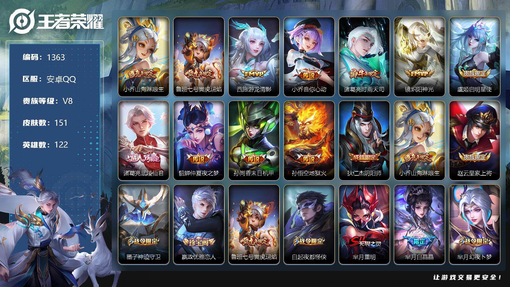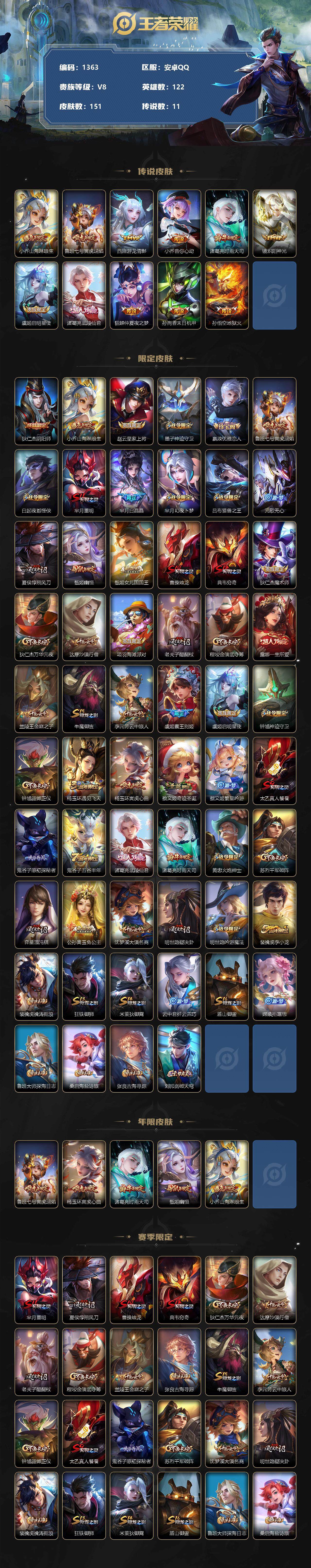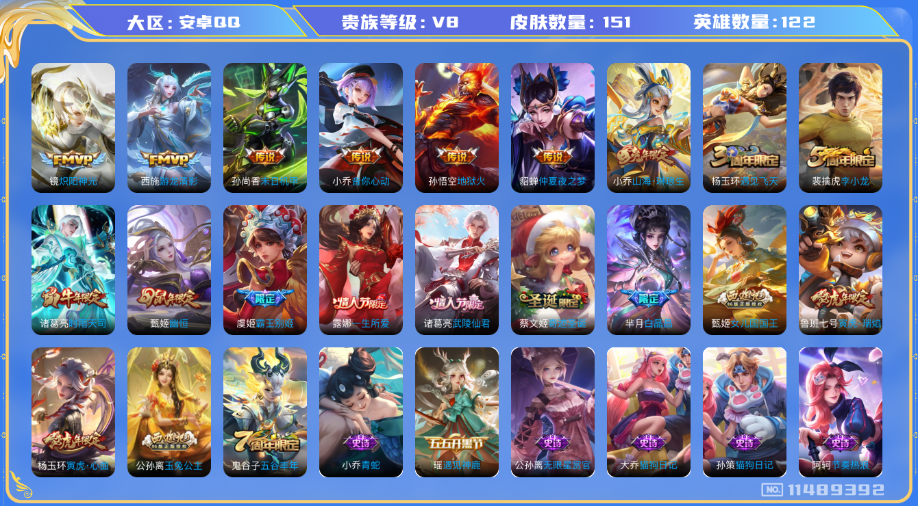 [11489392]【商品标题】:安卓Q-V0-荣耀黄金IV段位-122英雄-151皮肤-0典藏-0珍品无双-0无双-0珍品传说-11传说-46史诗