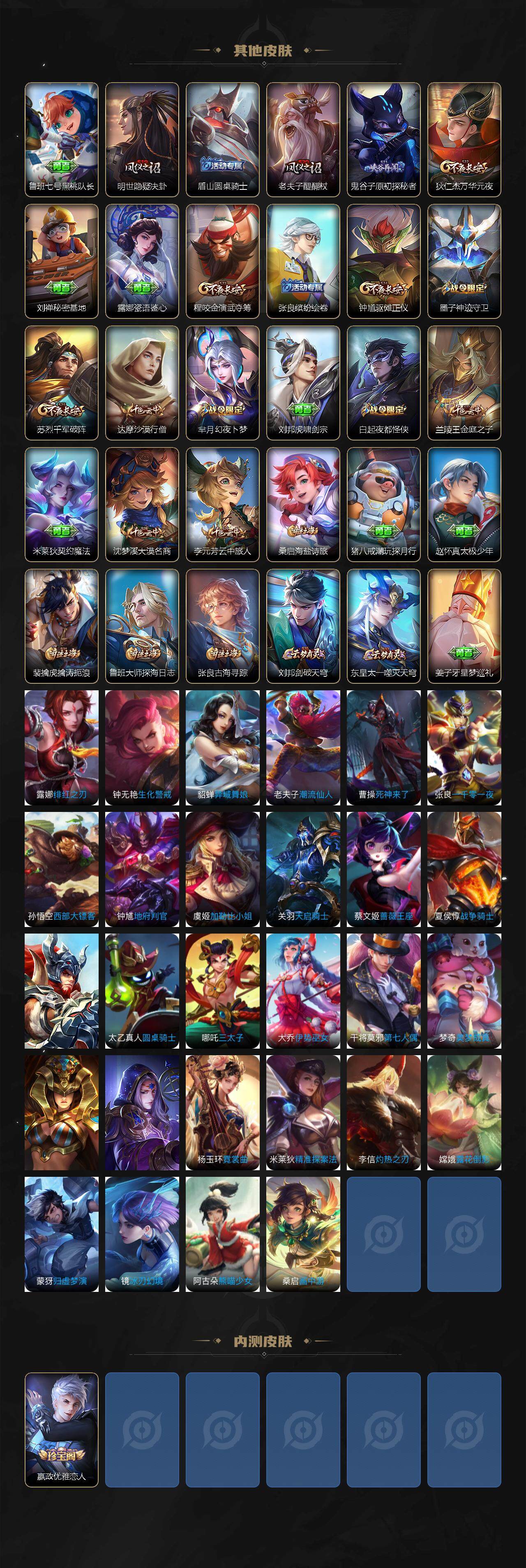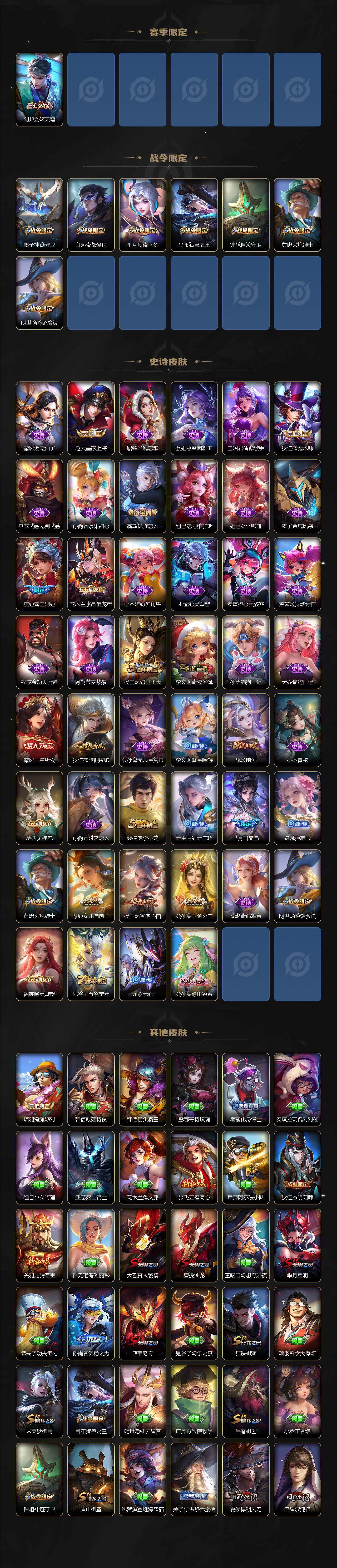 【限定皮肤】:狄仁杰阴阳师,小乔山海琳琅生,赵云皇家上将,墨子神迹守卫,嬴政优雅恋人,鲁班七号寅虎瑞焰,白起夜都怪侠,芈月重明,芈月白晶晶,芈月幻夜卜梦,吕布猎兽之王,元歌无心,夏侯惇朔风刀,甄姬幽恒,甄姬女儿国国王,曹操烛龙,典韦穷奇,狄仁杰魔术师,狄仁杰万华元夜,达摩沙漠行僧,项羽海滩派对,老夫子醍醐杖,程咬金演武夺筹,露娜一生所爱,兰陵王金庭之子,牛魔御旌,李元芳云中旅人,虞姬霸王别姬,虞姬启明星使,钟馗神迹守卫,钟馗驱傩正仪,杨玉环遇见飞天,杨玉环寅虎心曲,蔡文姬奇迹圣诞,蔡文姬繁星吟游,太乙真人饕餮,鬼谷子原初探秘者,鬼谷子五谷丰年,诸葛亮武陵仙君,诸葛亮时雨天司,黄忠火炮绅士,苏烈千军破阵,弈星混沌棋,公孙离玉兔公主,沈梦溪大漠名商,明世隐疑决卦,明世隐吟游魔法,裴擒虎李小龙,裴擒虎擒涛扼浪,狂铁御狮,米莱狄御霄,云中君纤云弄巧,盾山御銮,嫦娥拒霜思,鲁班大师探海日志,桑启海盐诗旅,张良古海寻踪,刘邦剑破天穹