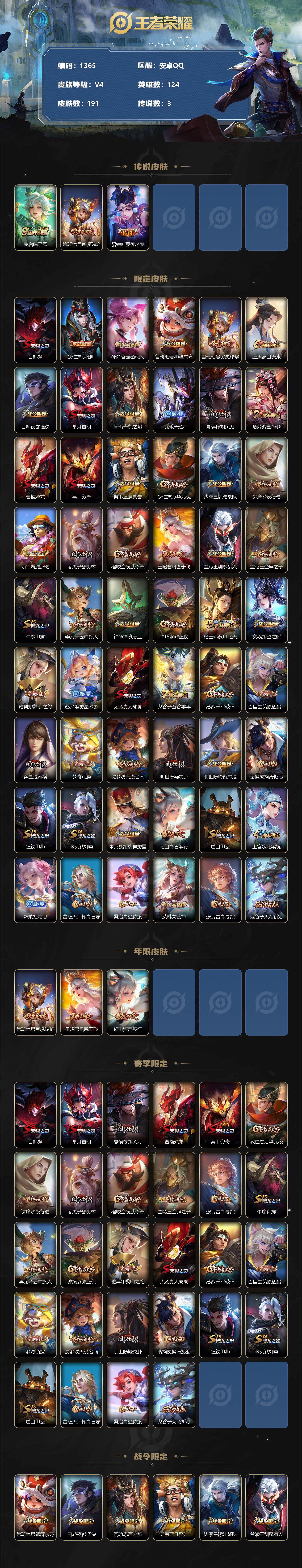 - [11603354]V7 1典藏 1珍品传说 6传说 123英雄 184皮肤 可修改实名 优质装备:鸣剑·曳影,黑崎一护,云鹰飞将(小将军),炽阳神光,末日机甲-孙尚香(绿蚂蚱) 传说皮:幻光神枪 珍宝阁皮:玩趣恶龙 限定皮:愿照·九州拓(澜年限),鸣野蒿,五谷丰年,岱宗(典韦年限),孙行者 史诗皮:鸭鸭历险记-刘禅,器灵·浮梦炉,化蝶舞,星界战将,谪仙醉月,龙之律动,石田雨龙,怒海争锋,破空之剑,蒙犽顽岩魄,芈月浮光幕影,蔬乡物语(鲁班七号),百相守梦-百里守约,百相守梦-黄忠,紫霞仙子,黄金分割率,特工魅影,永昼,江河有灵,百解令(蒙犽),高渐离燃音魔法,冰冠公主,偶像歌手,白蛇,暗夜猫娘,龙骑士(小龙虾),猫狗日记-孙策,时之恋人-孙尚香,乱世虎臣,节奏热浪,水果甜心,天才门将,星夜王子,心灵骇客,德古拉伯爵,暗隐猎兽者,幽灵船长,鬼剑武藏,心灵战警,天秀·启明,地狱岩魂,乘风破浪,逐浪之夏,水晶猎龙者,曙光守护者,箭羽风息,金属风暴,原初追逐者,圣诞恋歌,鹰眼统帅,魅力维加斯,赏金猎手,无心,未来纪元-赵云